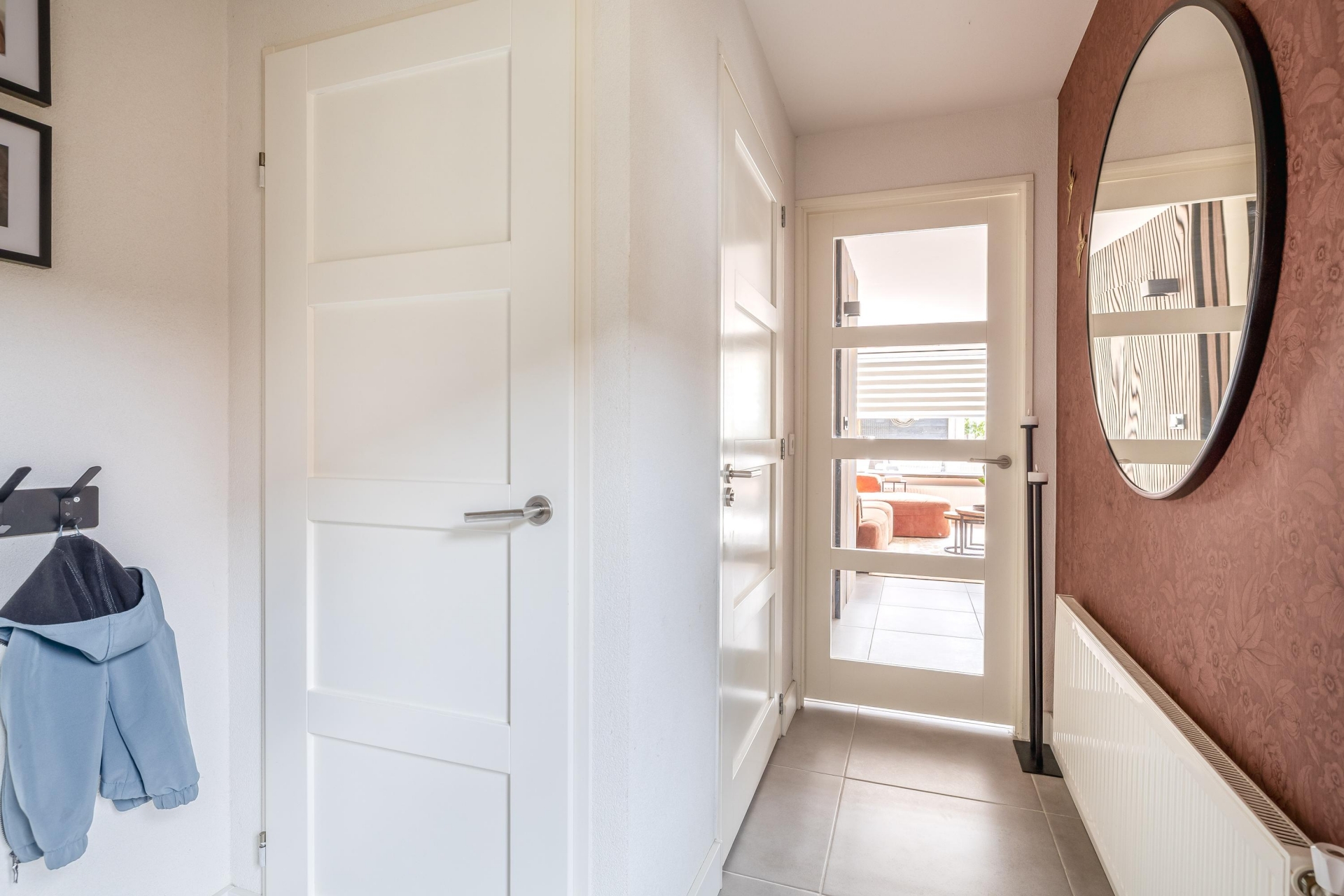 Je komt binnen in de hal met toegang tot het toilet, de trapopgang en de woonkamer. Wat direct opvalt is de nette afwerking en het gevoel van ruimte. De woonkamer is tuingericht en heerlijk licht dankzij de grote raampartijen.