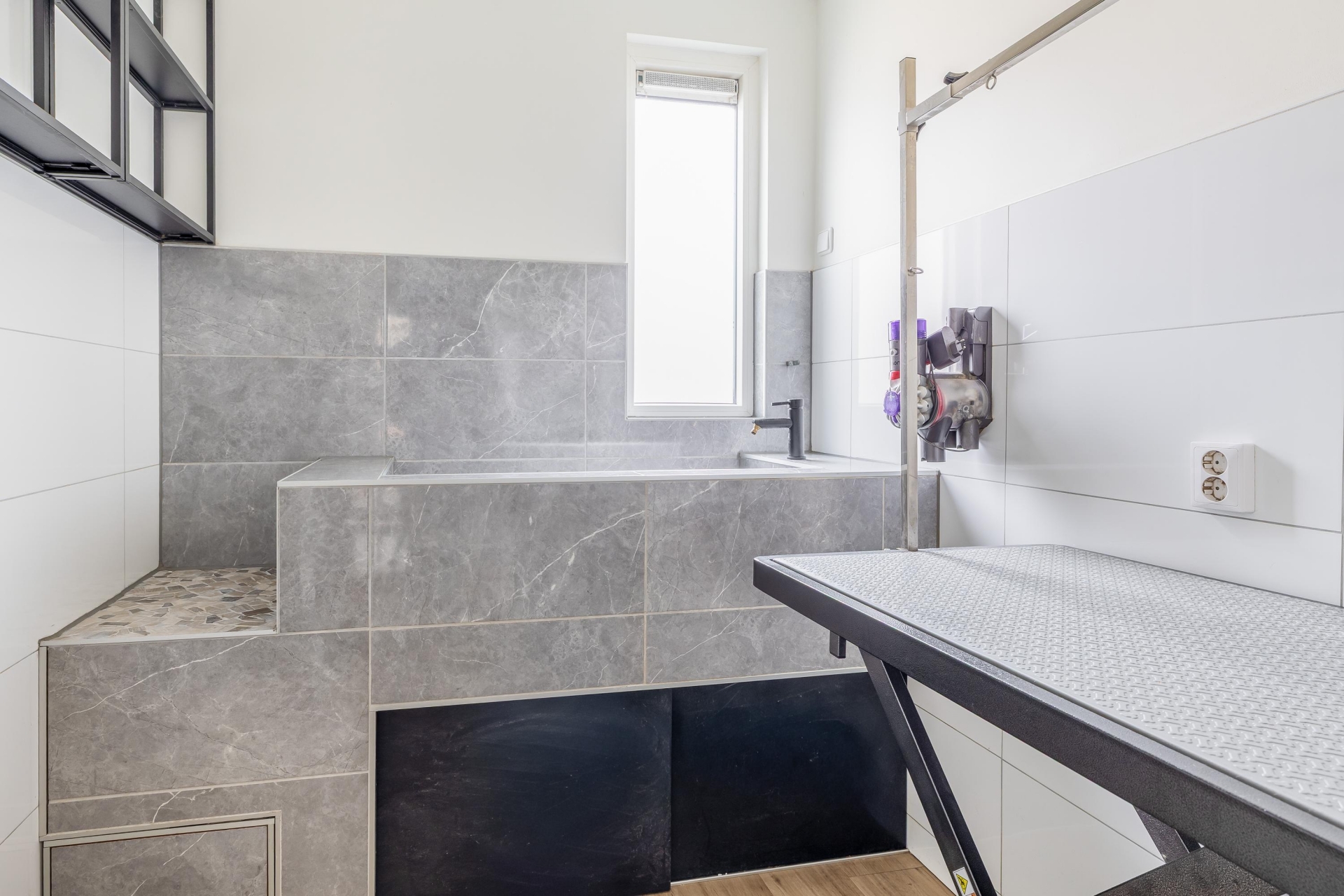 Aan de voorzijde van het huis bevindt zich de voormalige berging, die momenteel in gebruik is als trimsalon. Deze ruimte is multifunctioneel en leent zich perfect voor werken aan huis, een praktijkruimte of extra opslag.