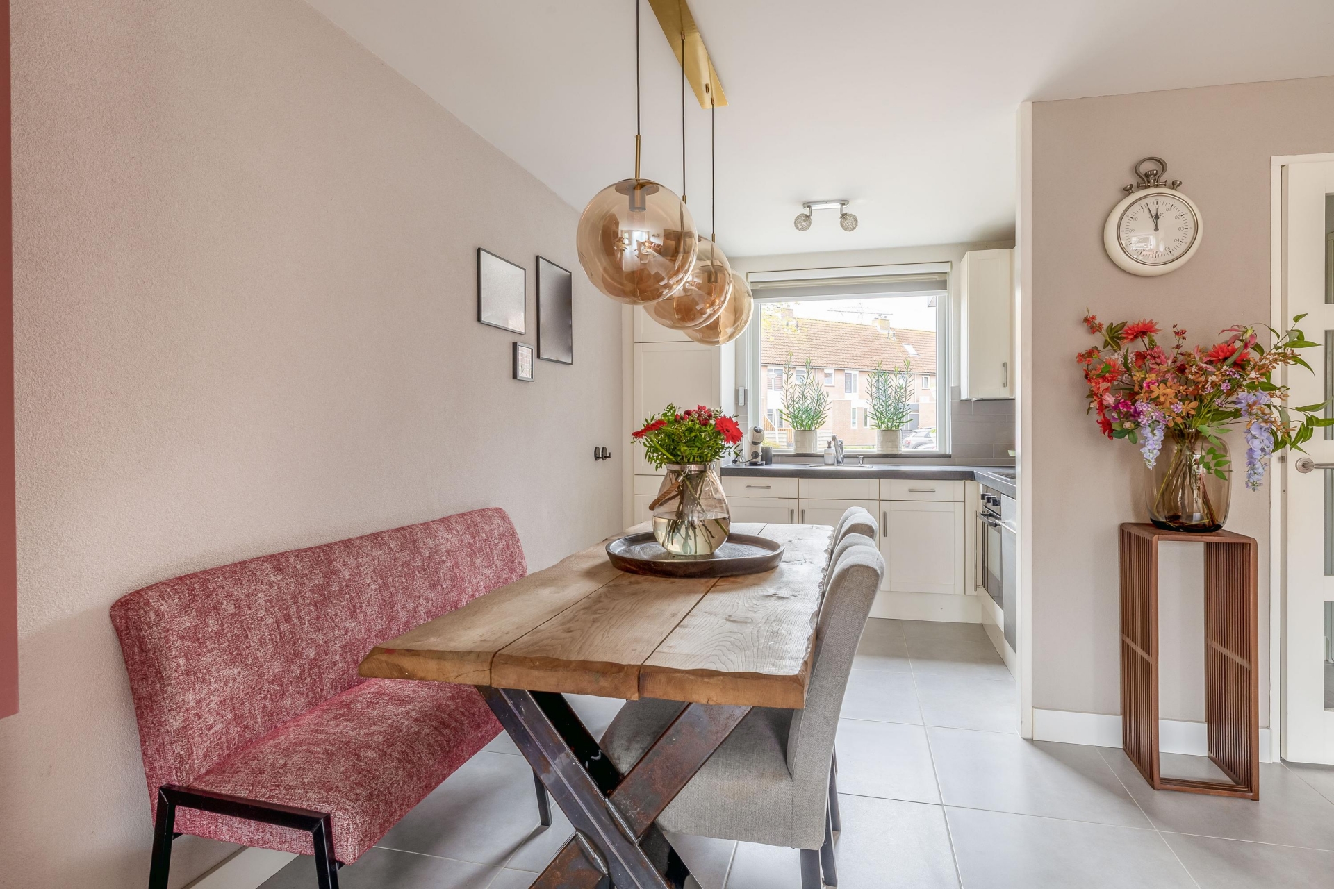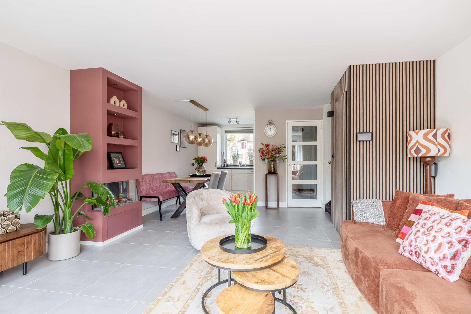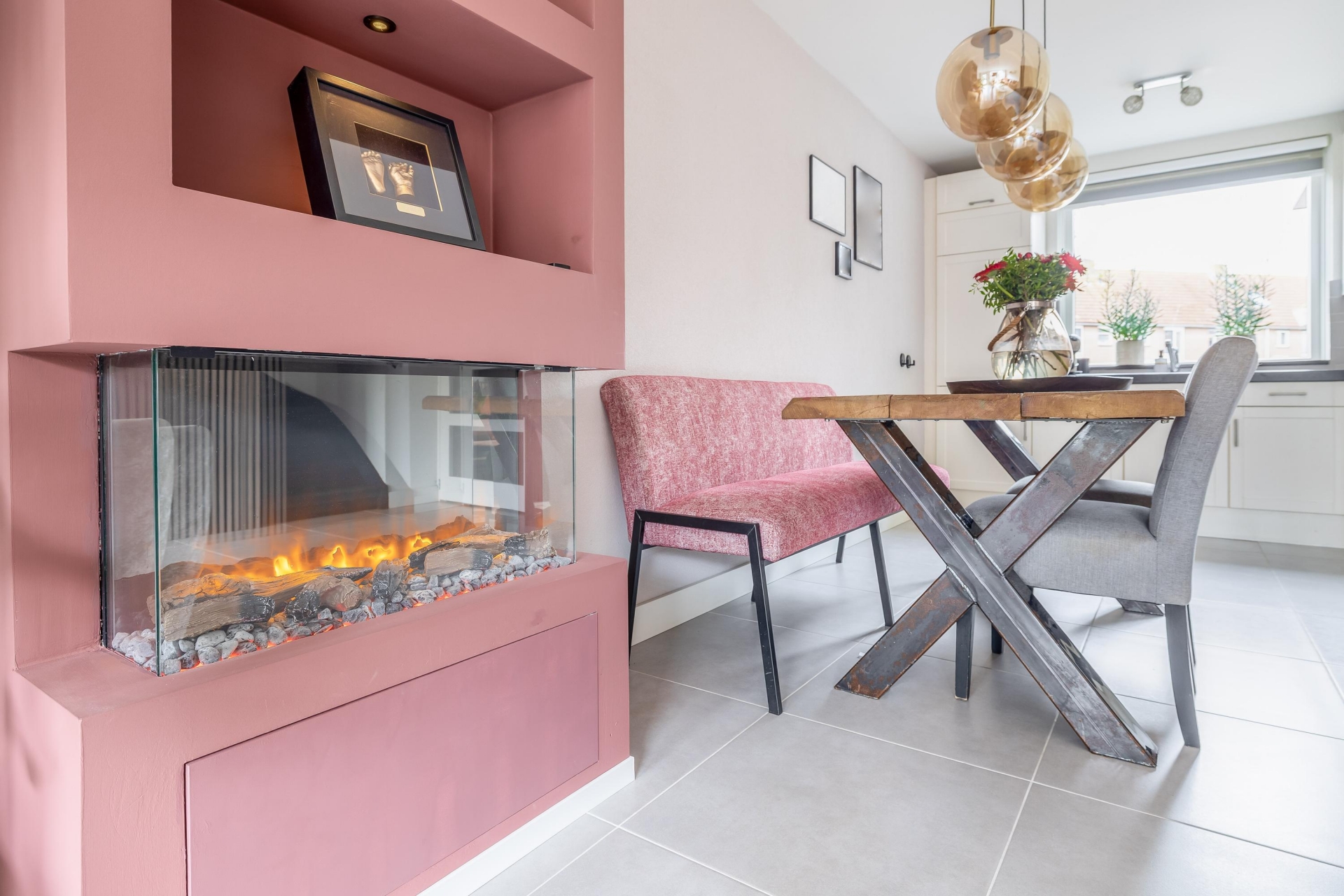 Er is voldoende plek voor een ruime zithoek en een gezellige eethoek. De elektrische haard zorgt voor extra sfeer en maakt deze ruimte echt af. De vloerverwarming in combinatie met de plavuizen vloer zorgt voor een aangenaam wooncomfort.
