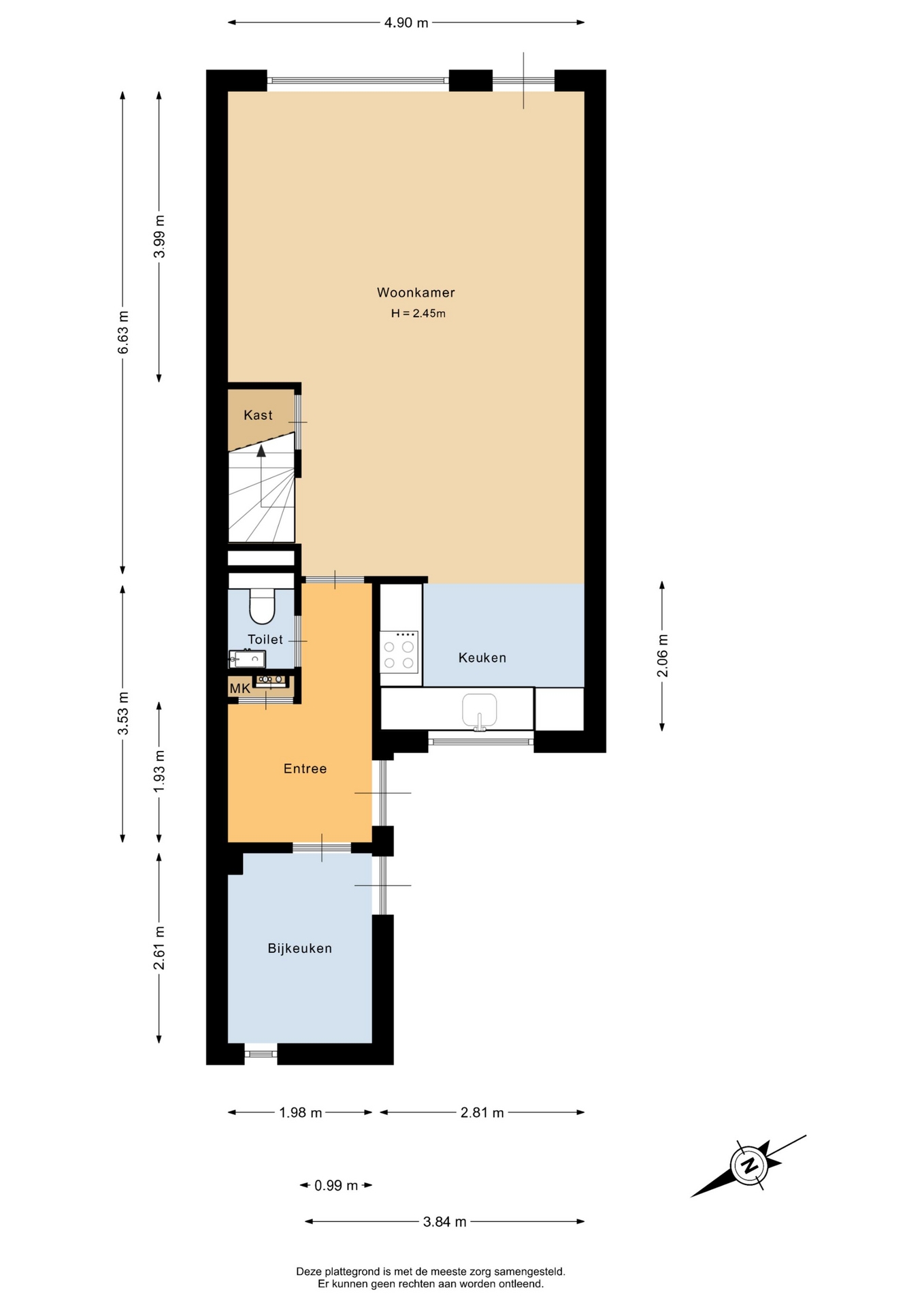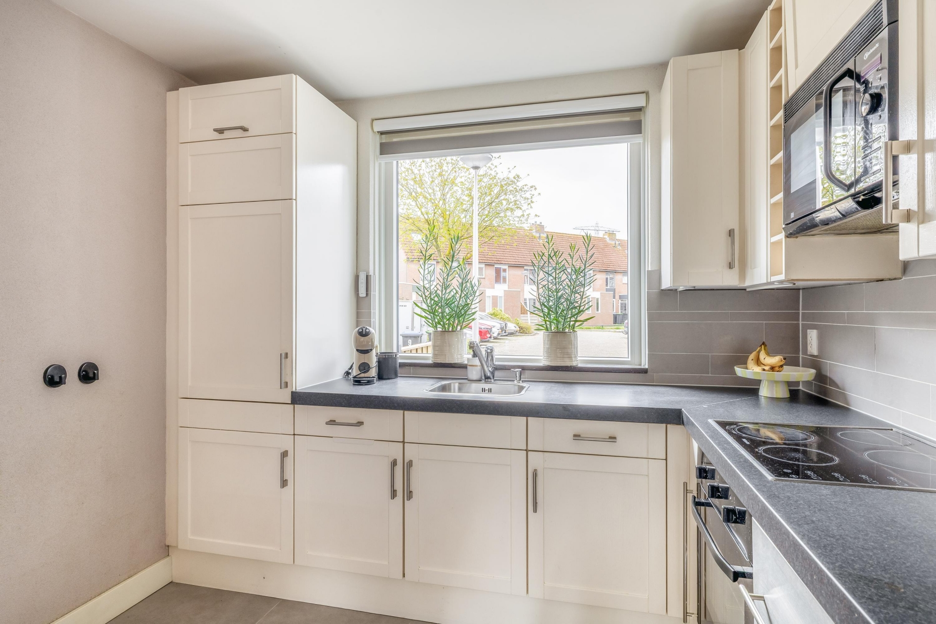 Aan de voorzijde van het huis ligt de keuken. Deze is praktisch ingericht en voorzien van de benodigde inbouwapparatuur. Door de ligging aan de straatzijde heb je hier prettig licht en contact met buiten.