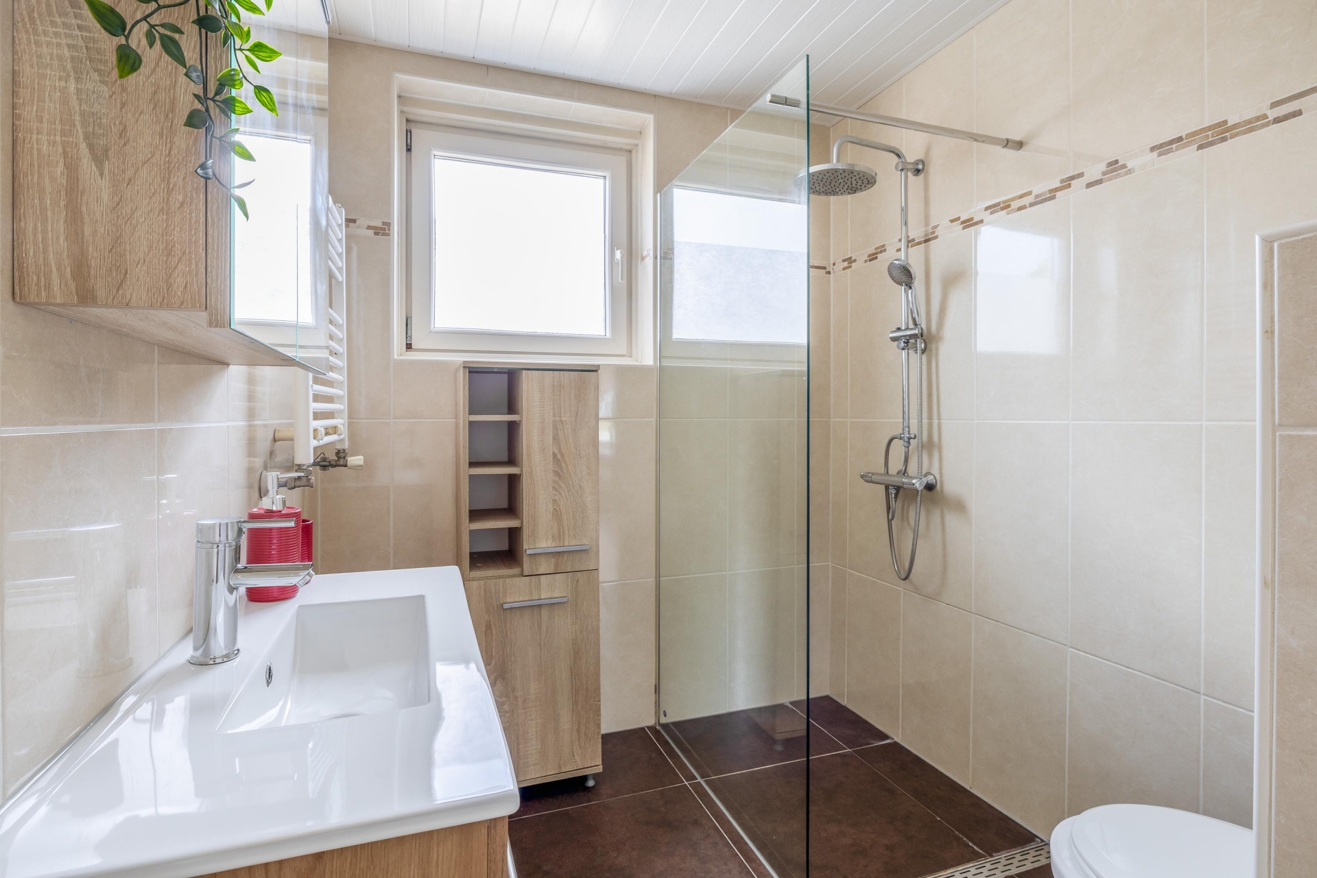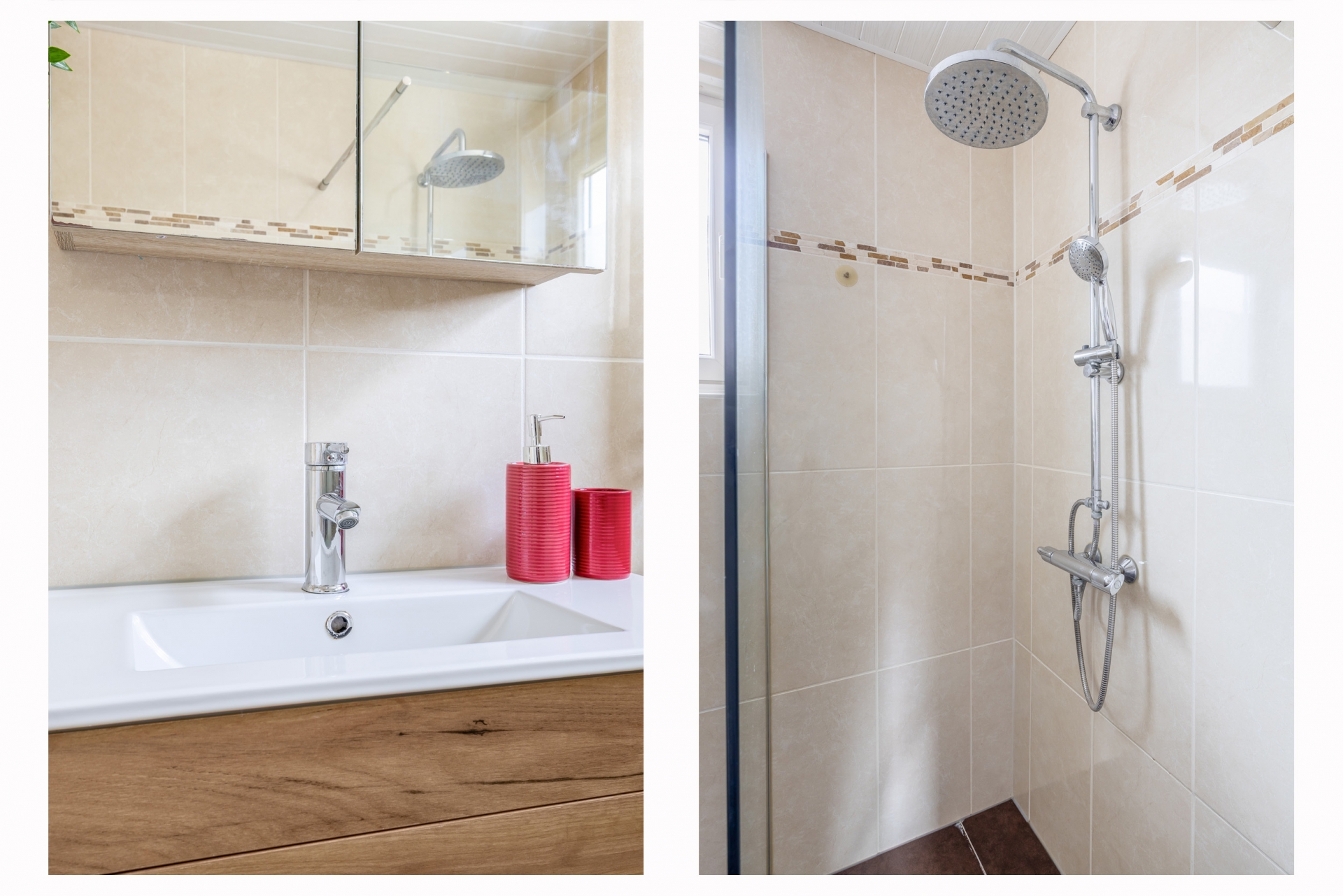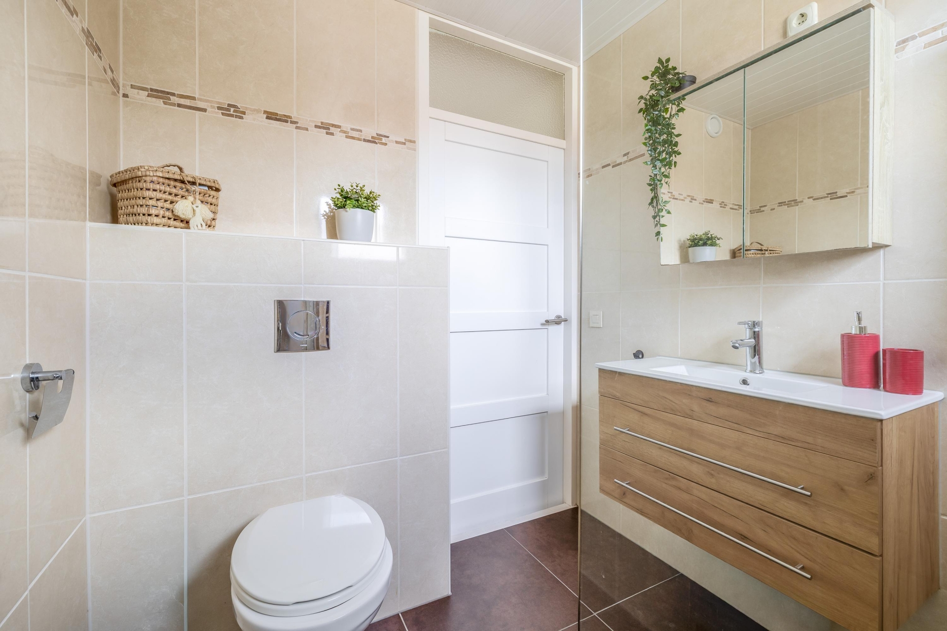 De badkamer is netjes en compleet uitgevoerd met een douche, wastafelmeubel en toilet. Alles wat je nodig hebt is aanwezig en functioneert prima.