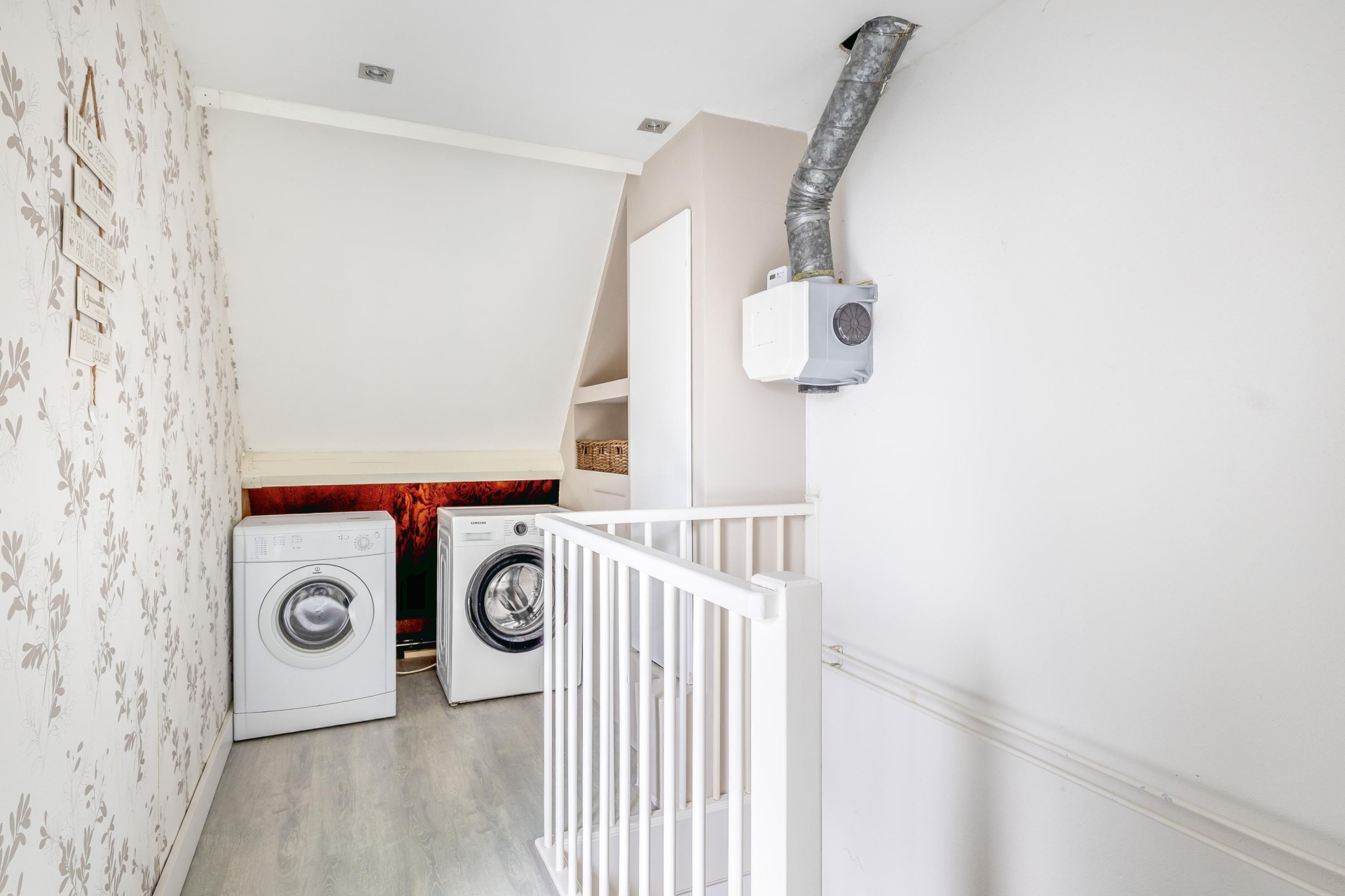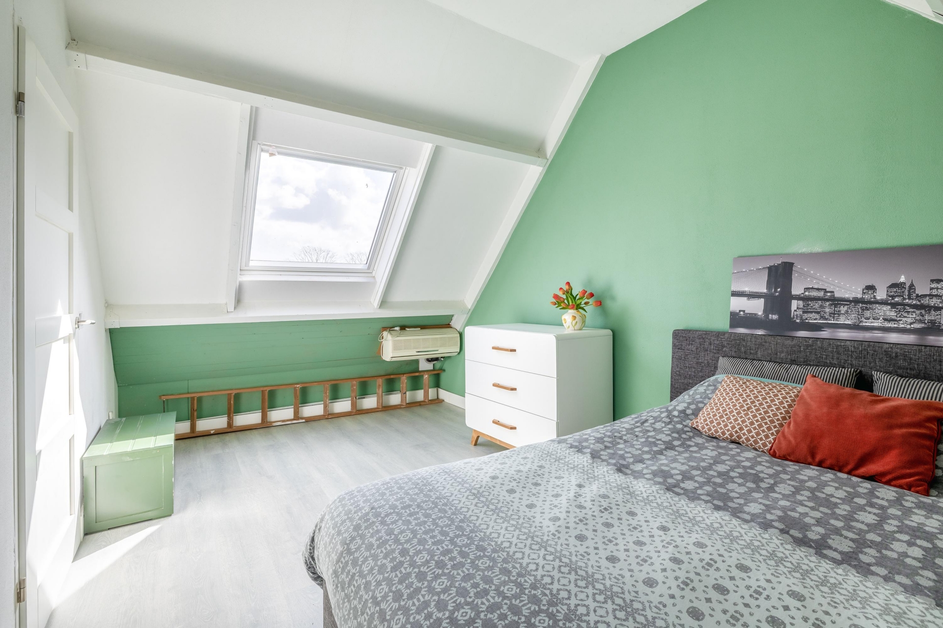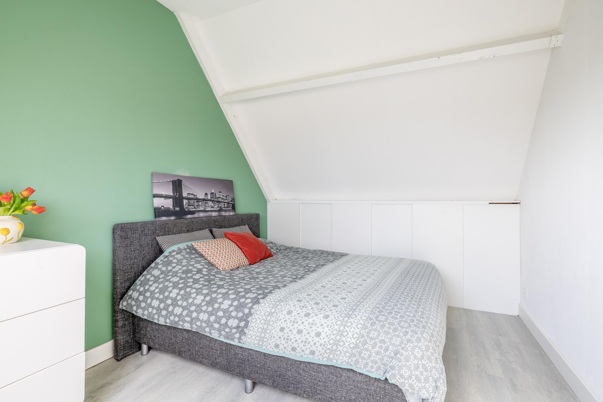 De tweede verdieping verrast met een ruime derde slaapkamer. Dankzij het dakraam is deze kamer lekker licht en daardoor ideaal als extra slaapkamer, werkruimte of hobbykamer. Op de overloop is ruimte voor de wasmachine en extra bergruimte. Daarnaast is er nog een vliering aanwezig voor het opbergen van spullen.