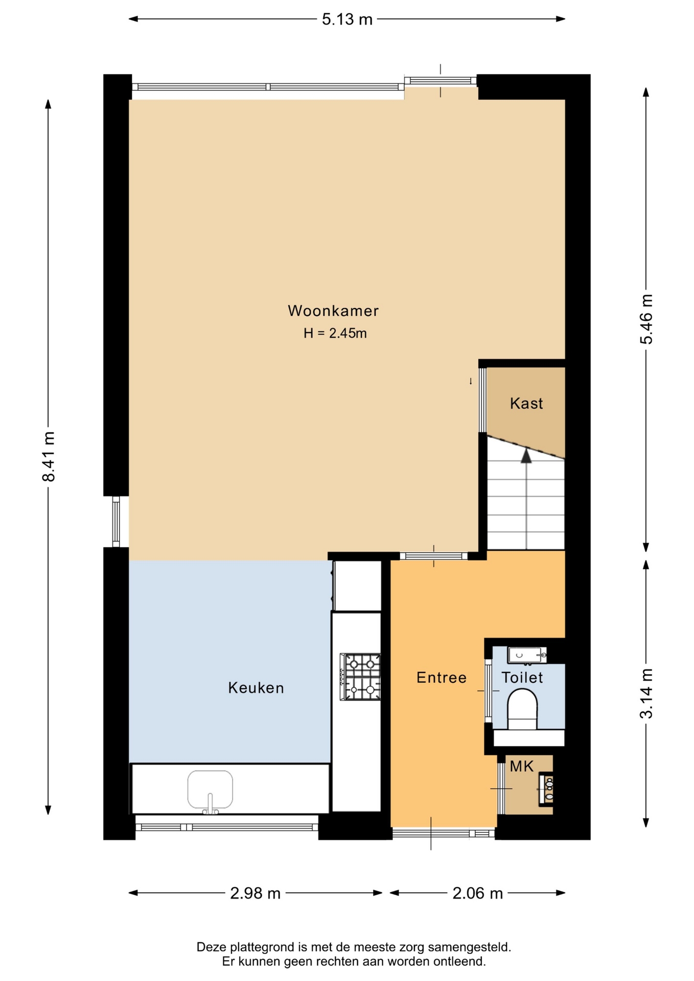 Entree in de hal met toegang tot de toiletruimte, de woonkamer en de trap naar de eerste verdieping. De tuingerichte woonkamer is heerlijk licht dankzij het extra zijraam en beschikt over een praktische vaste kast onder de trap.