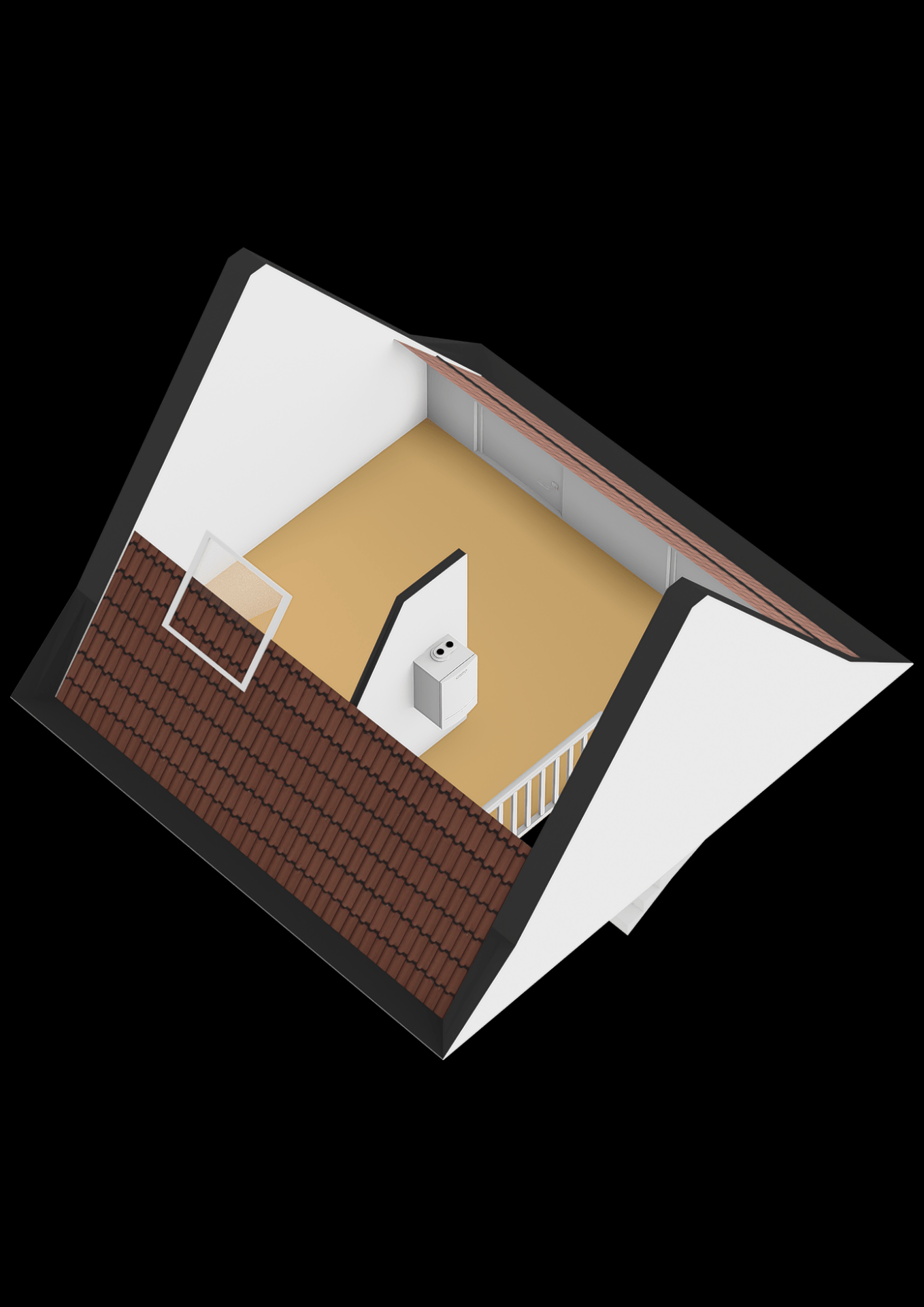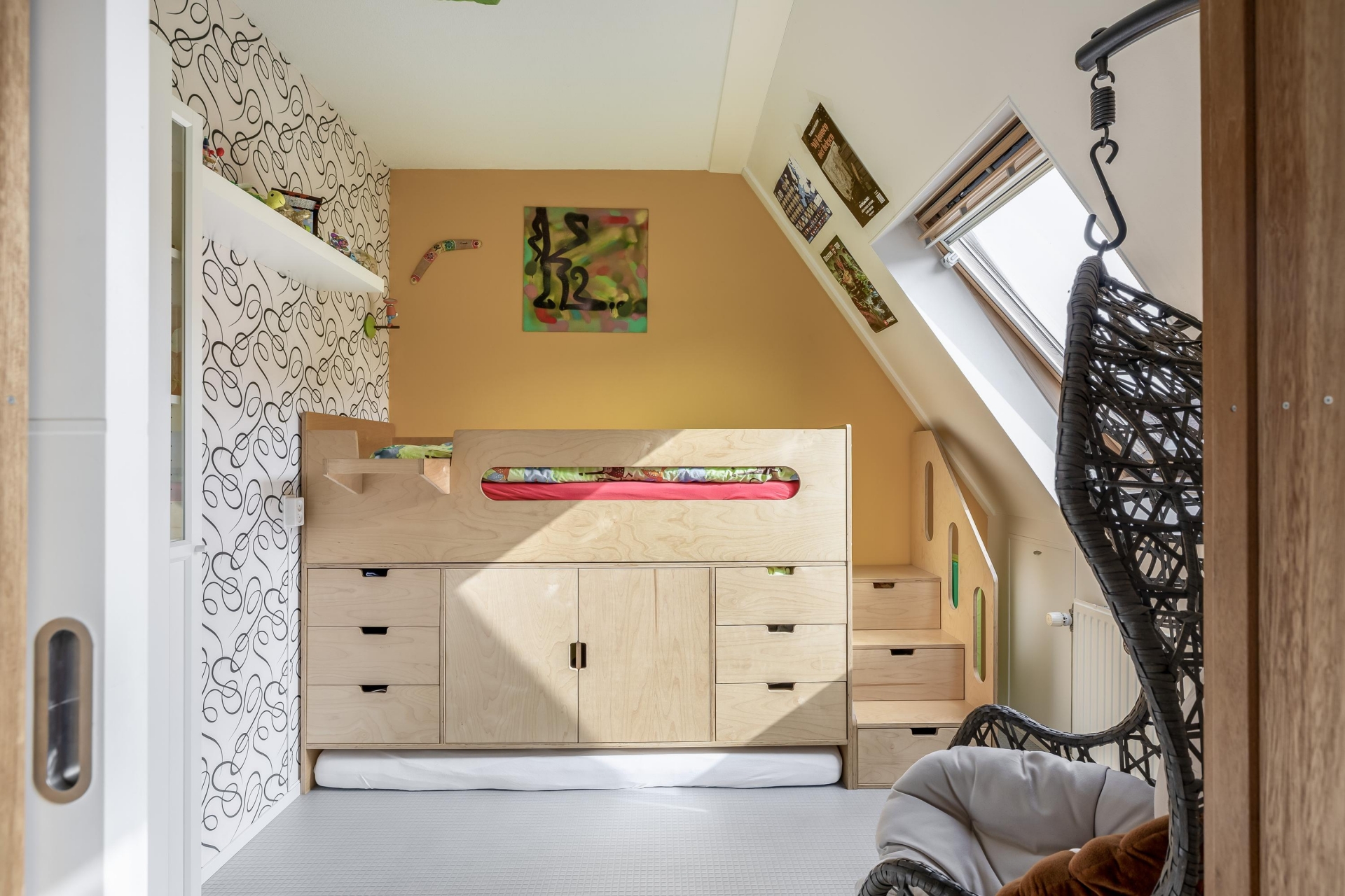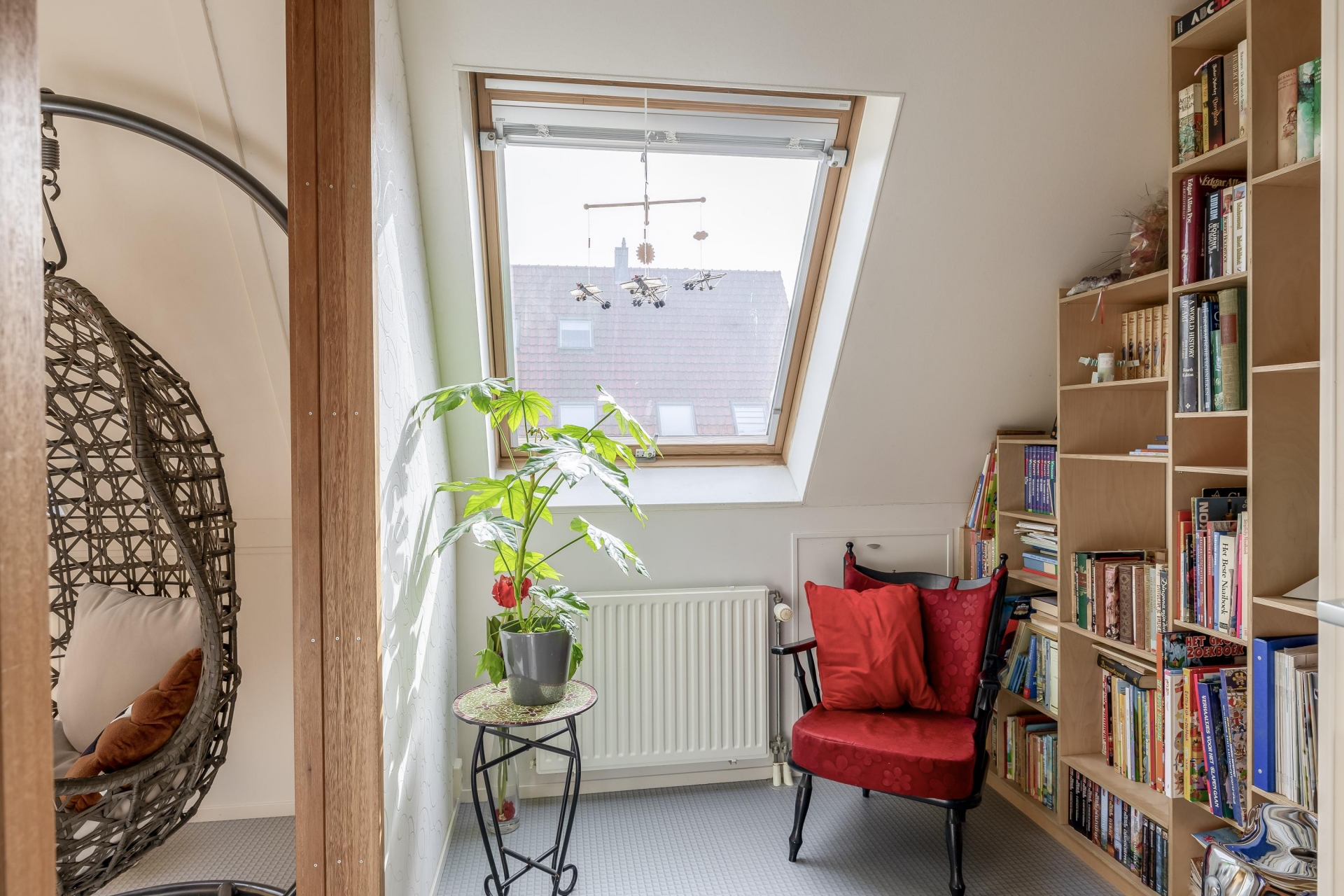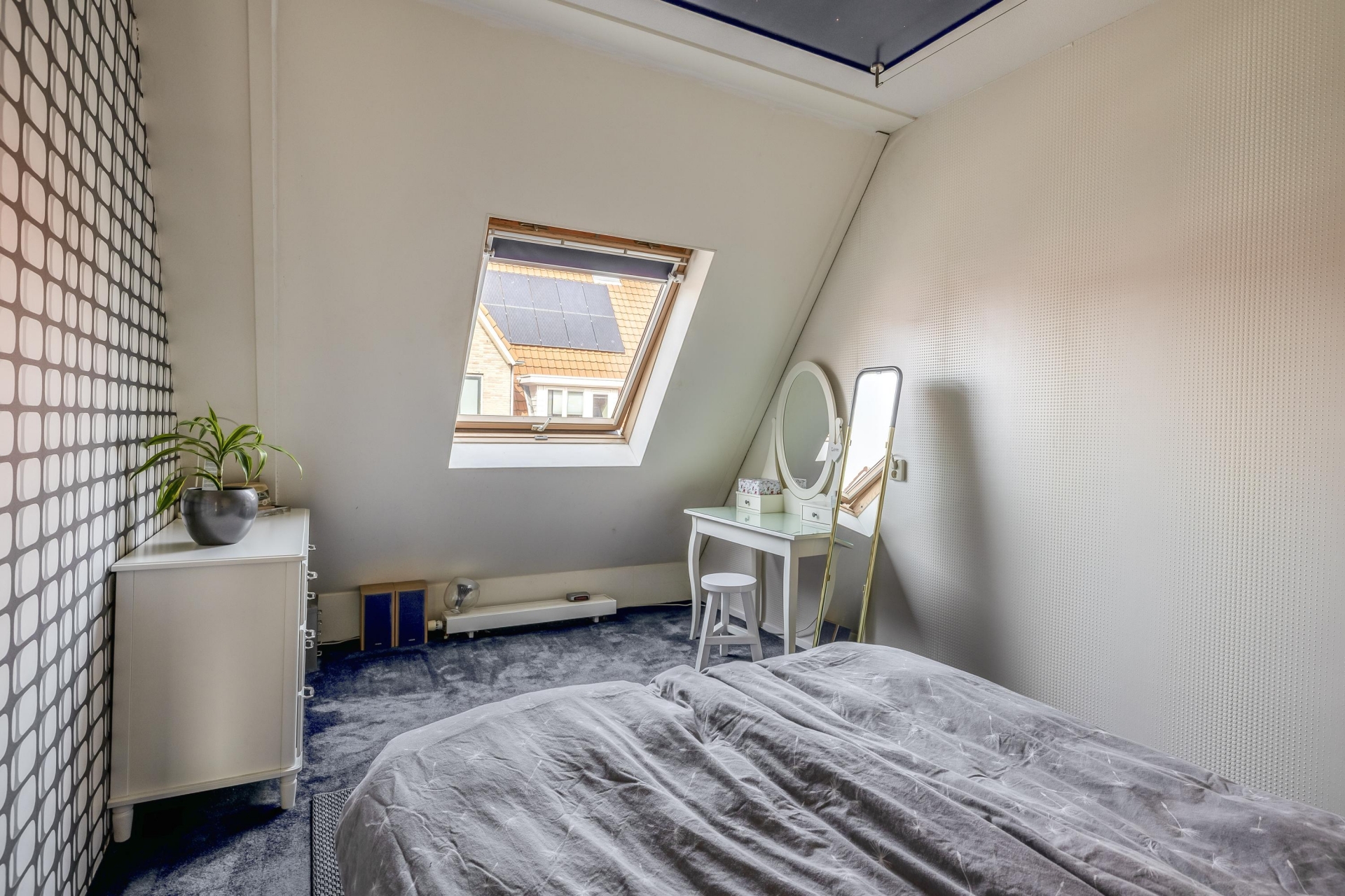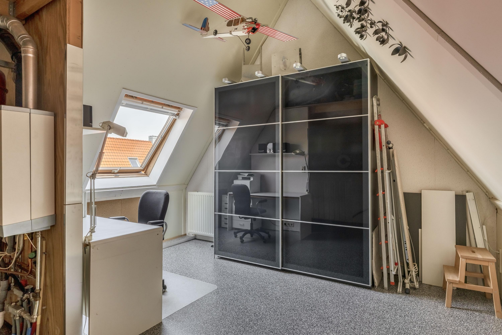 Ruime zolderkamer met dakvenster, bergvliering, bergruimte en opstelplaats wasmachine, droger en CV combiketel.