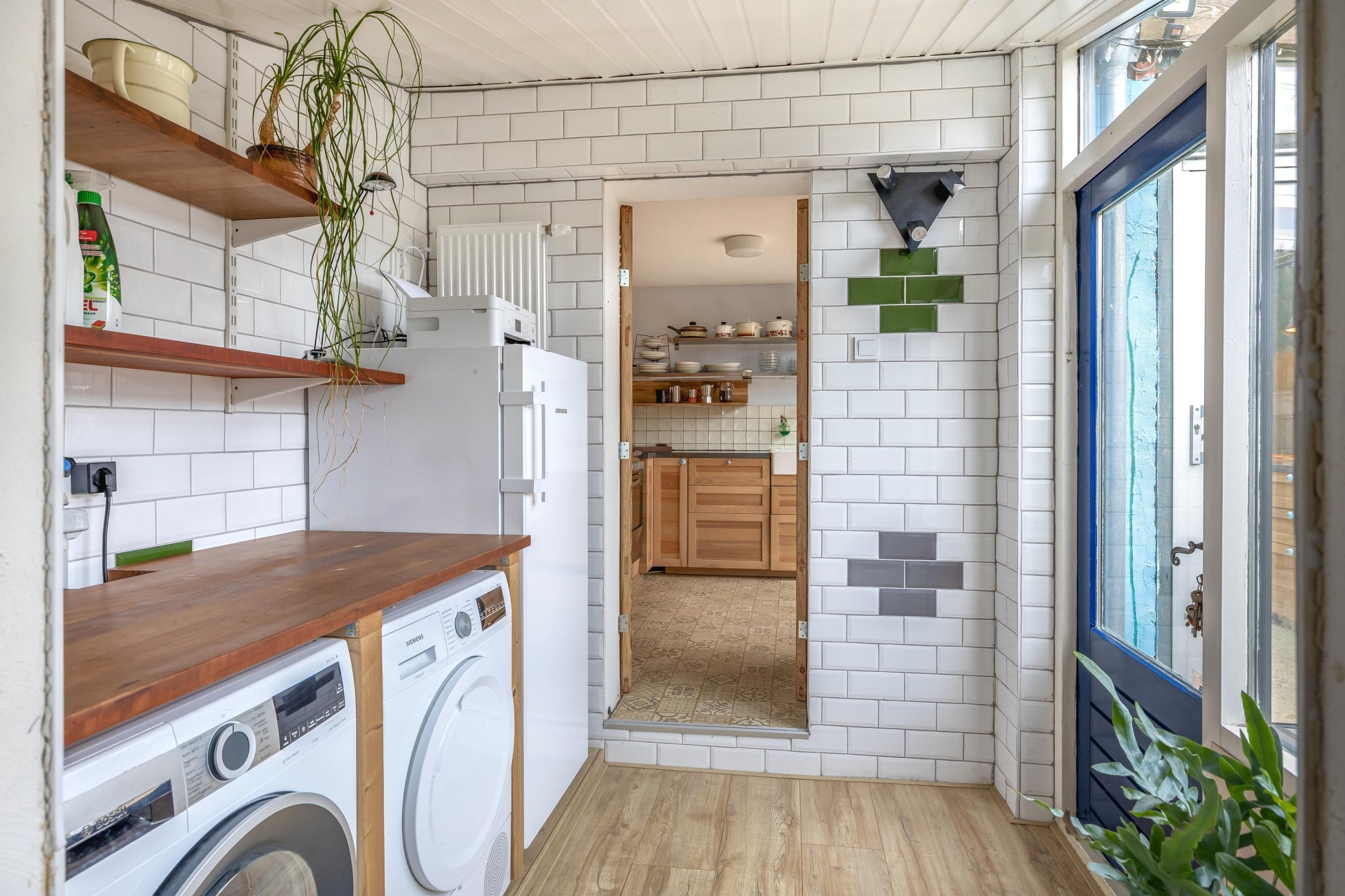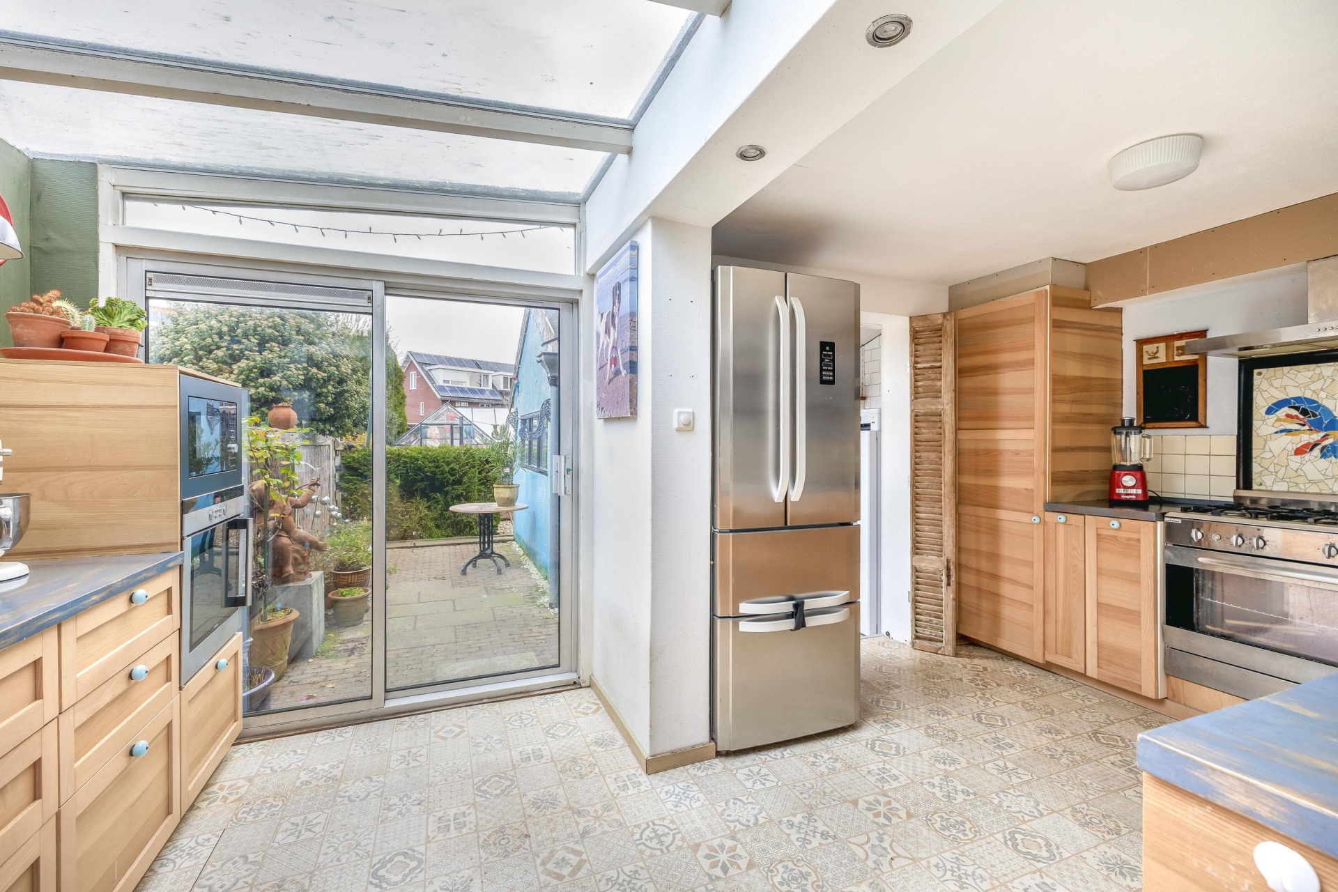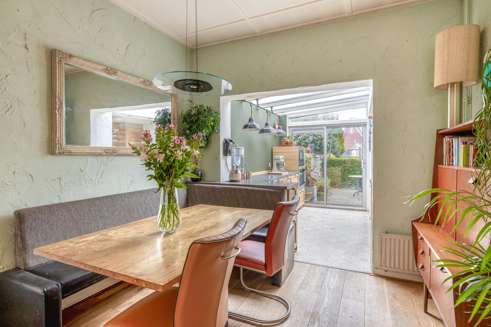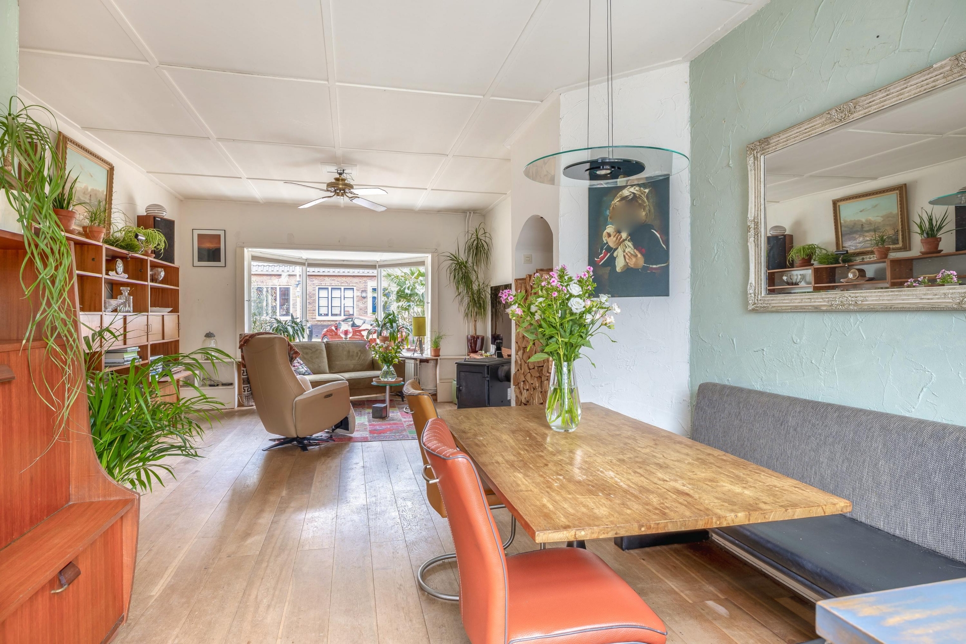 Bij binnenkomst valt direct de warme en gezellige sfeer op. De doorzonwoonkamer is afgewerkt met een houten vloer en heeft een houtkachel die zorgt voor knusse avonden in de koudere maanden. Aan de voorzijde zorgt de erker voor veel licht en zicht op de rustige straat. De eethoek aan de tuinzijde grenst direct aan de keuken en biedt voldoende ruimte voor etentjes met vrienden of een uitgebreid ontbijt in het weekend (met je geliefde). De keuken is speels vormgegeven en ligt in de uitbouw aan de achterzijde. Dankzij de lichtstraat en grote raampartijen komt er veel daglicht binnen. De keuken is voorzien van diverse apparatuur en biedt lekker veel werk- en opbergruimte. Vanuit hier loop je zo de tuin in, ideaal tijdens het koken of voor een kop koffie in de ochtendzon.