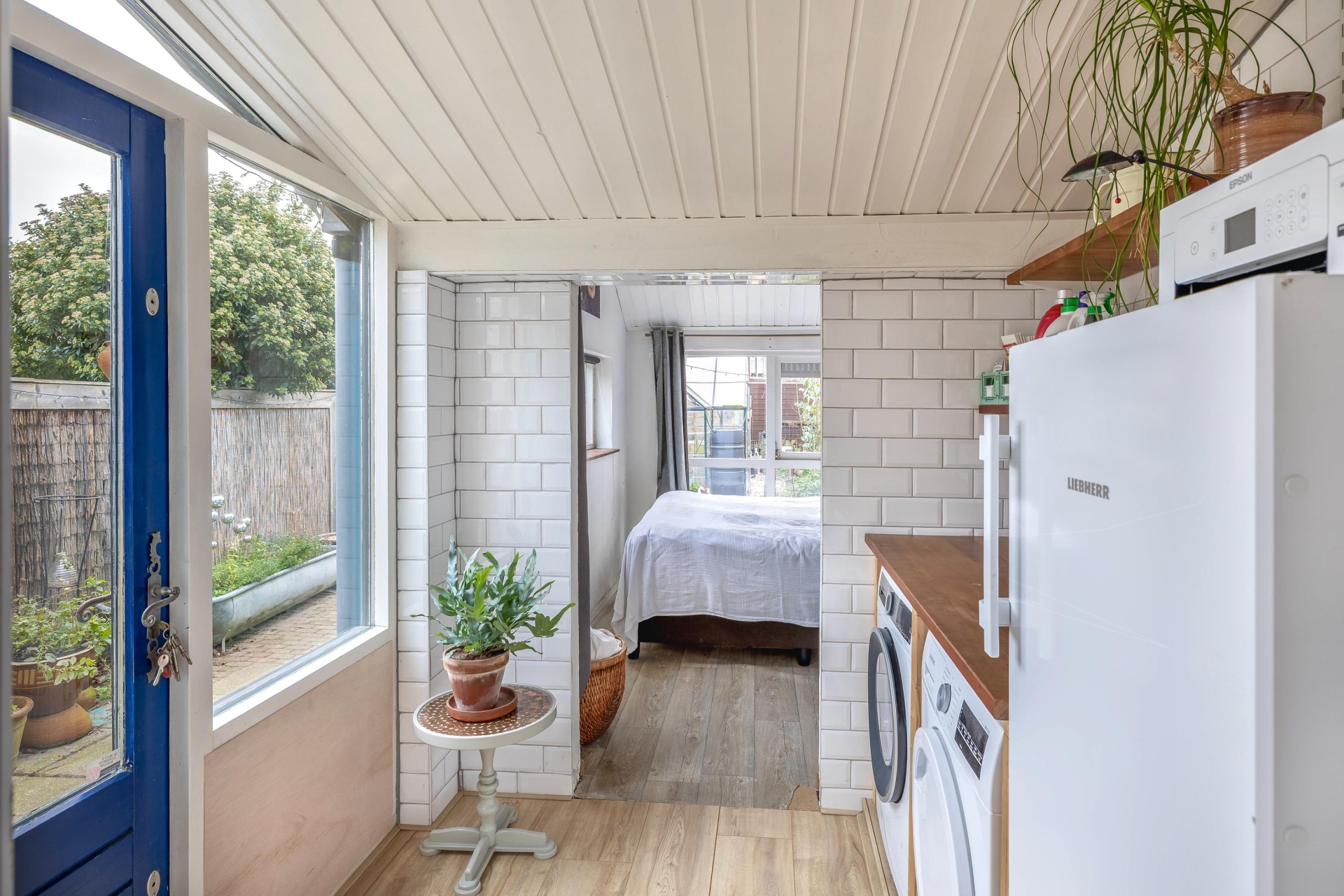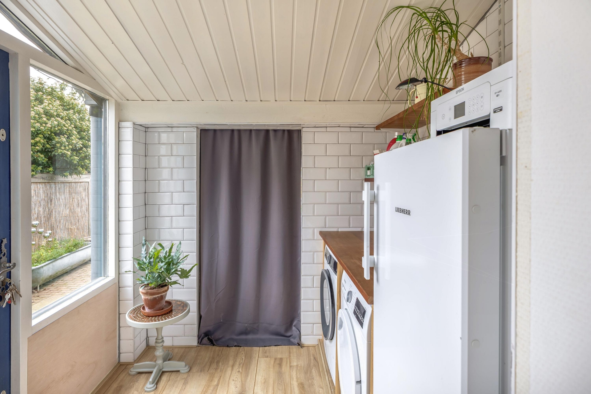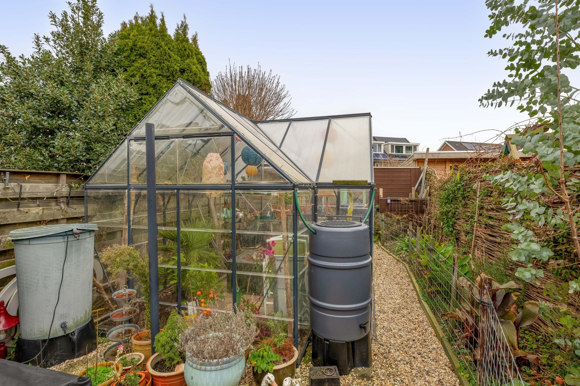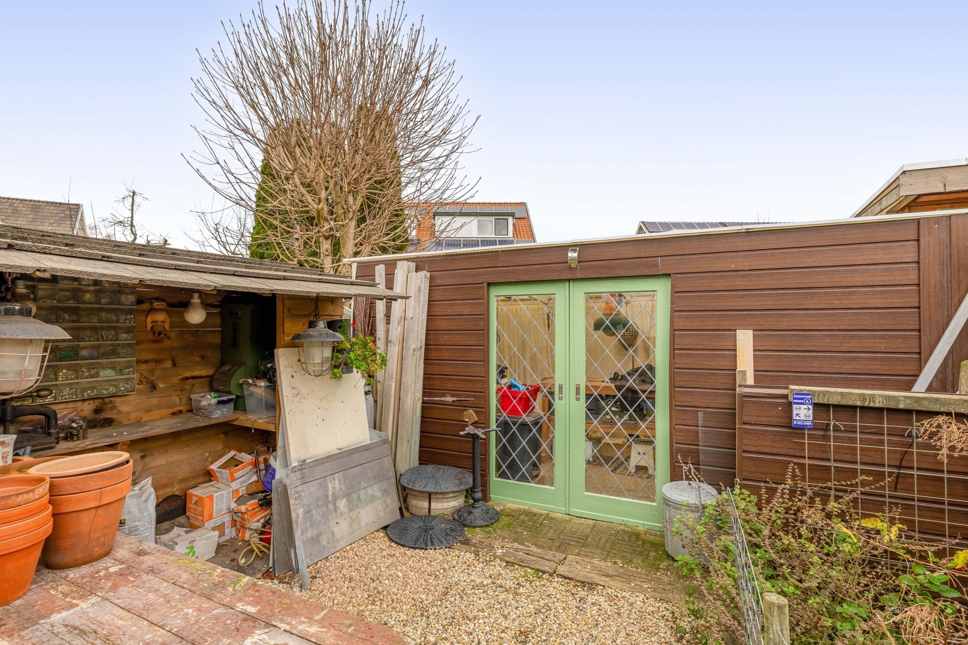 De achtertuin is met recht een van de grote pluspunten van dit huis. Met een diepte van circa 28 meter is er plek genoeg voor een loungeset, speelplek voor kinderen, een moestuin of zelfs een kas — zoals je die nu al aantreft in de tuin. De tuin is netjes aangelegd met een combinatie van groen, grindpaden en een terras. Achterin vind je twee stenen bergingen met elektra: ideaal voor fietsen, gereedschap of je hobbyspullen. En via de achterom ben je zo weer op straat. Dankzij de ligging op het noordwesten profiteer je hier van middag- en avondzon, perfect voor een BBQ of een glas wijn na werk. De voortuin zorgt daarnaast voor extra privacy aan de straatzijde.