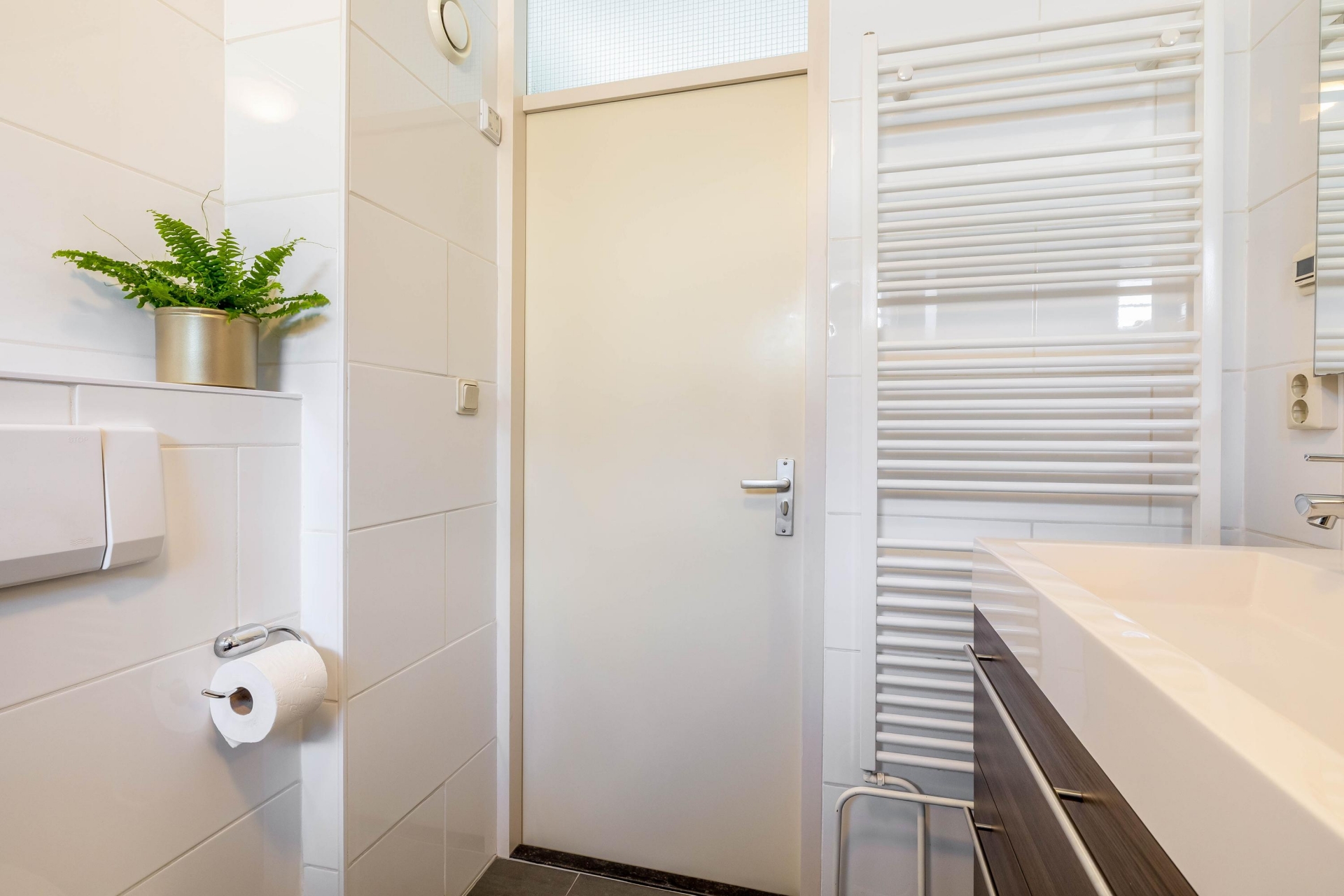 De badkamer is centraal op de verdieping gelegen en praktisch ingericht. Hier vind je onder andere een ligbad/douche, wastafel en toilet. Alles wat je nodig hebt voor het dagelijkse comfort.