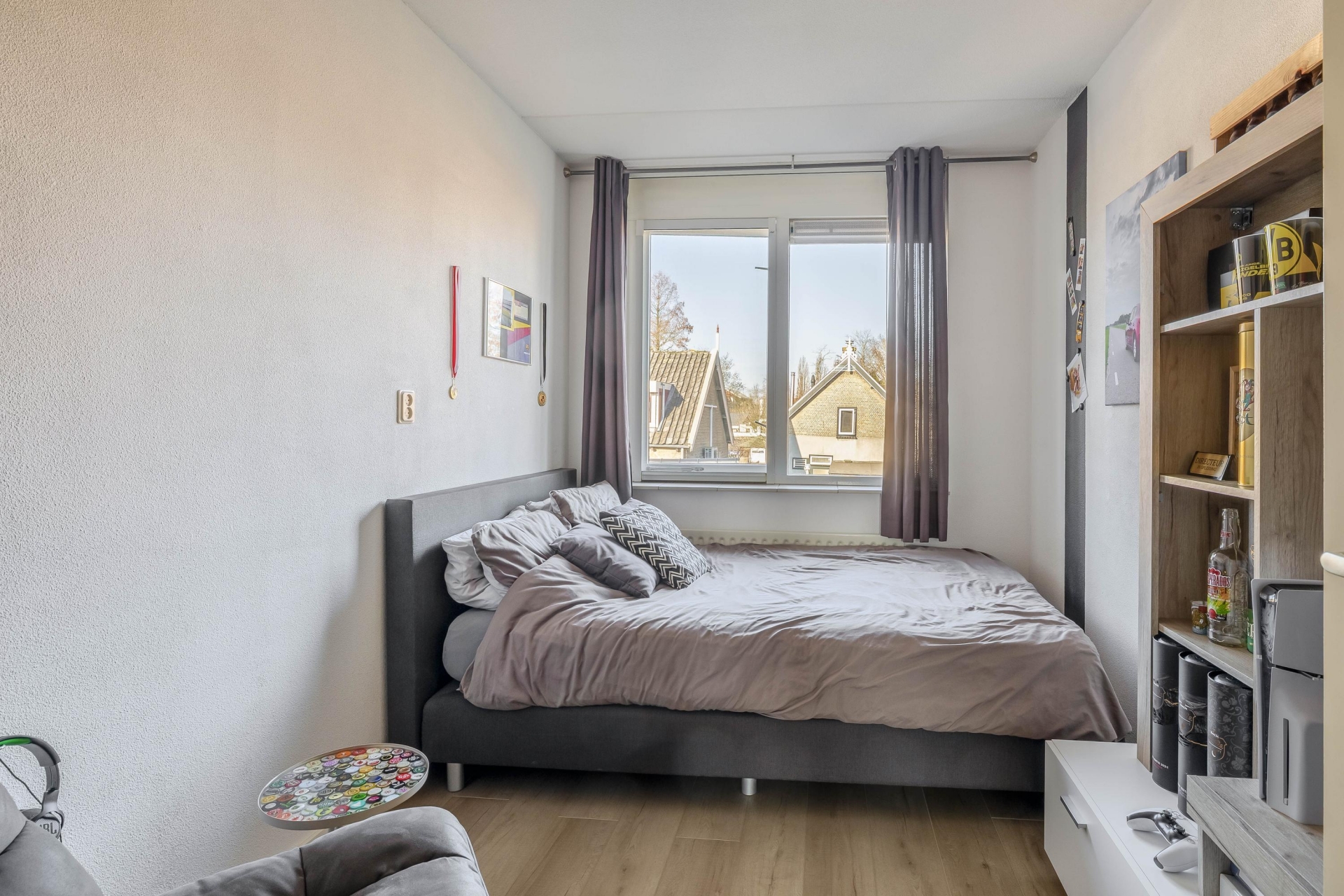Op de eerste verdieping bevinden zich drie slaapkamers. De grootste slaapkamer biedt voldoende ruimte voor een tweepersoonsbed en een grote kastenwand. De andere kamers zijn ideaal als kinderkamer, werkkamer of logeerkamer. Dankzij de goede indeling zijn alle kamers prettig bruikbaar.