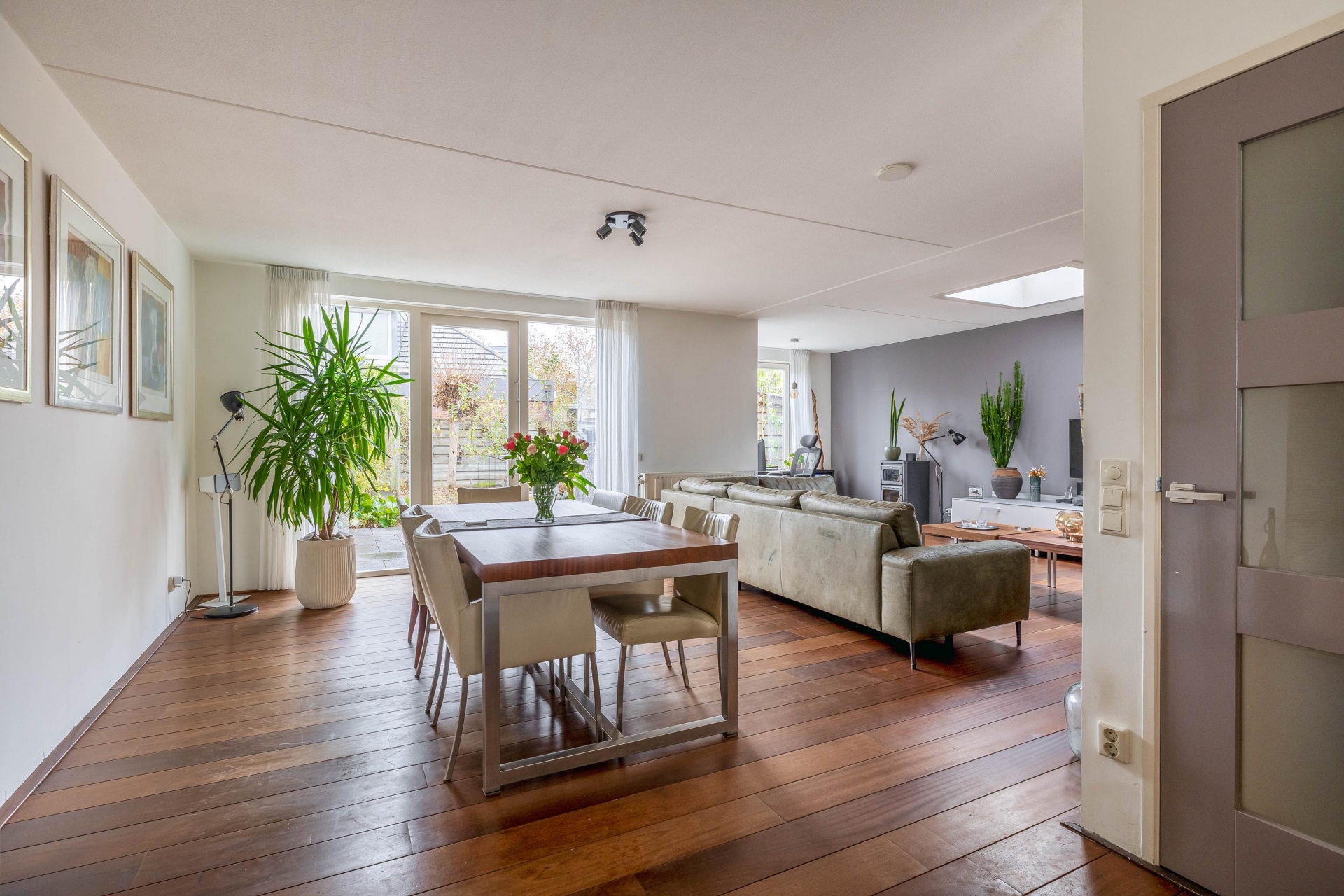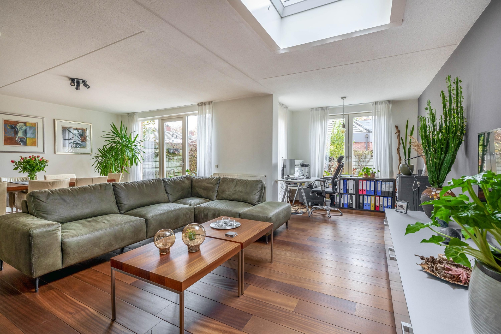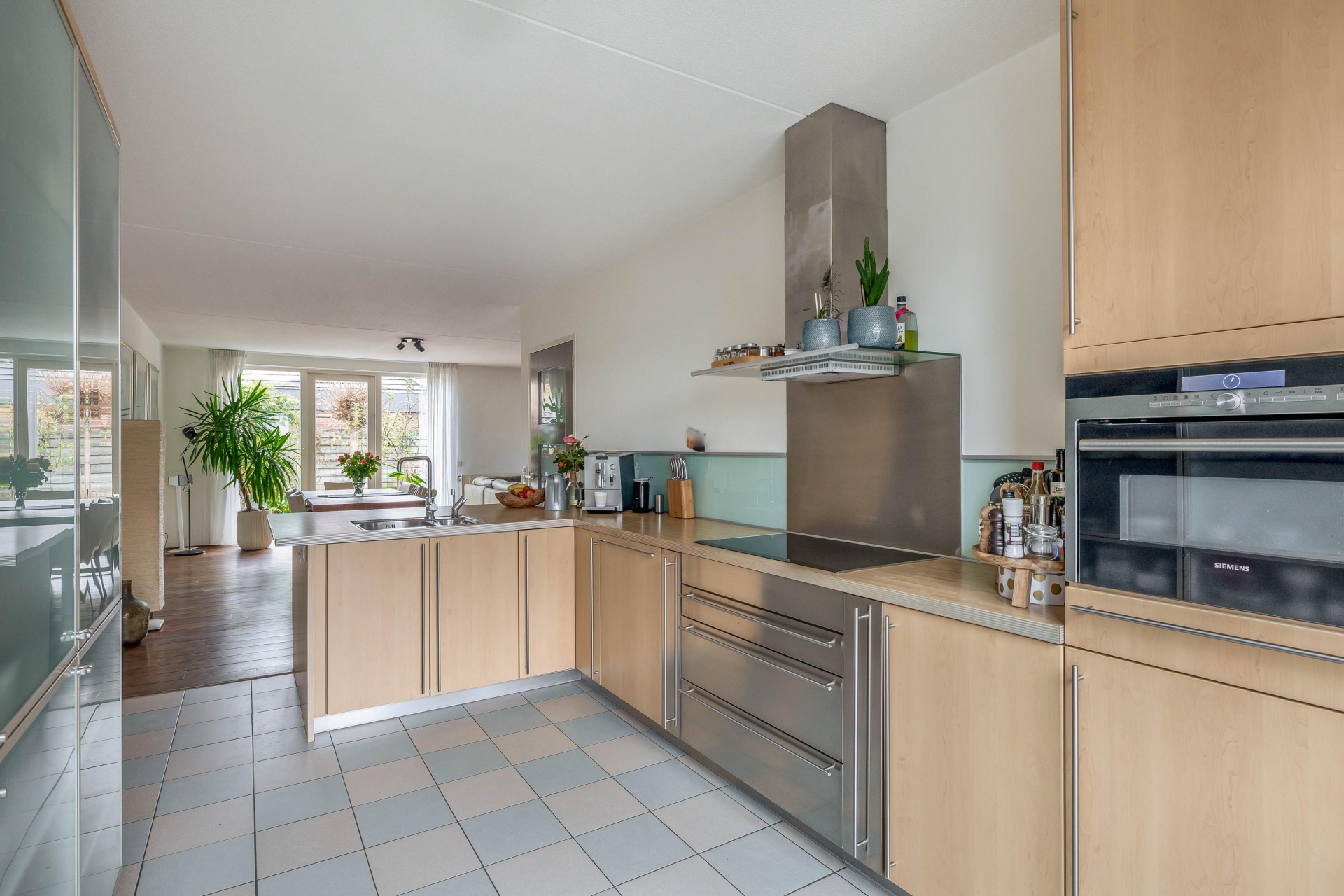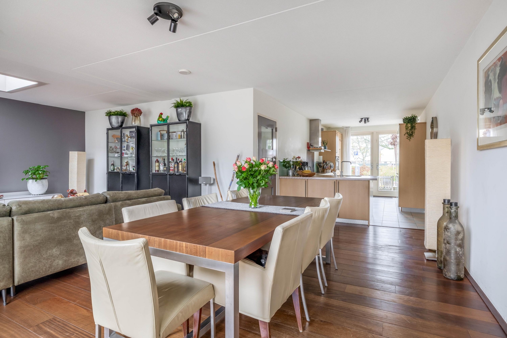 De woonkamer van circa 35 m² is tuingericht en heerlijk licht dankzij de grote raampartijen. Vanuit hier kijk je zo de groene achtertuin in. De begane grond is praktisch ingedeeld met een ruime hal, toilet, toegang tot de garage én natuurlijk de open keuken aan de voorzijde. De keuken is voorzien van inbouwapparatuur en een fijne plek voor een grote eettafel, waar je met het hele gezin of met vrienden lekker kunt tafelen. De woonkamer en keuken lopen naadloos in elkaar over en maken dit een fijne leefruimte met volop mogelijkheden.