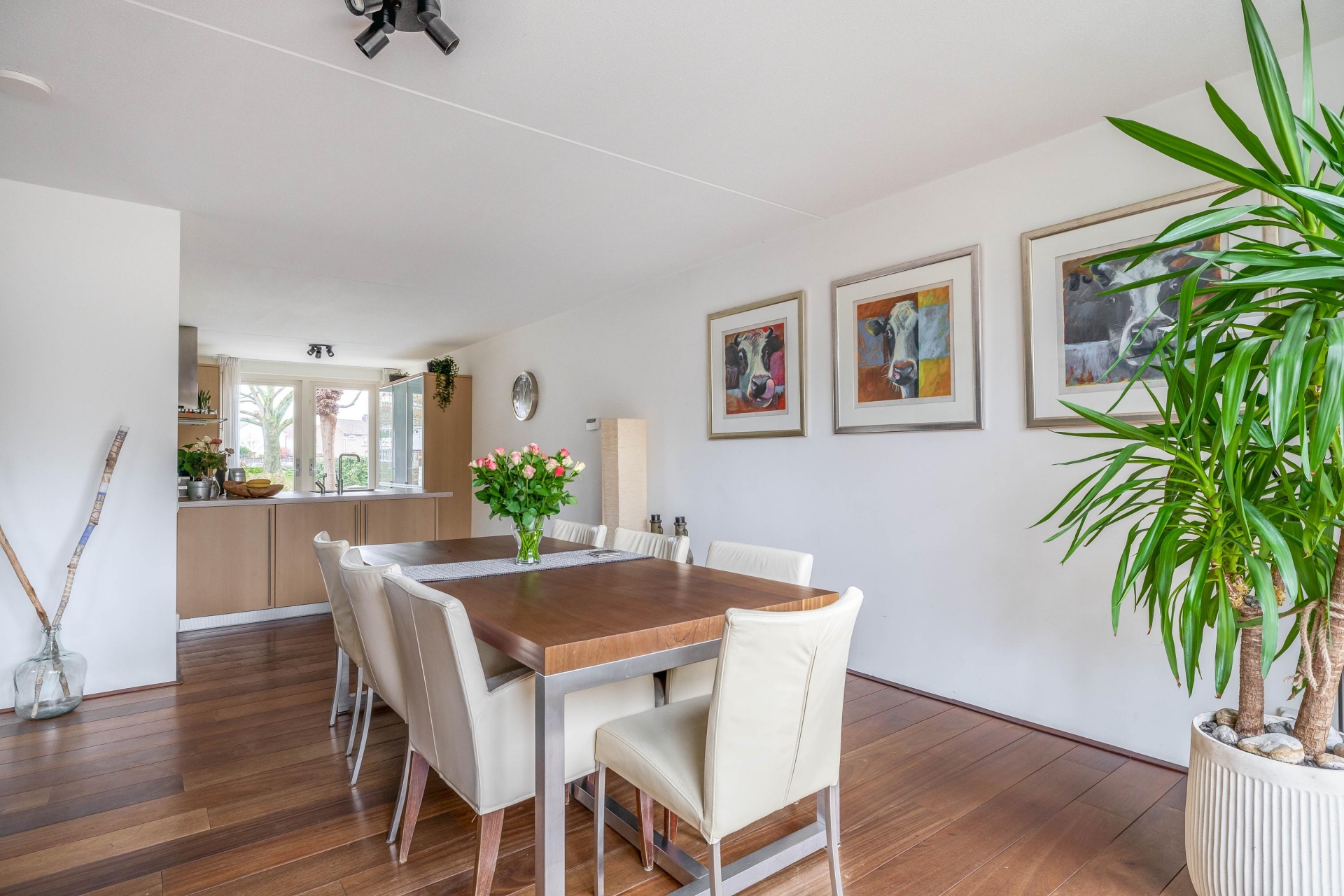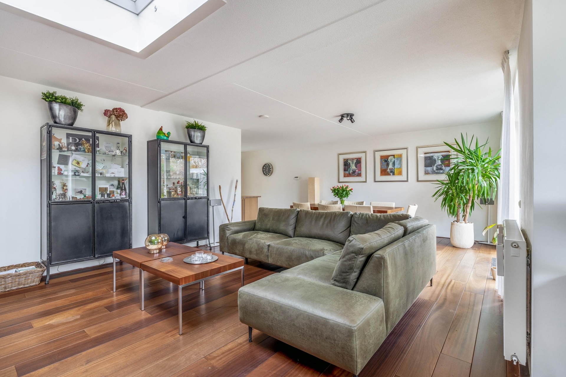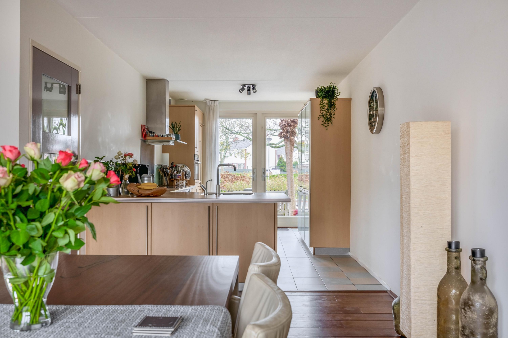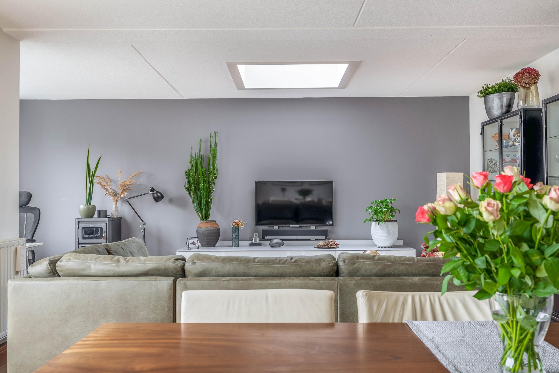 De woonkamer van circa 35 m² is tuingericht en heerlijk licht dankzij de grote raampartijen. Vanuit hier kijk je zo de groene achtertuin in. De begane grond is praktisch ingedeeld met een ruime hal, toilet, toegang tot de garage én natuurlijk de open keuken aan de voorzijde. De keuken is voorzien van inbouwapparatuur en een fijne plek voor een grote eettafel, waar je met het hele gezin of met vrienden lekker kunt tafelen. De woonkamer en keuken lopen naadloos in elkaar over en maken dit een fijne leefruimte met volop mogelijkheden.