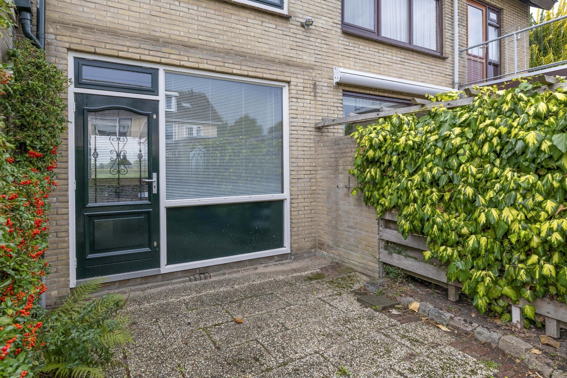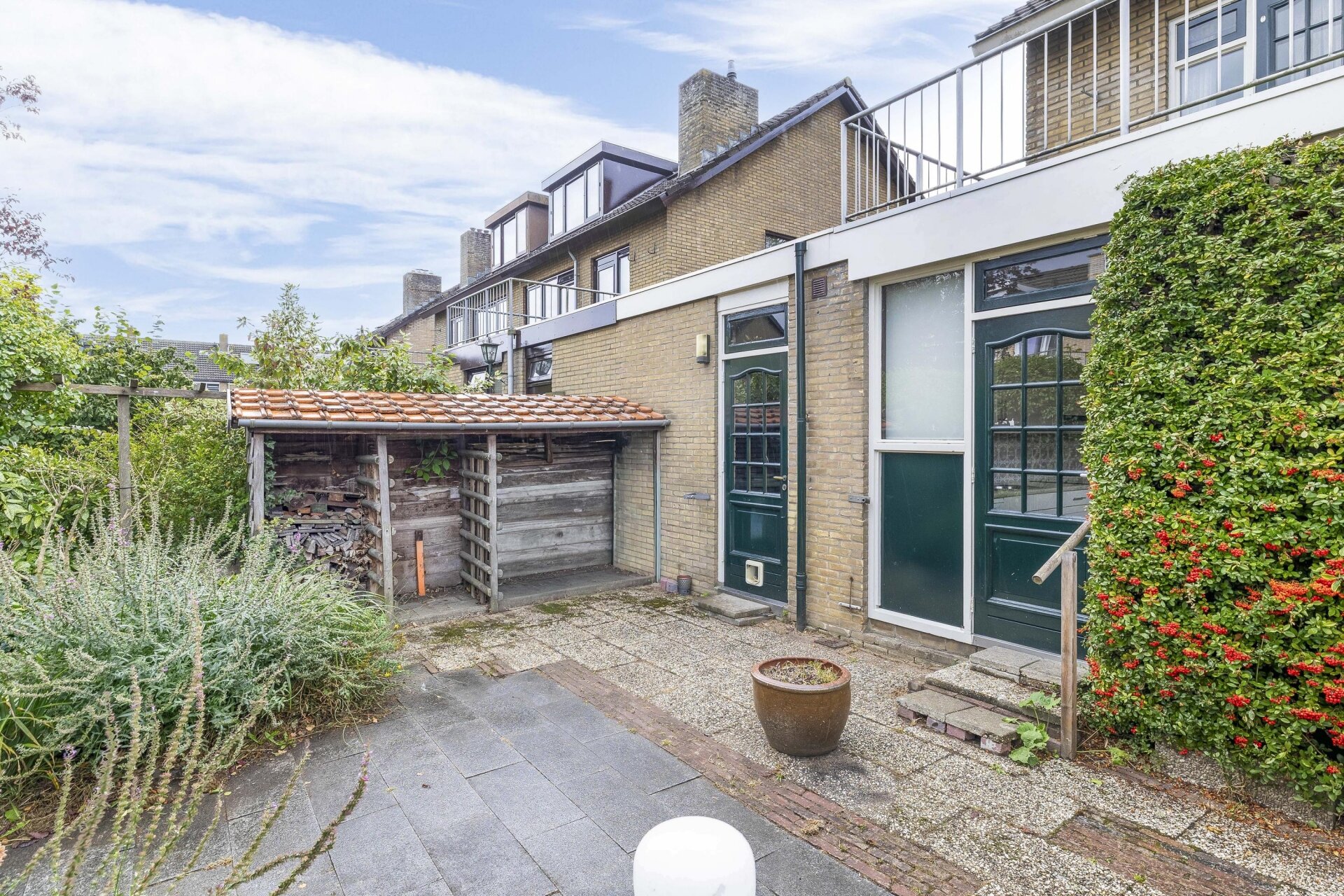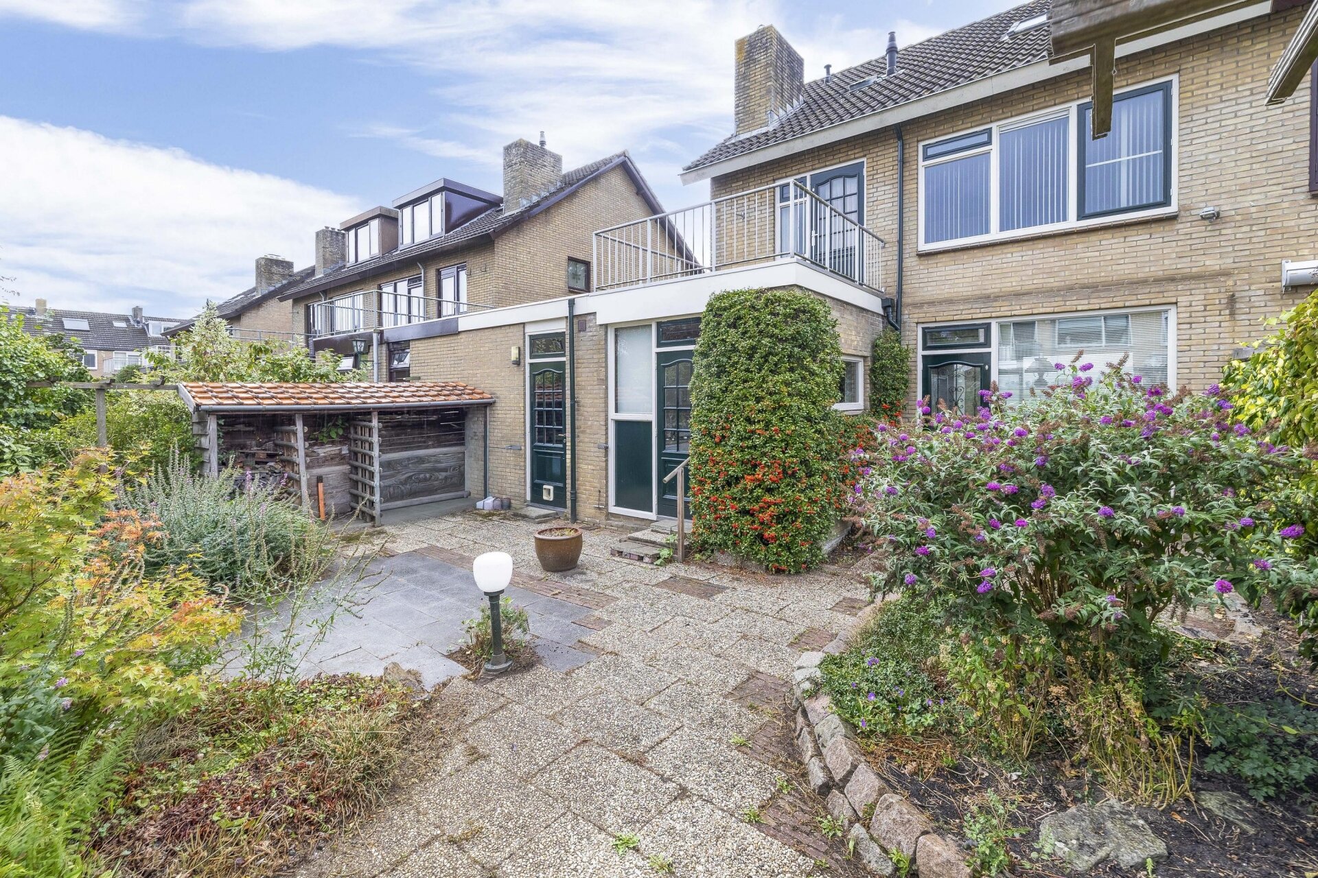 Via de achterdeur stap je de tuin in – een fijne buitenruimte met veel privacy. De tuin is onderhoudsvriendelijk aangelegd met sierbestrating, groene borders, een houthok en achterom. Je hebt hier de hele ochtend en begin van de middag zon, en dankzij de open ligging ook later op de dag nog volop lichtinval. Achterin is voldoende plek voor een zitje, een speelplek voor kinderen of een moestuin.