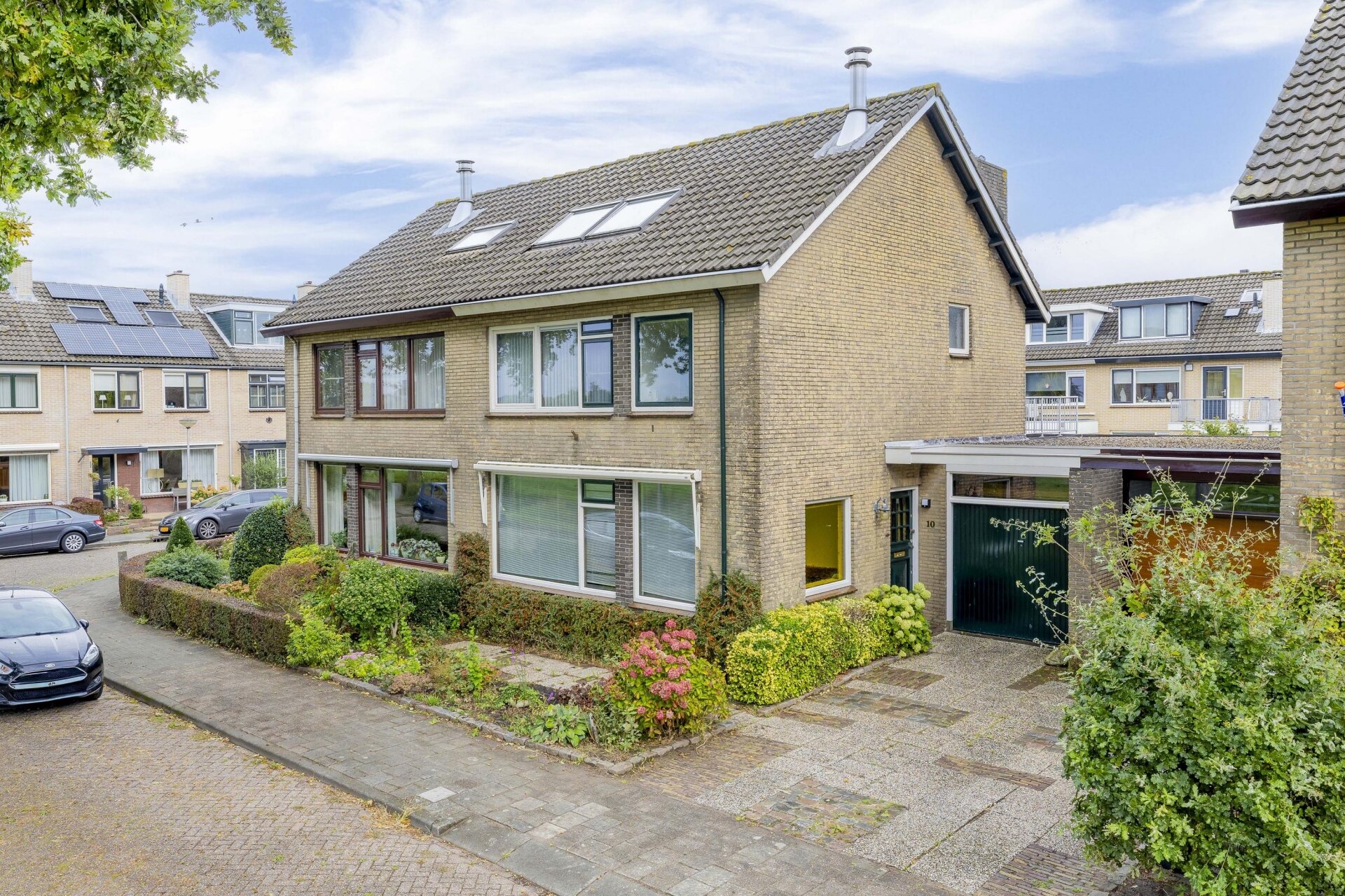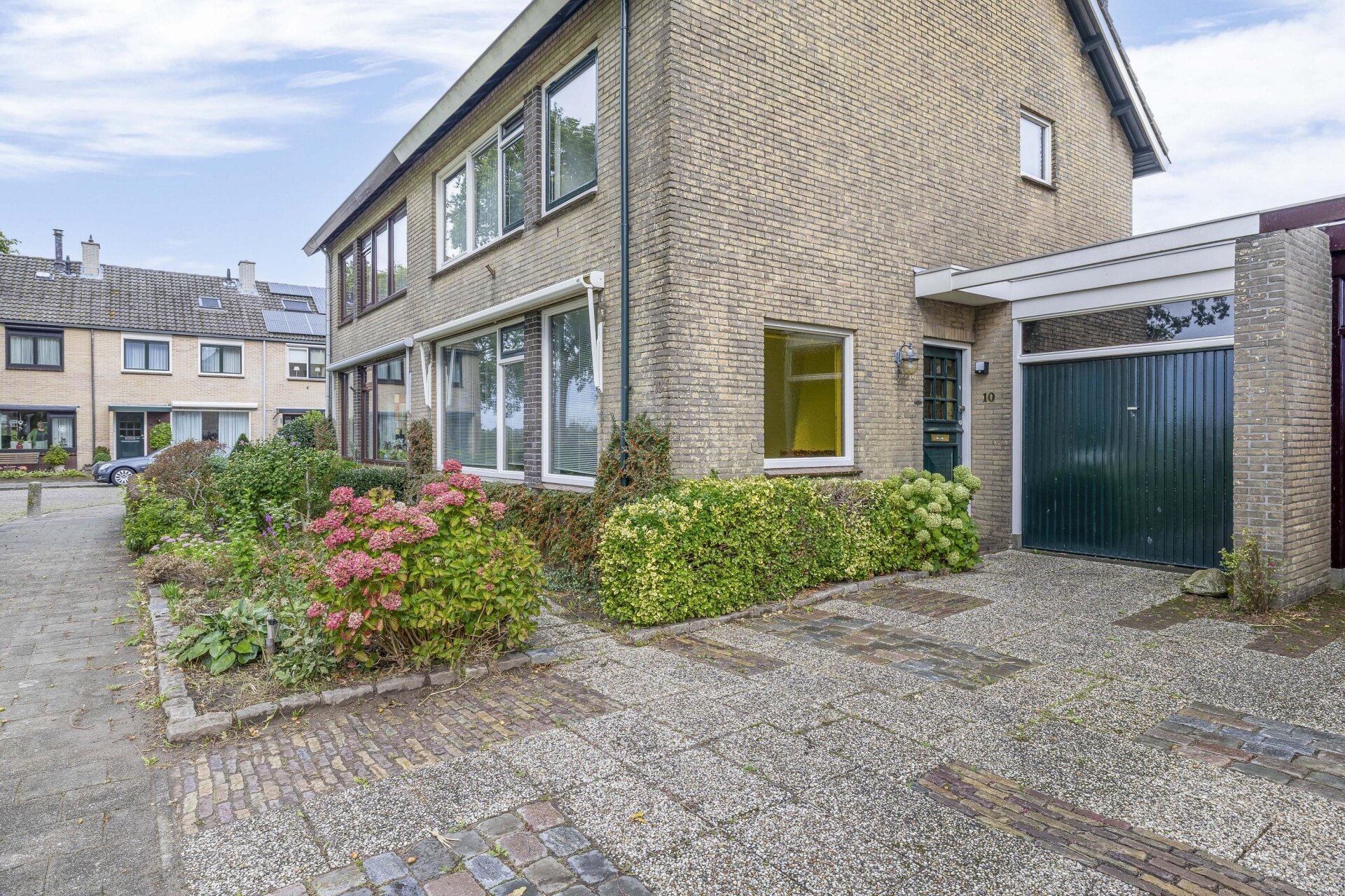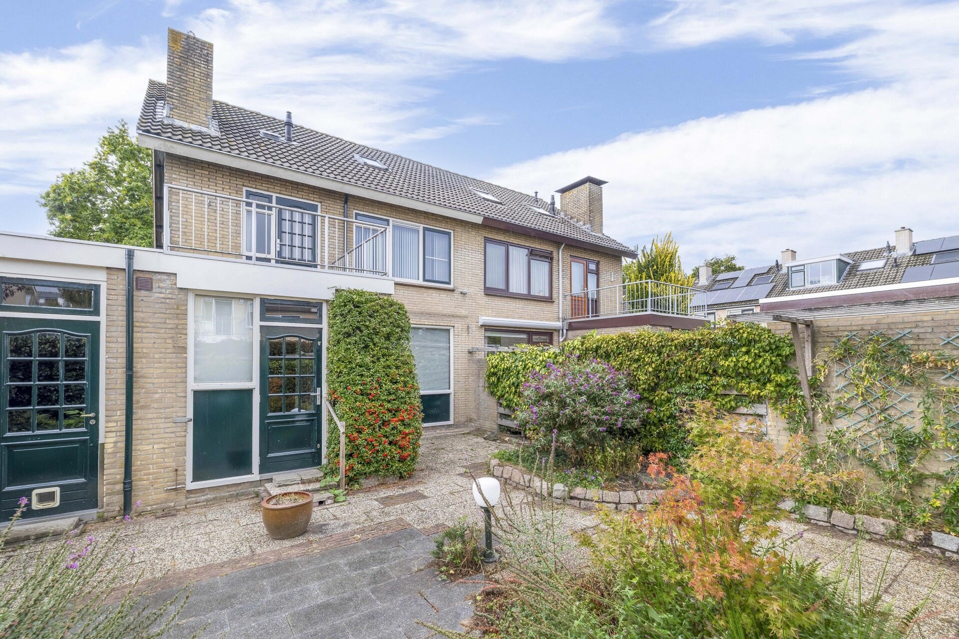 Via de achterdeur stap je de tuin in – een fijne buitenruimte met veel privacy. De tuin is onderhoudsvriendelijk aangelegd met sierbestrating, groene borders, een houthok en achterom. Je hebt hier de hele ochtend en begin van de middag zon, en dankzij de open ligging ook later op de dag nog volop lichtinval. Achterin is voldoende plek voor een zitje, een speelplek voor kinderen of een moestuin.