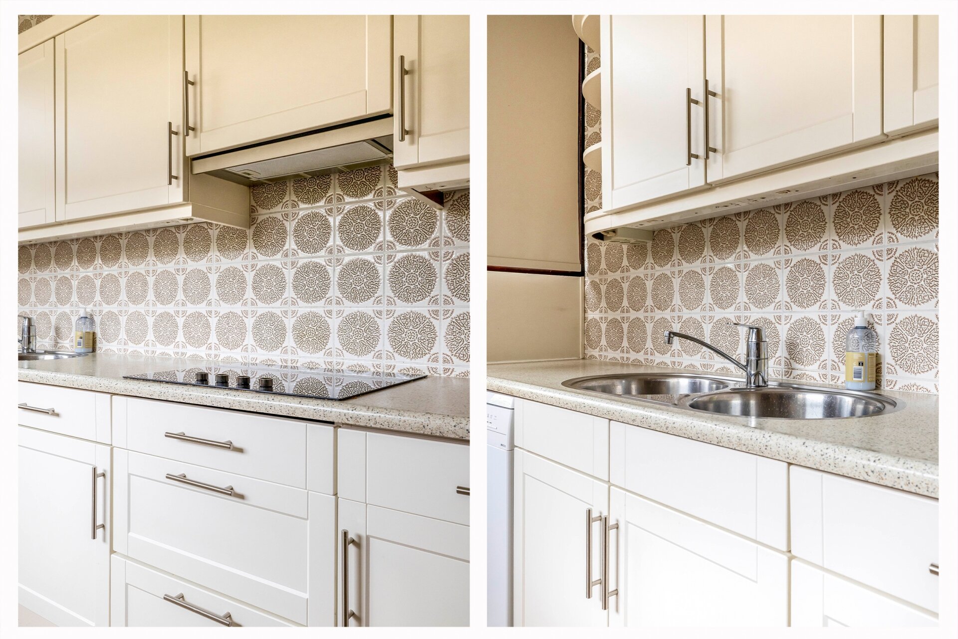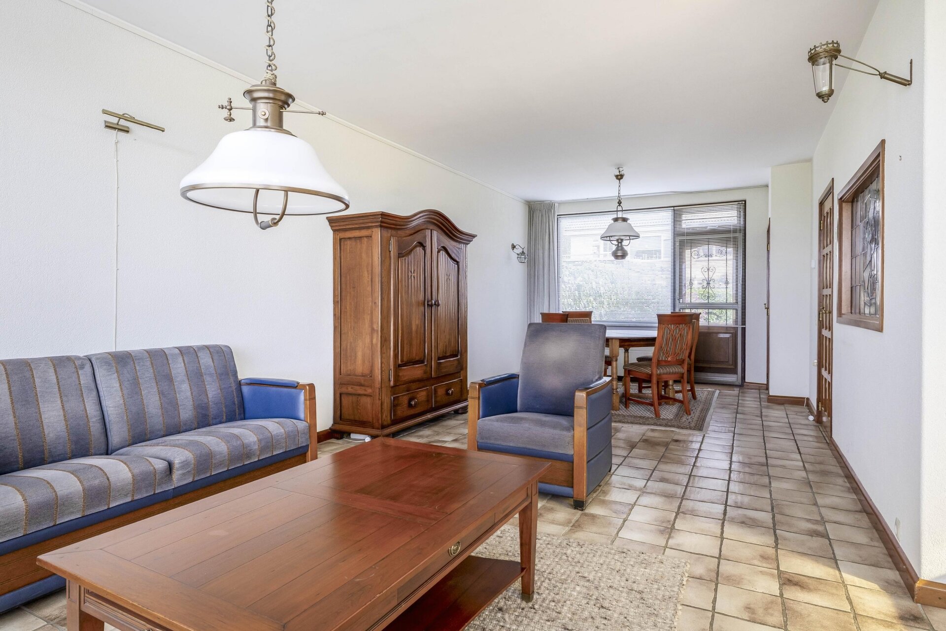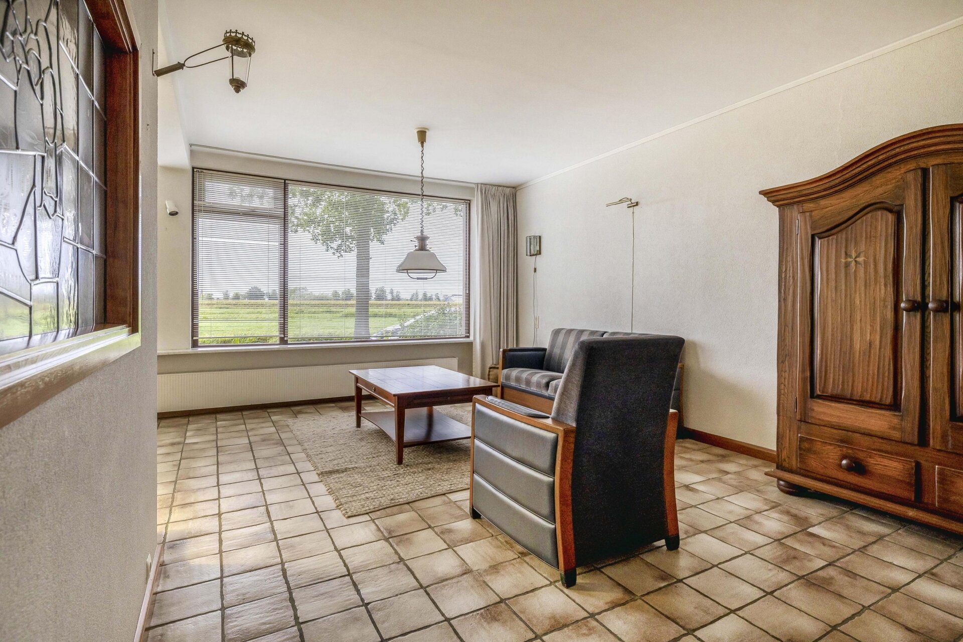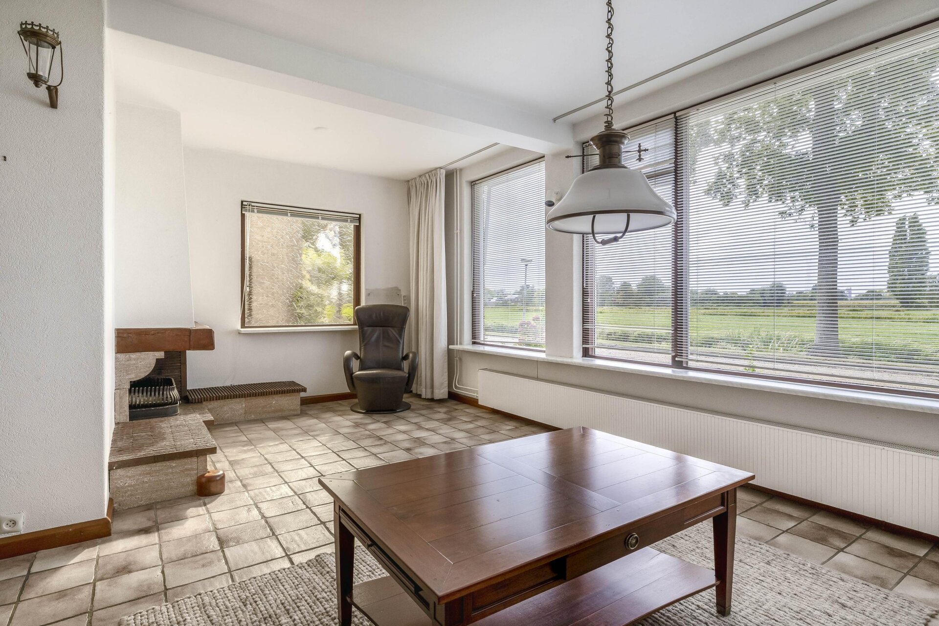 Een opvallend detail is de gezellige open haard in de hoek, die zowel sfeer als warmte brengt op koude dagen. De vloer is netjes betegeld en neutraal uitgevoerd, waardoor je hier met een beetje styling al snel je eigen sfeer kunt neerzetten.