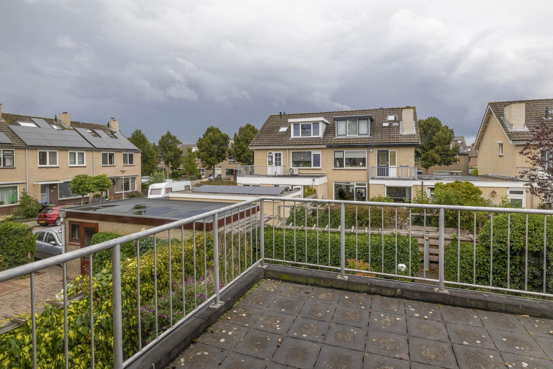 Boven de achterdeur bevindt zich een charmant balkon, toegankelijk via de badkamer. Ook handig is de aangebouwde stenen garage met kanteldeur en loopdeur – perfect voor fietsen, klussen of extra opslag.