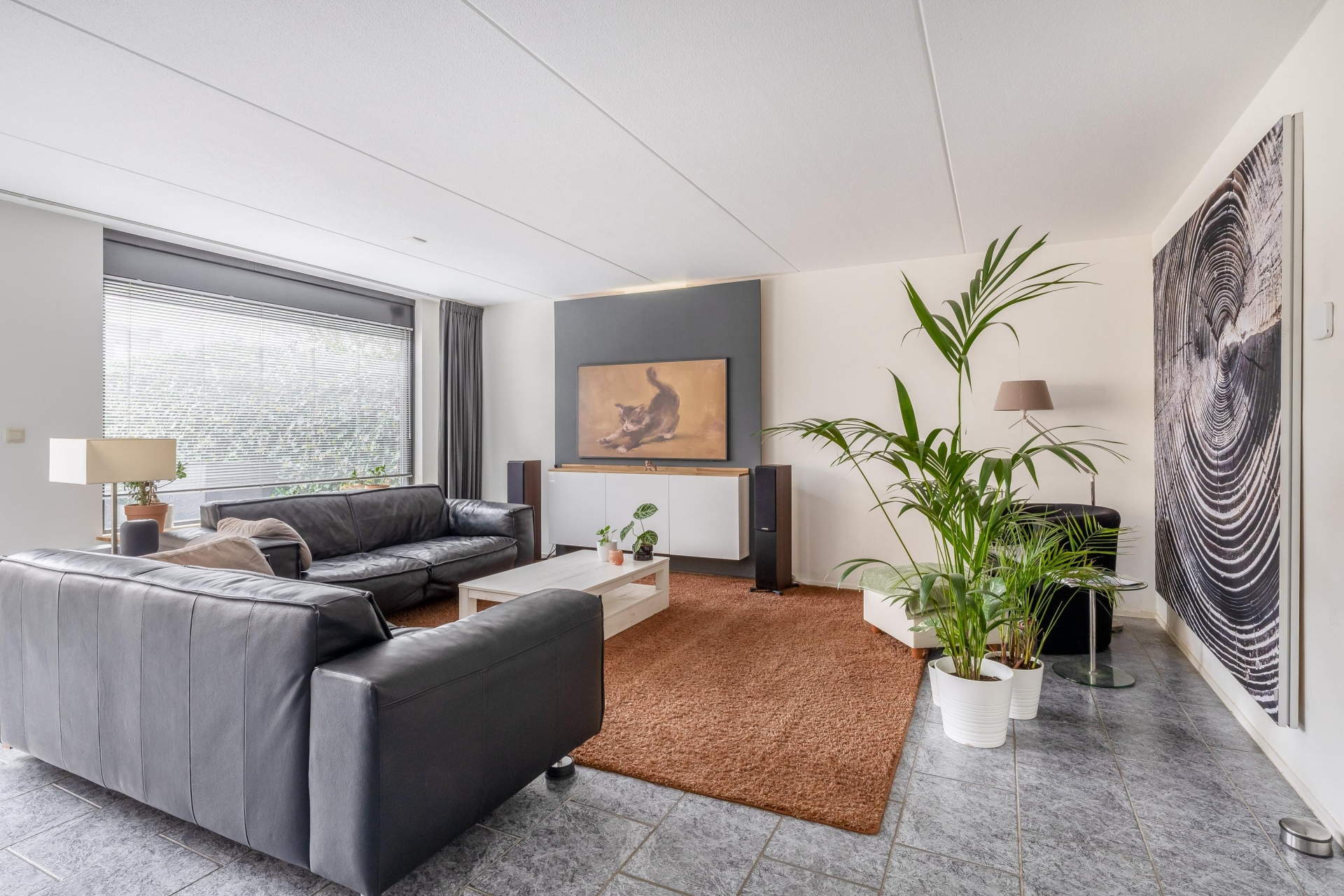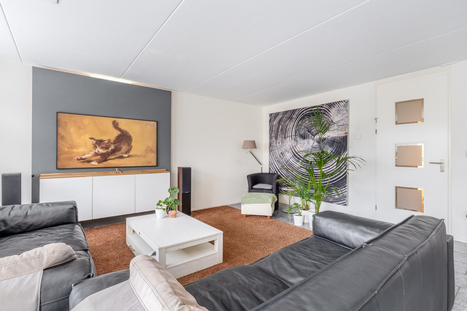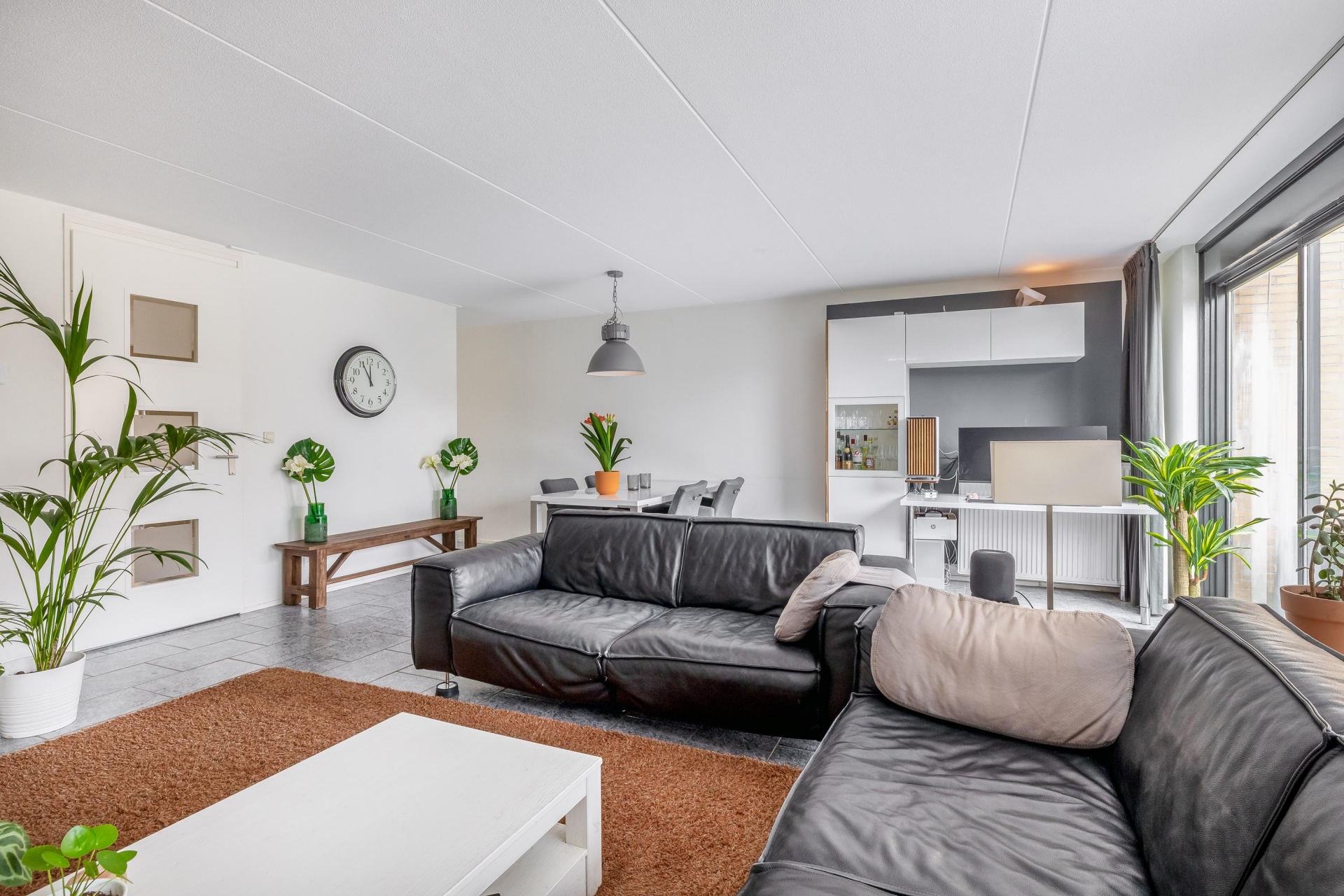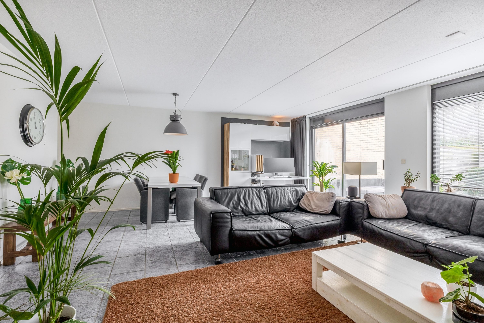De riante, tuingerichte woonkamer (38m²) is voorzien van een grote schuifpui en grenst aan de half open keuken (8m²), welke is gelegen aan de voorzijde van de woning.