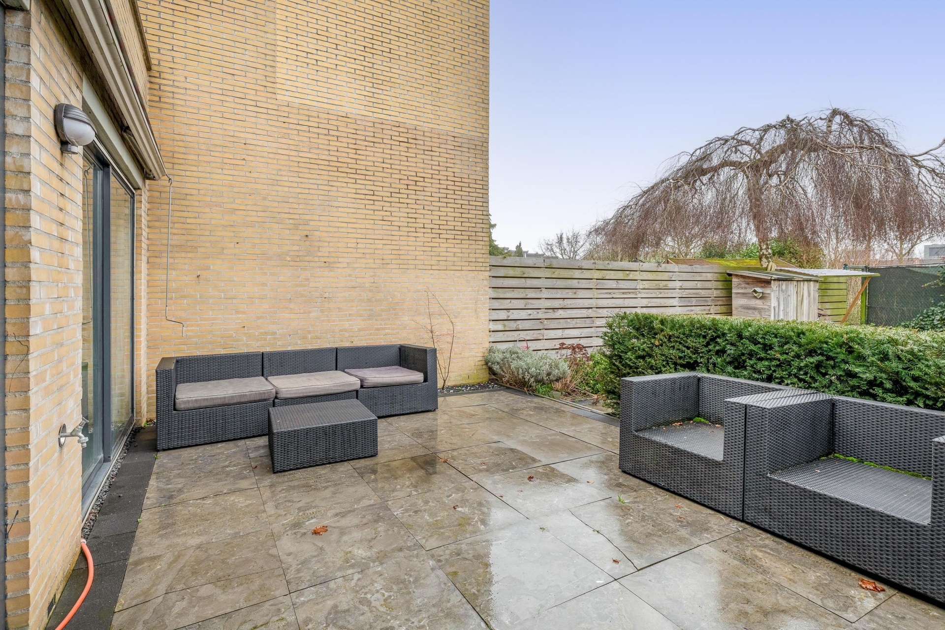 De achtertuin is vrijwel geheel omgeven door vaste groene beplanting en biedt veel privacy.