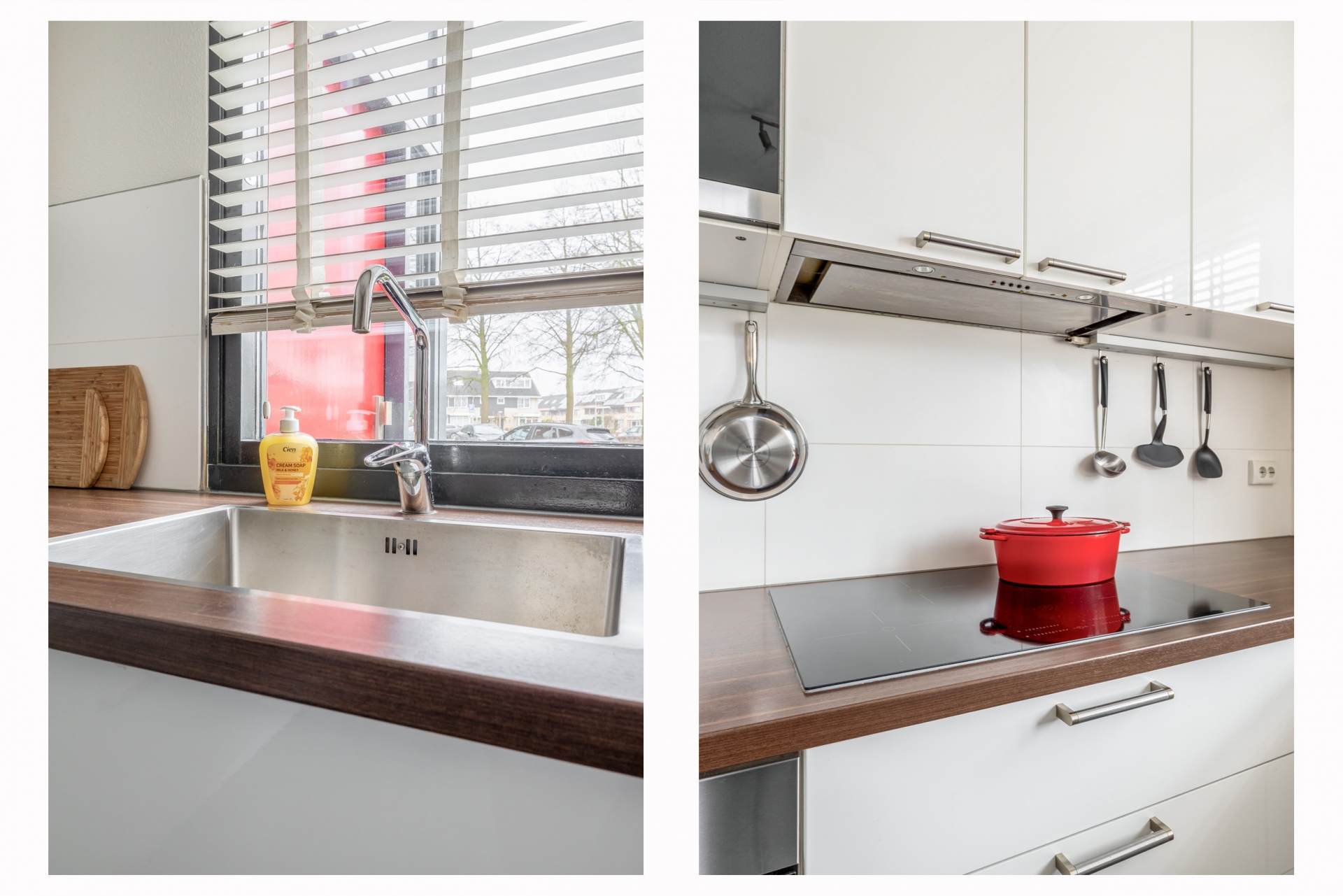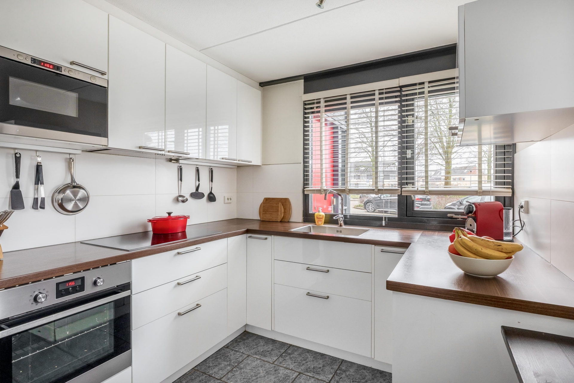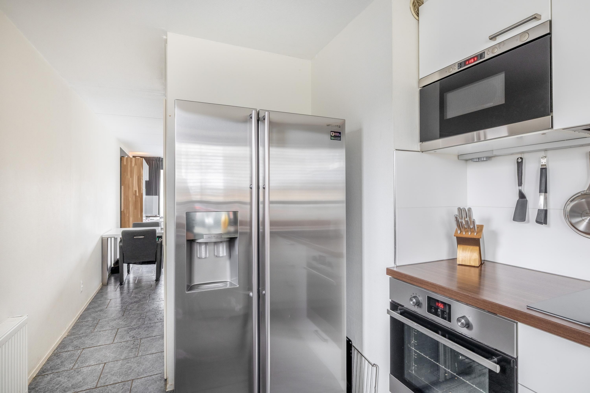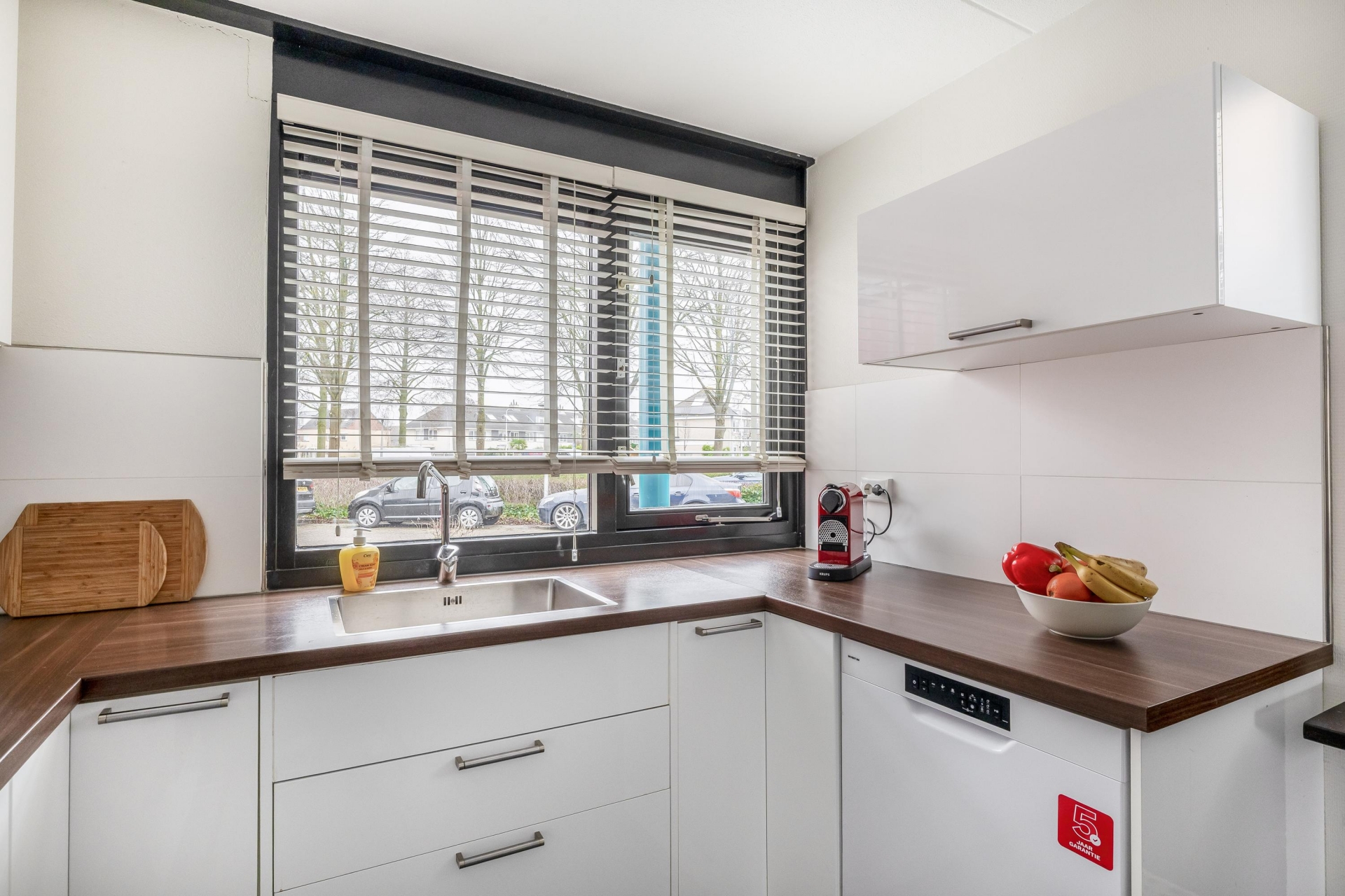 De witte hoogglans keuken is in U- opstelling geplaatst, met daarin de benodigde inbouwapparatuur waaronder een spoelbak met mengkraan, kookplaat met afzuigkap, oven, magnetron en inbouw boiler (2025). Verder beschikt de keuken over een vrijstaande vaatwasser en een Amerikaanse koelkast welke voor overname beschikbaar is.
