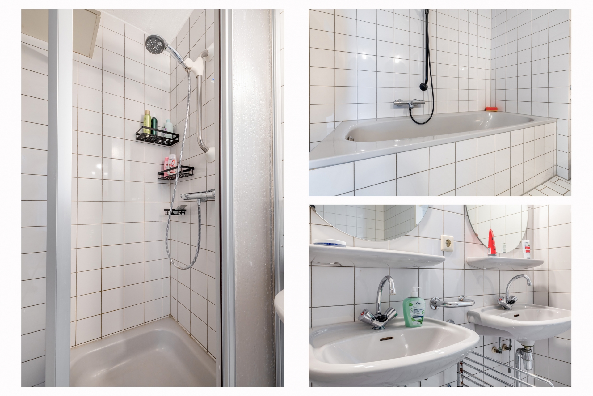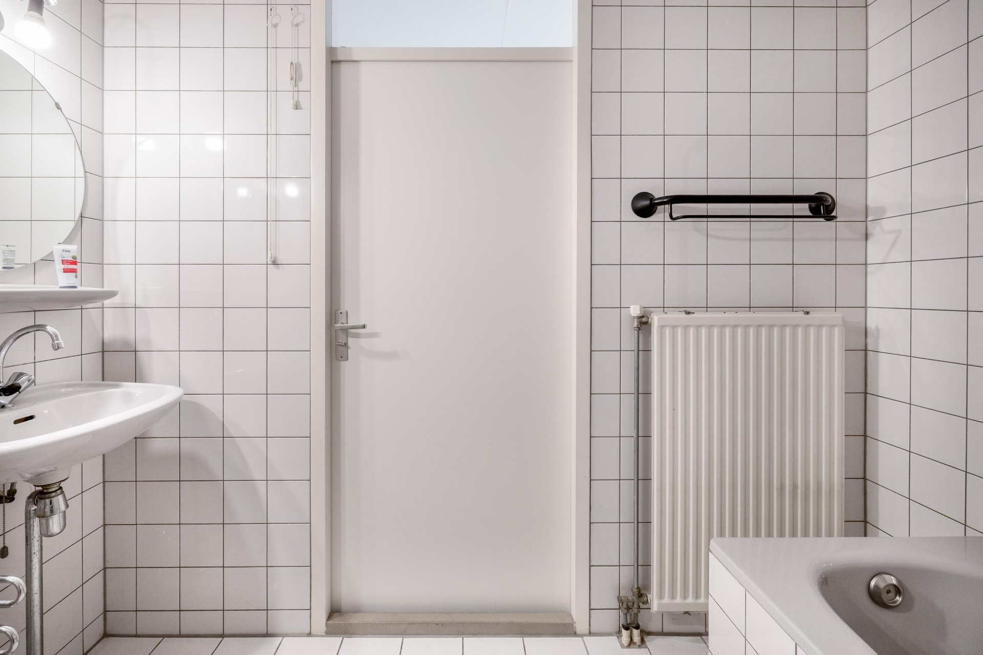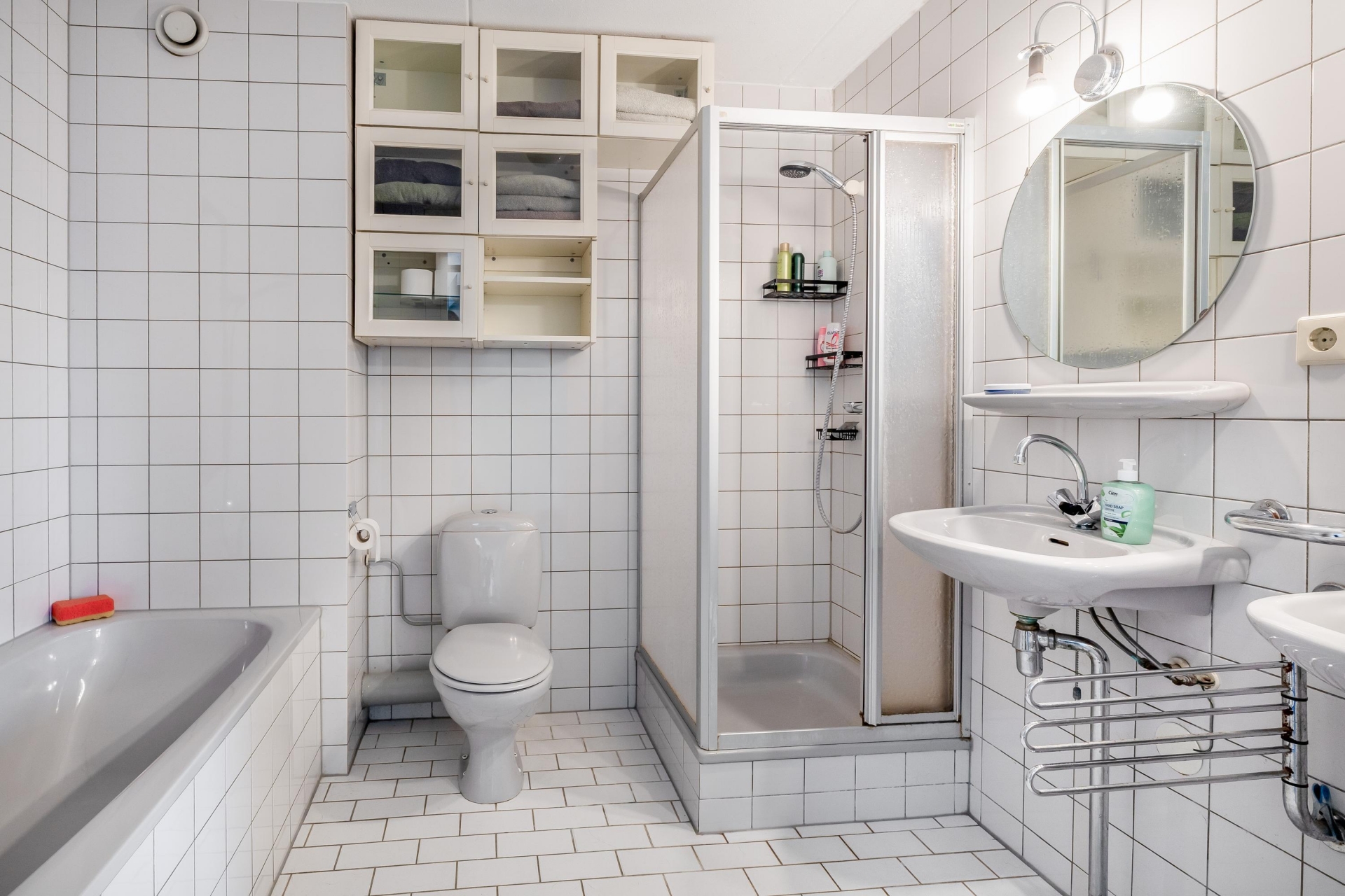 De tussengelegen badkamer (6m²) is geheel betegeld met 2 wastafels, ligbad, toilet, douche cabine en verwarmingselement