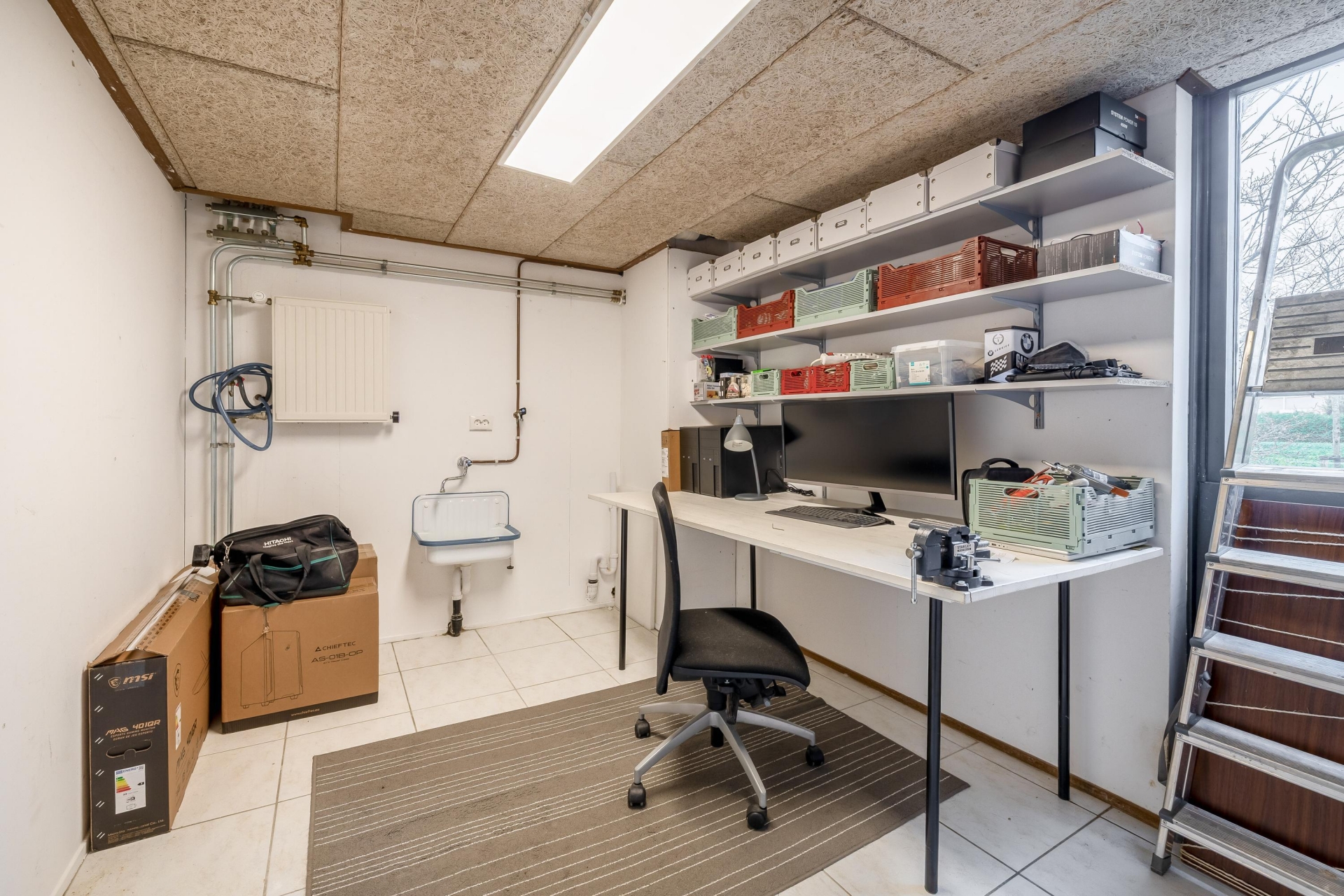 De garage is opgesplitst in een berging (6m²)met garagedeur en daarachter een werkruimte (9m²), welk vanuit de gang bereikbaar is. Deze voormalige garage is voorzien van elektra, water en verwarming.