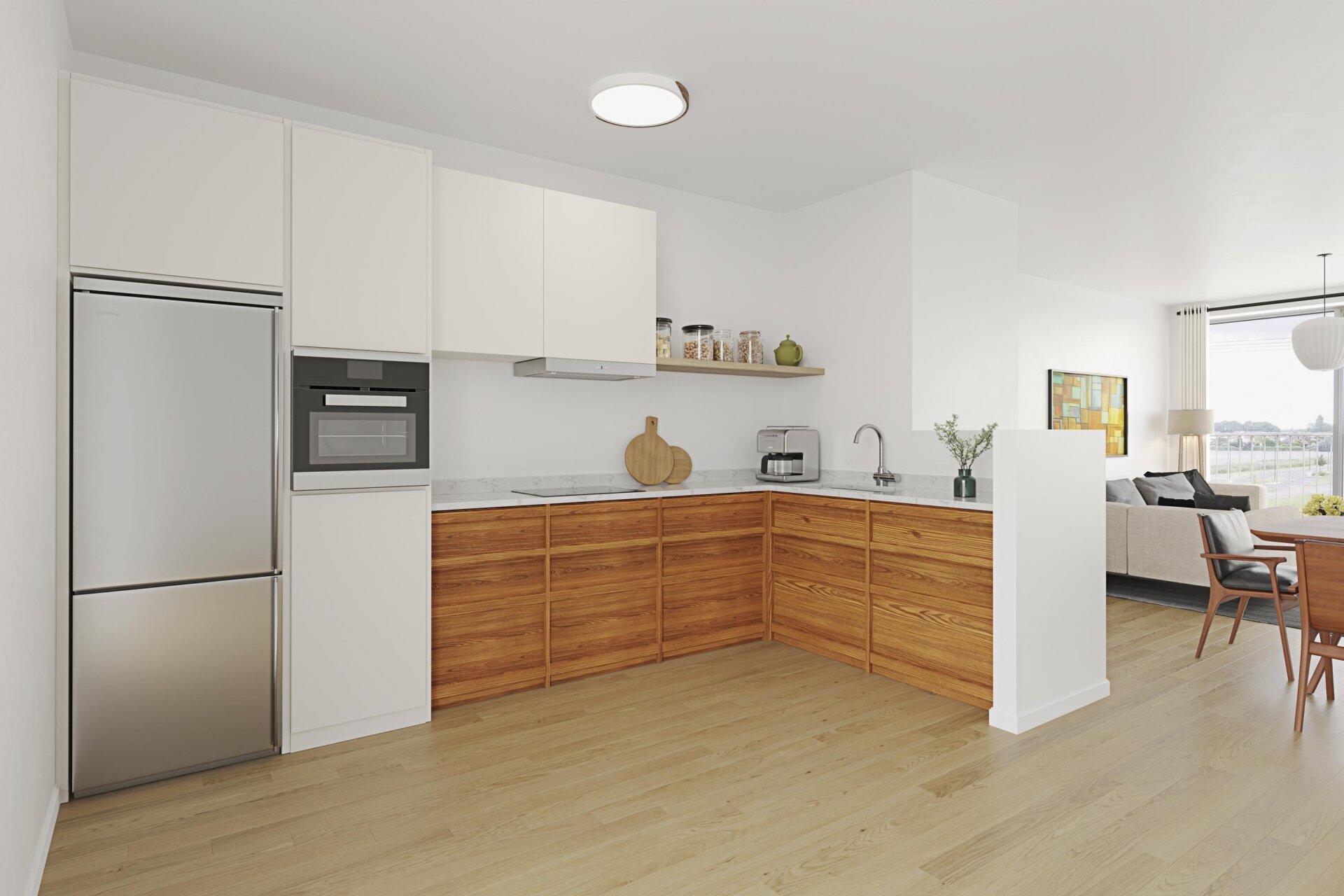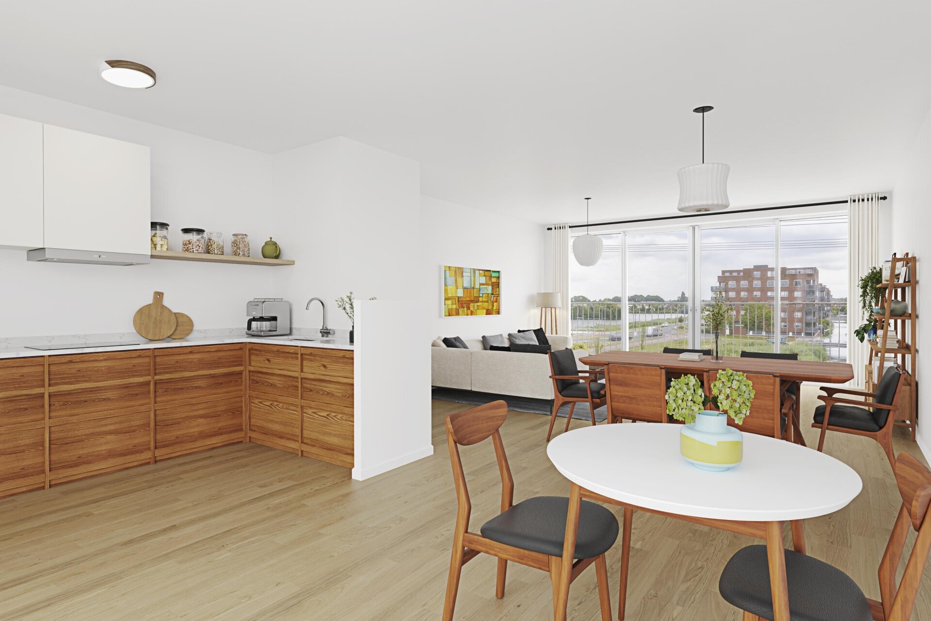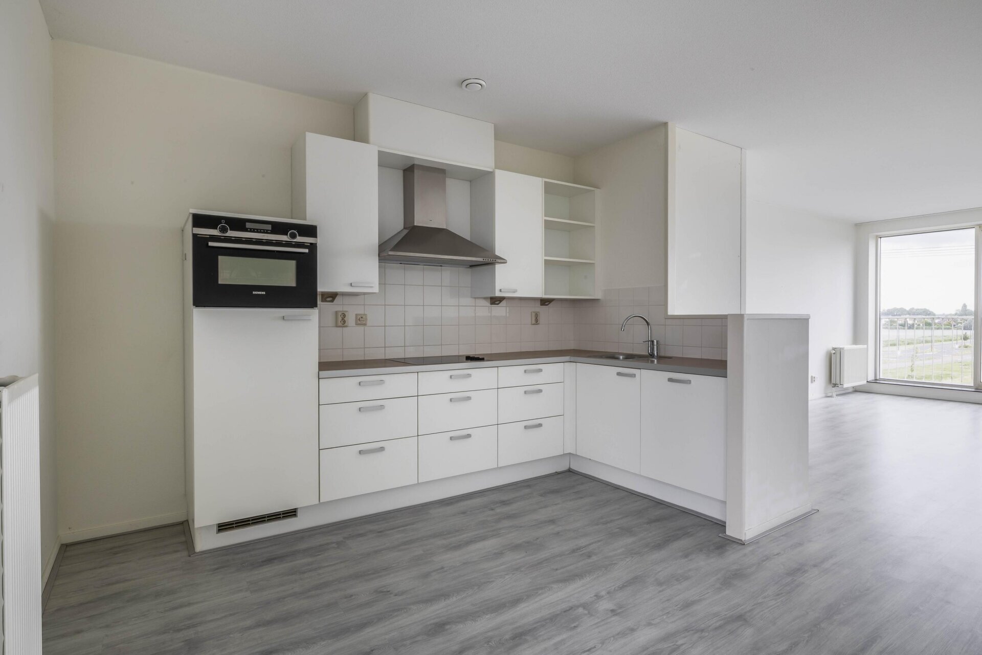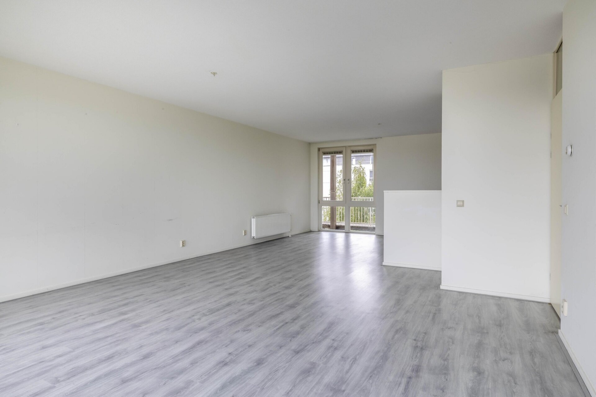 Entree, ruime hal met toegang tot 2 slaapkamers, de badkamer, een inpandige berging, het toilet, de meterkast en de woonkamer met open keuken. Er is een ruime woonkamer met complete open keuken aanwezig. Deze hebben samen een oppervlakte van bijna 50 m²! De keuken is voorzien van diverse inbouwapparatuur en biedt ruimte genoeg voor een royale eettafel. Vanuit de woonkamer is er middels een schuifpui een Frans balkon. Vanaf hier is er een waanzinnig uitzicht over het Rietveldpark!