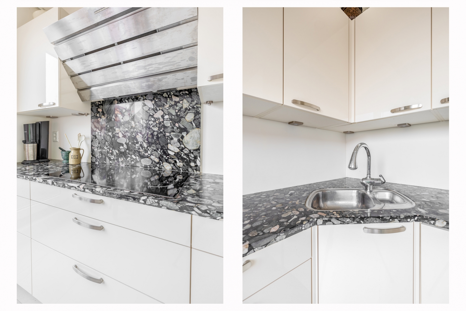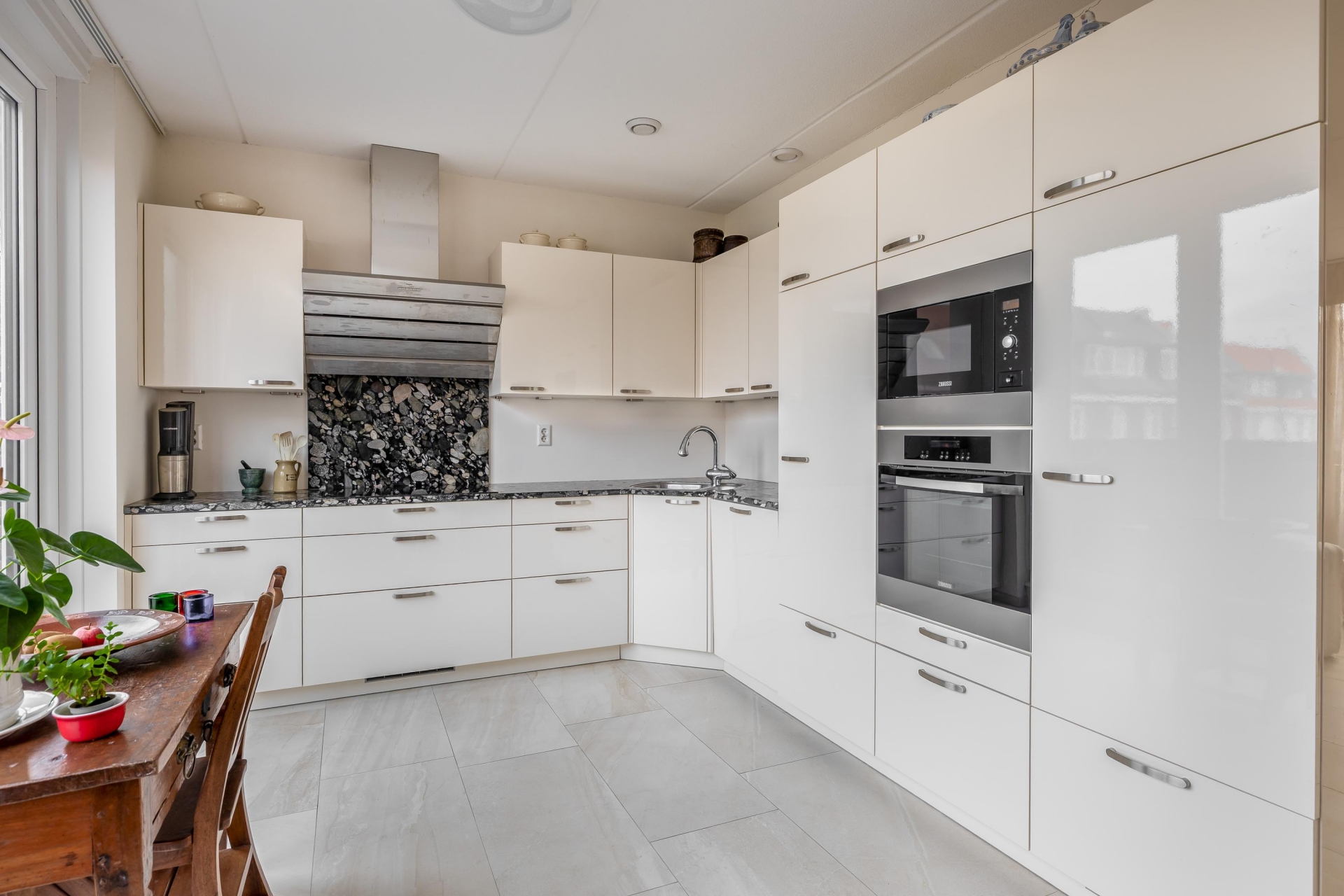 Hal met toegang tot de woonkamer. De lichte woonkamer biedt veel leefruimte en staat in open verbinding met de moderne keuken in L-opstelling, voorzien van een granieten werkblad uit Brazilië en diverse inbouwapparatuur zoals een oven, magnetron, inductiekookplaat, koelkast, vriezer, vaatwasser en afzuigkap.