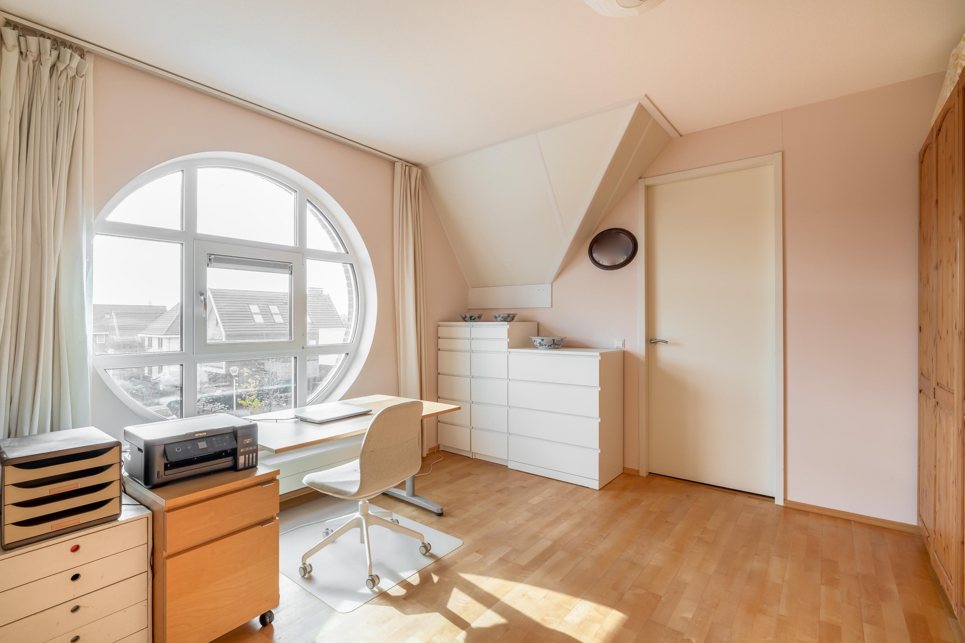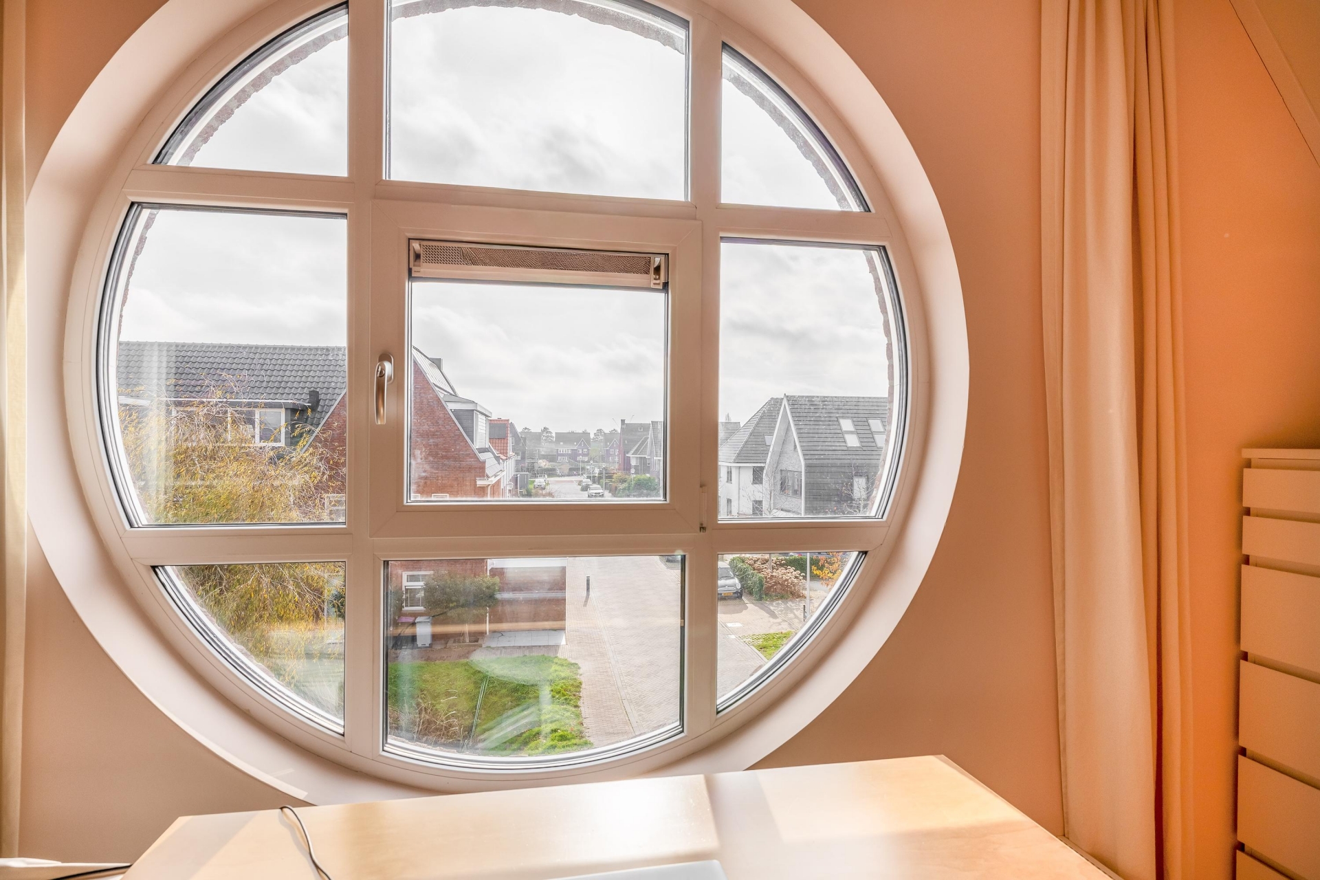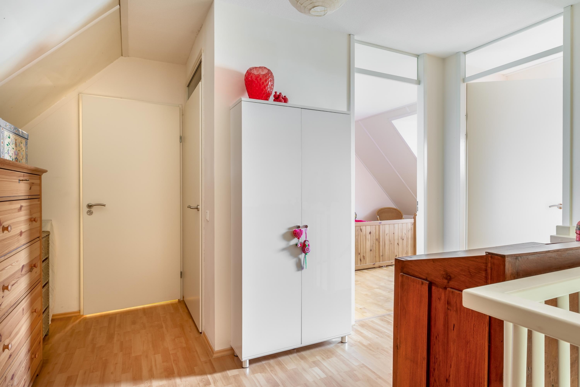 Overloop met toegang tot drie ruime slaapkamers. De hoofdslaapkamer ligt aan de voorzijde en beschikt over een groot rond raam met veel lichtinval en een vrij uitzicht. De twee slaapkamers aan de achterzijde zijn eveneens licht en praktisch ingedeeld. De twee grootste slaapkamers zijn voorzien van internet en telefoonaansluitingen.