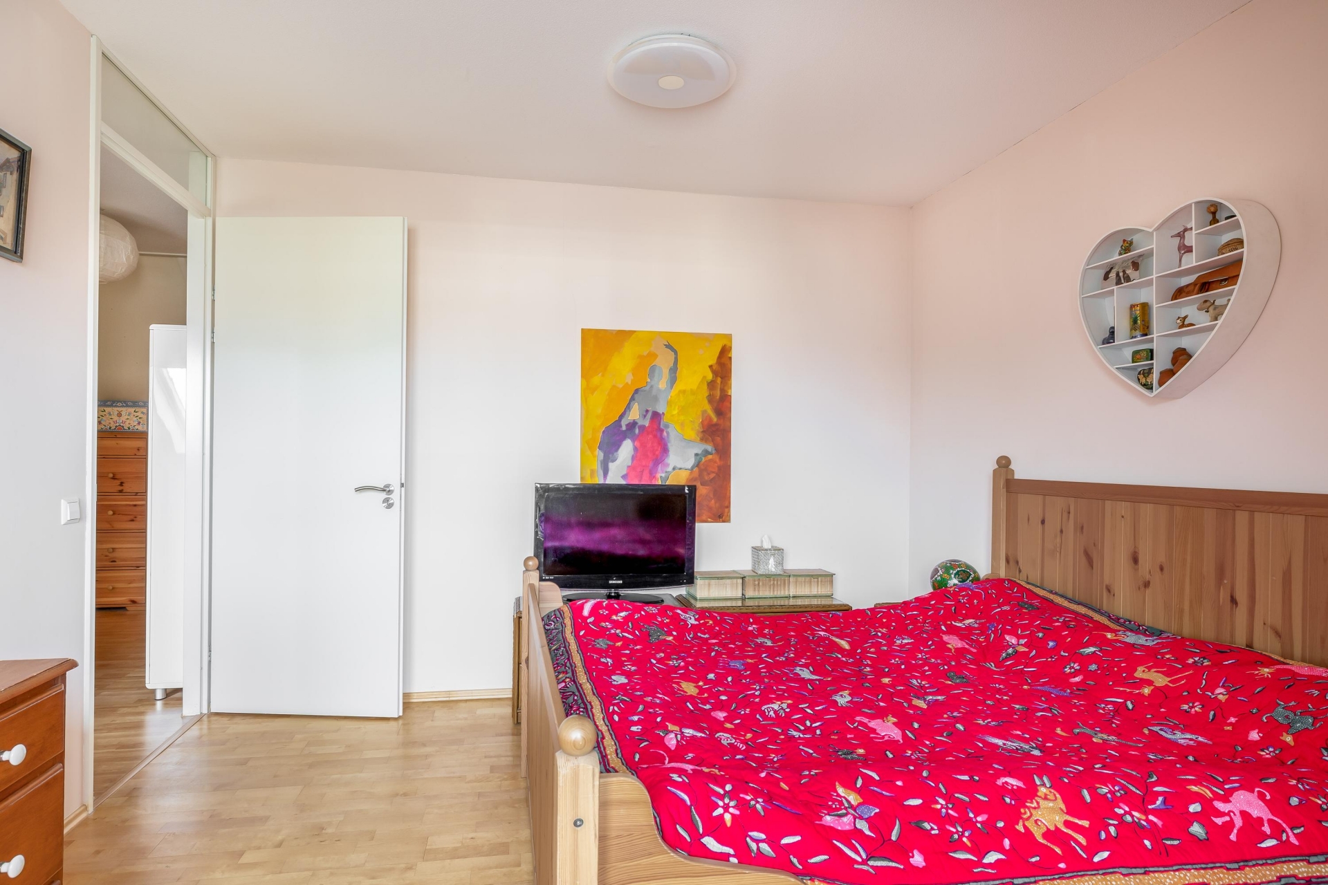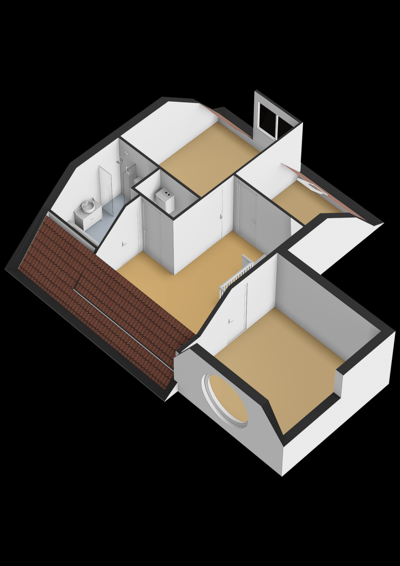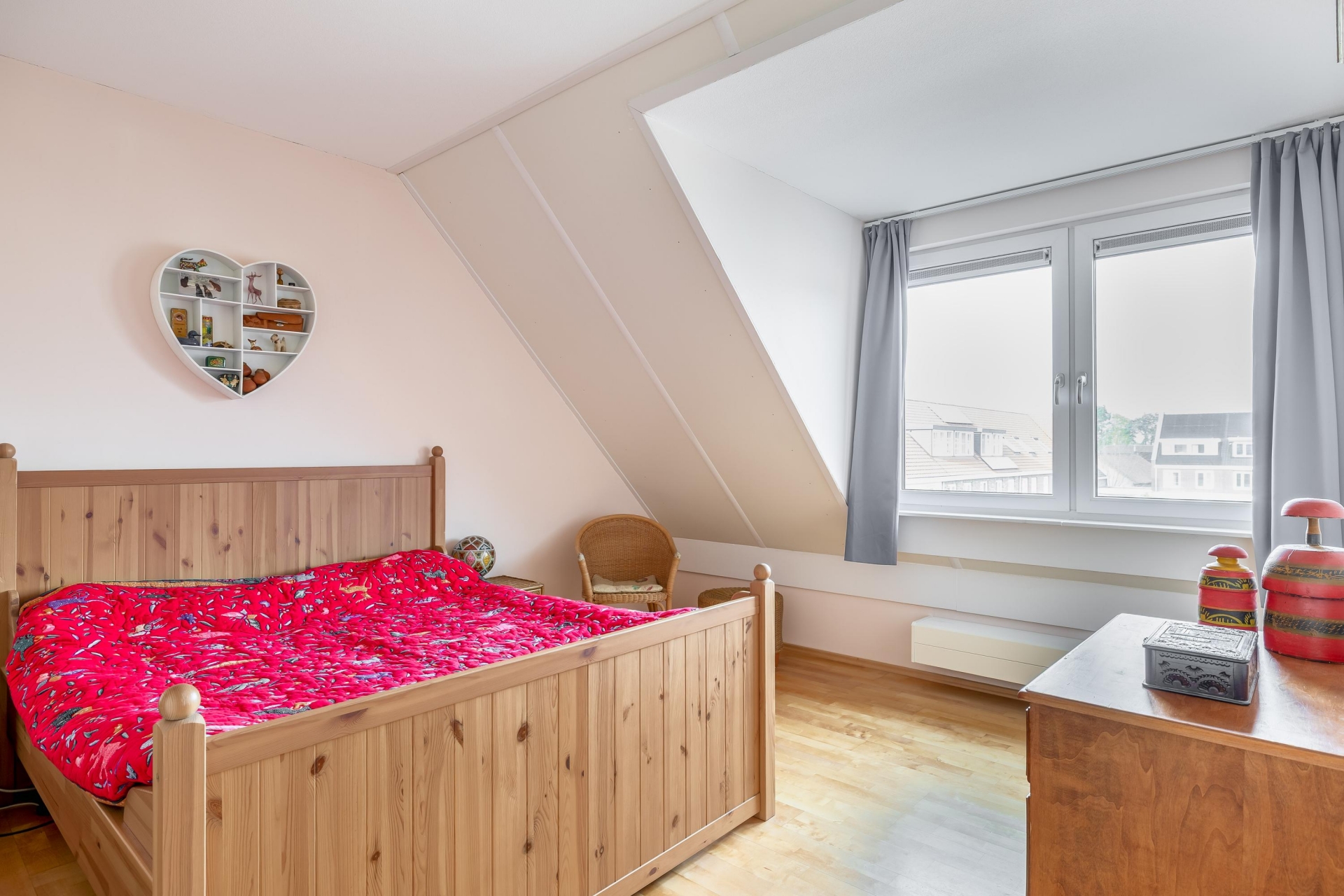 Overloop met toegang tot drie ruime slaapkamers. De hoofdslaapkamer ligt aan de voorzijde en beschikt over een groot rond raam met veel lichtinval en een vrij uitzicht. De twee slaapkamers aan de achterzijde zijn eveneens licht en praktisch ingedeeld. De twee grootste slaapkamers zijn voorzien van internet en telefoonaansluitingen.