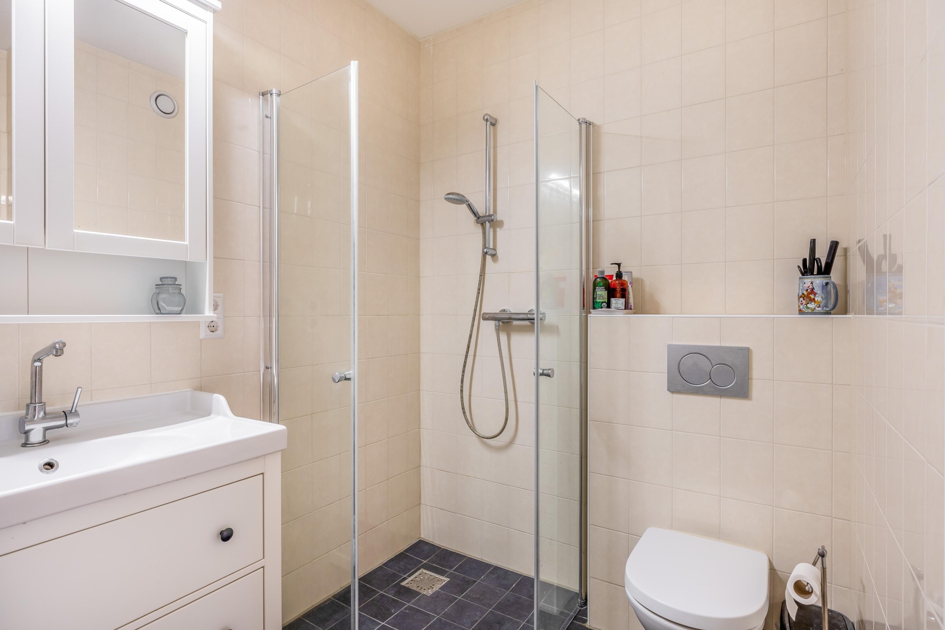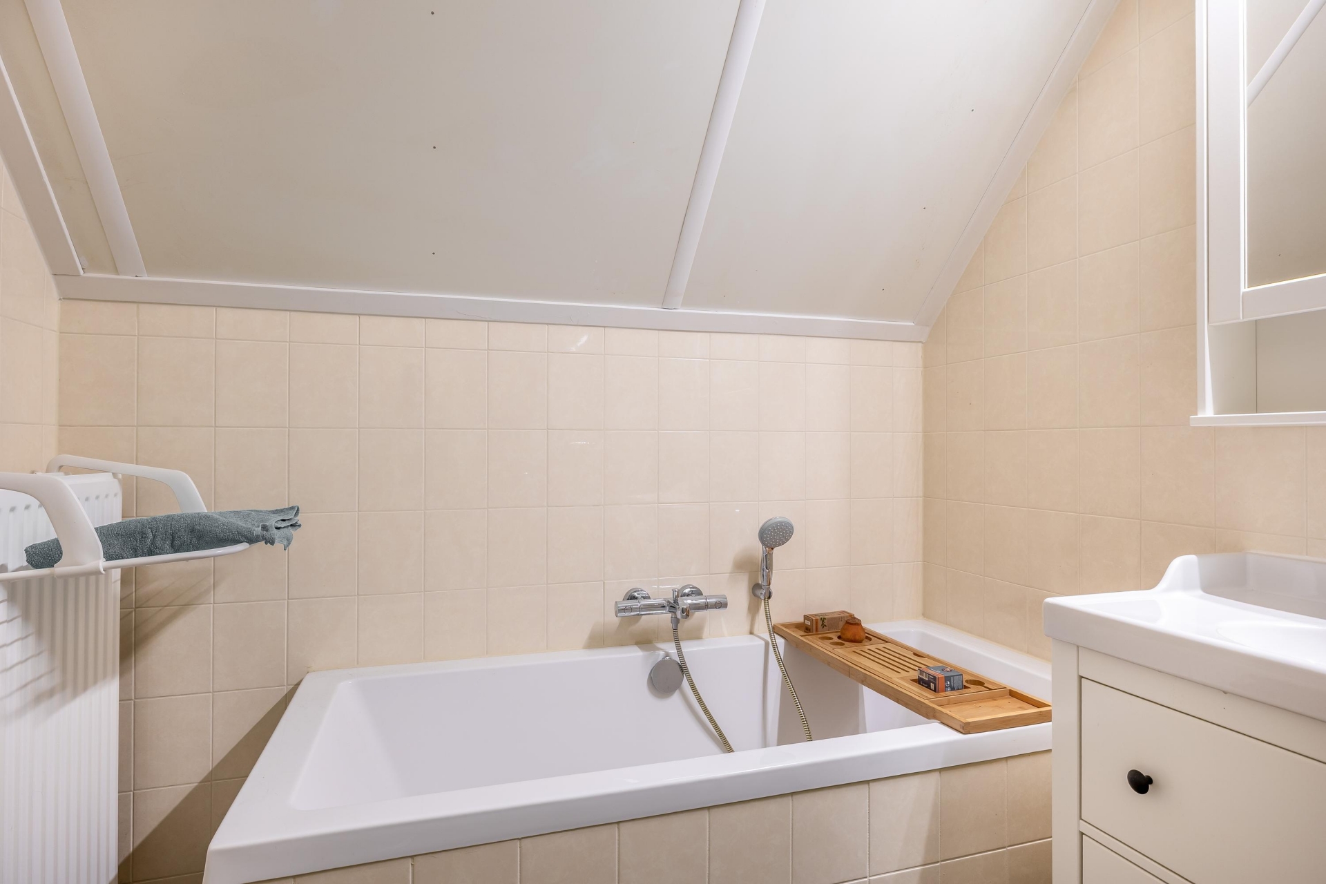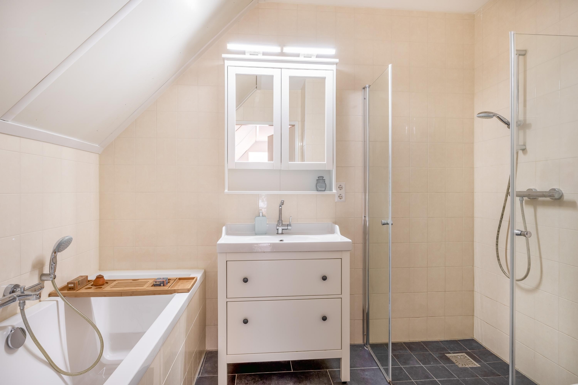 De badkamer beschikt over een inloopdouche, ligbad, wastafelmeubel, een tweede toilet en vloerverwarming. Naast de badkamer is er een technische ruimte met de DUCO ventilatie-unit, cv-combiketel en aansluitingen voor wasmachine en droger.