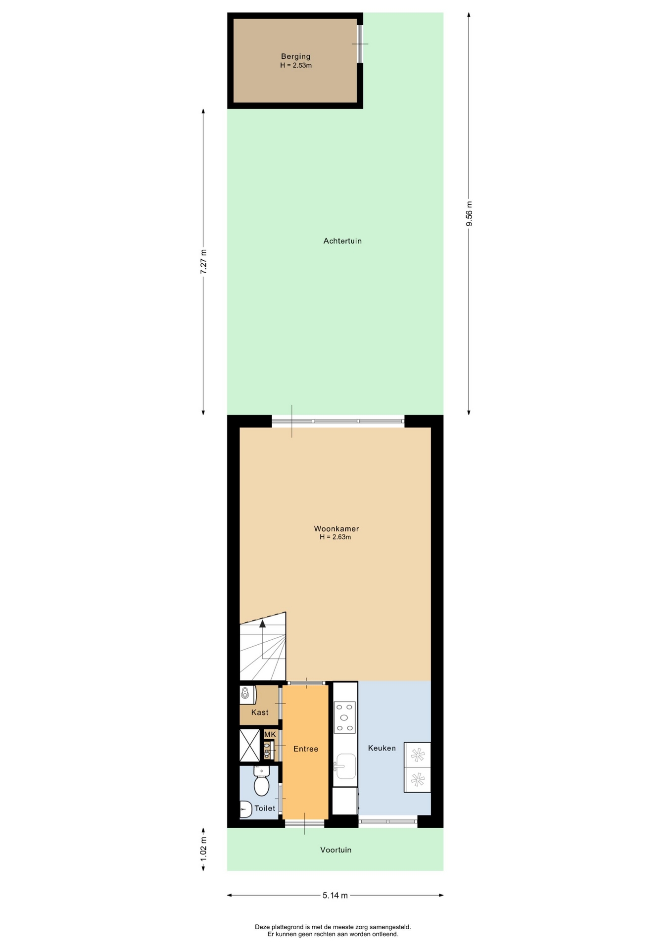 Entree naar de woning via voortuin; hal met meterkast; toiletruimte met toilet en fonteintje; lichte woonkamer voorzien van een halfopen keuken in wandopstelling aan de voorzijde van de woning. De keuken is uitgevoerd met diverse inbouwapparatuur waaronder een 5 pits gaskookplaat, koelkast, vaatwasser en afzuigkap; aan de achterzijde de ruime achtertuin met berging met elektra en een achterom naar de parkeerplaats.