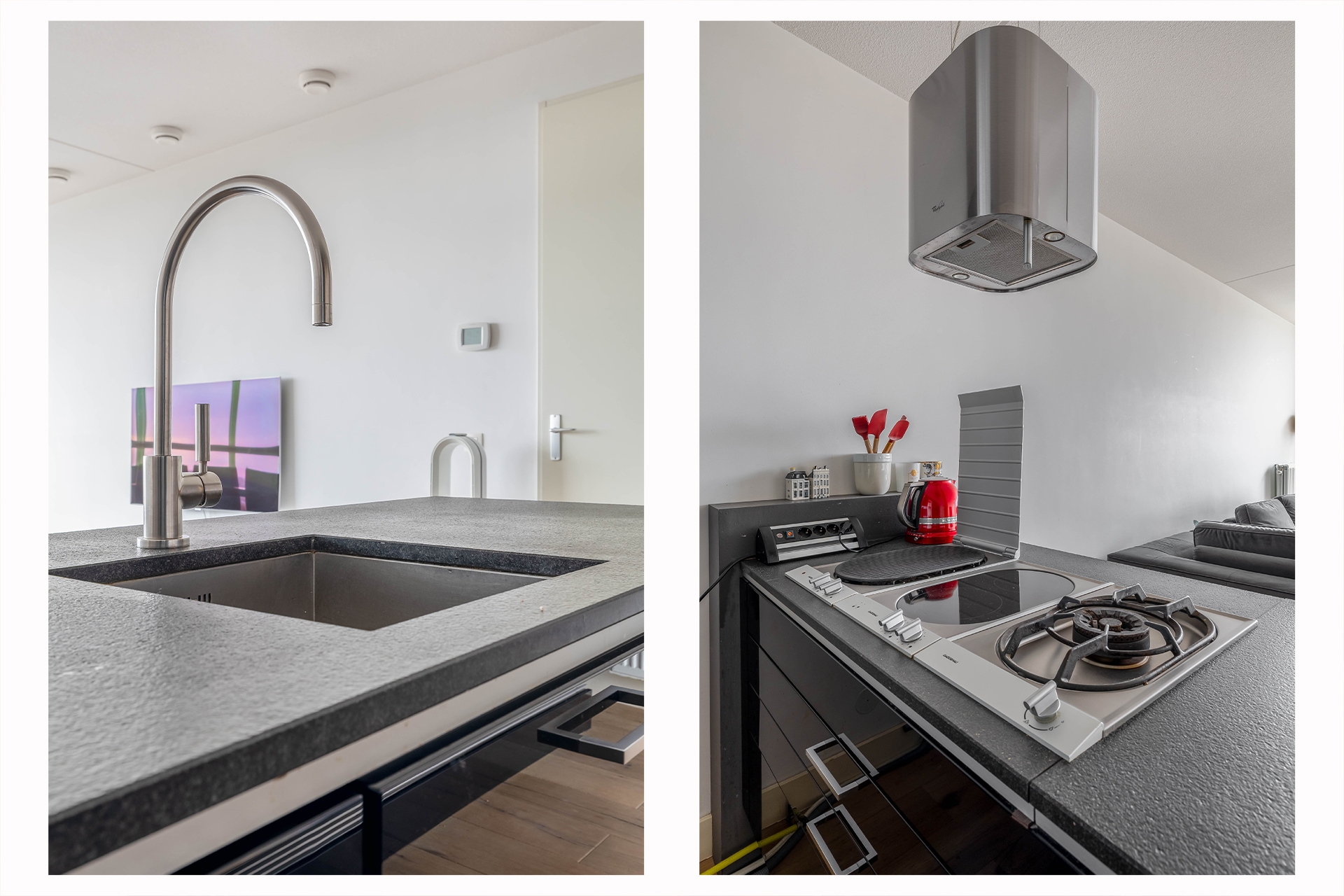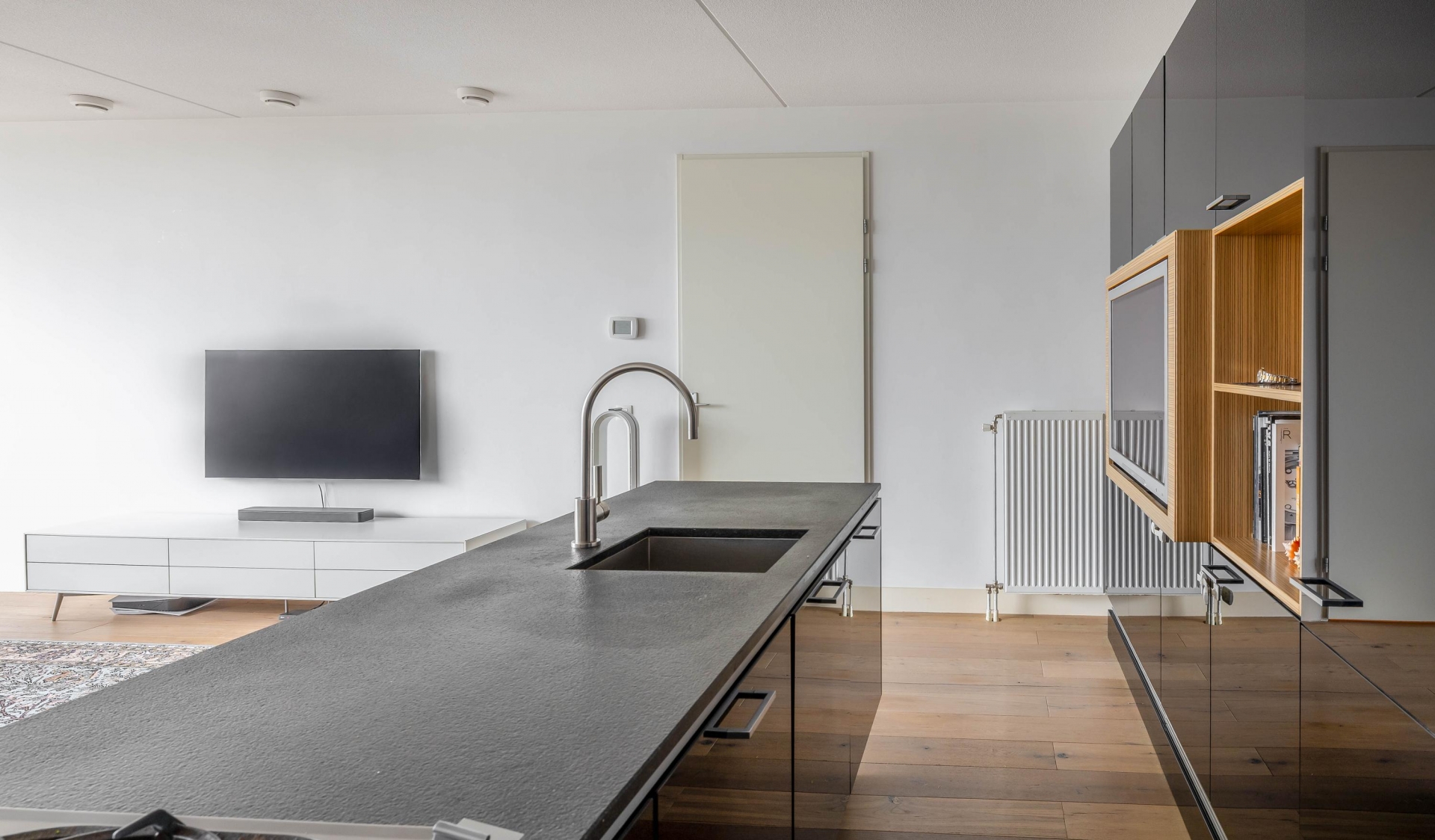 Entree, met toegang tot de vertrekken, 2 slaapkamers, de badkamer, het toilet, een technische ruimte en een inpandige berging. Aan het einde van de hal bevindt zich de woonkamer met open keuken. Het eerste wat opvalt bij het betreden van deze ruimte is het waanzinnige uitzicht. Hier vind je de stijlvolle, open keuken met een strak zwart front en een ruim kookeiland van Poggenpohl en voorzien van Gaggenau apparatuur. De opstelling zorgt voor veel werkruimte én een fijne connectie met de woonkamer ideaal voor wie graag kookt en tegelijk contact houdt met gasten of gezinsleden. Het eetgedeelte grenst direct aan de keuken en heeft, net als de zithoek, volop licht en uitzicht. Overdag is het hier heerlijk vertoeven met een boek of een kop koffie, terwijl je 's avonds geniet van de zonsondergang.