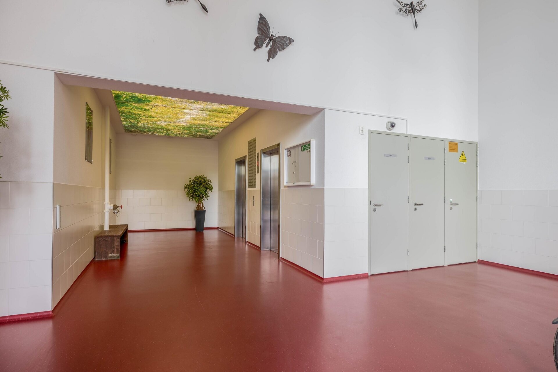 Via de afgesloten entree met videofooninstallatie en brievenbussen kom je in de centrale hal met toegang tot de liften, het trappenhuis, de gezamenlijke fietsenberging en de containerruimte. Met de lift bereik je zowel het parkeerdek op de 1e verdieping als het appartement op de 14e verdieping.
