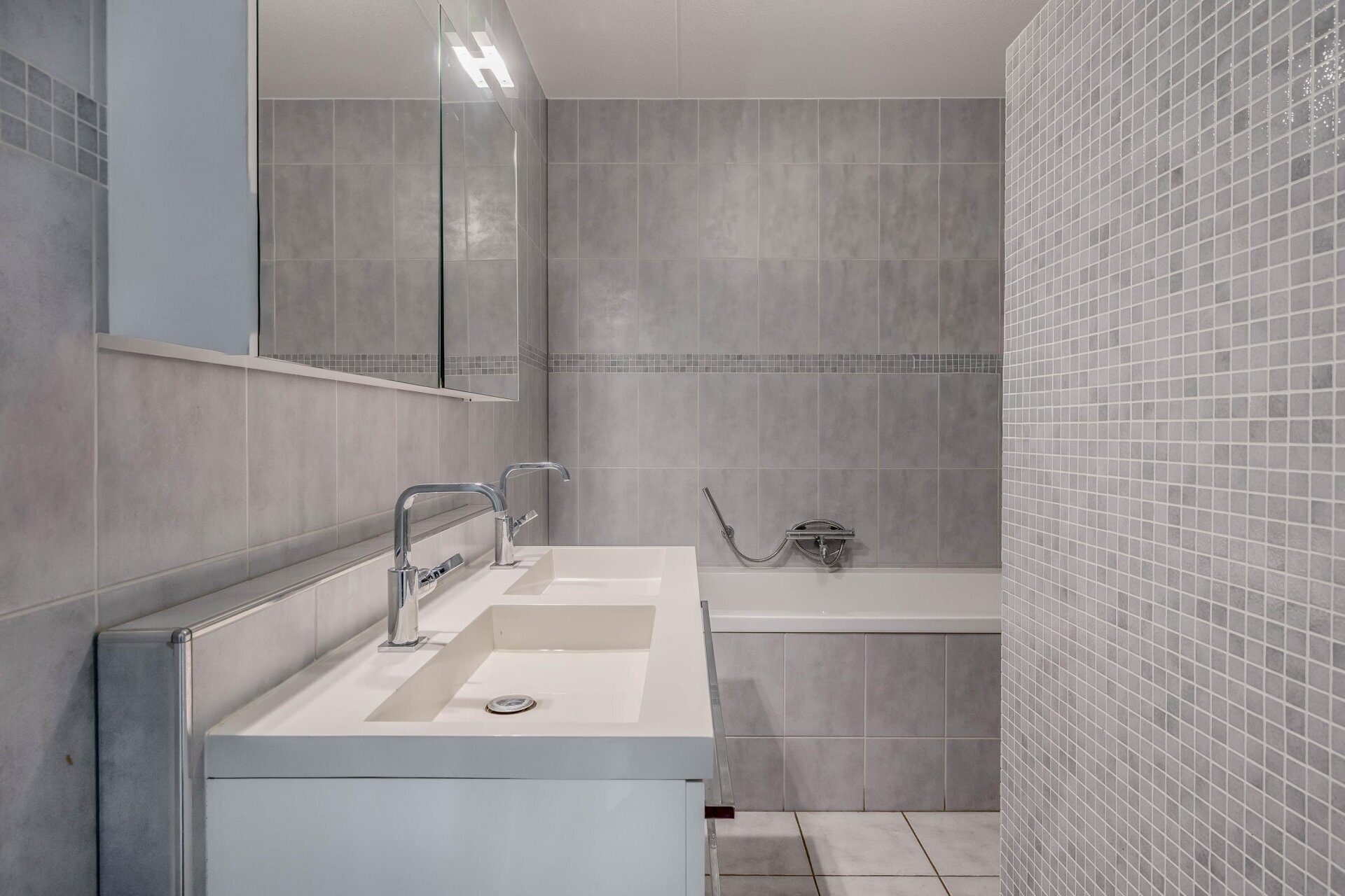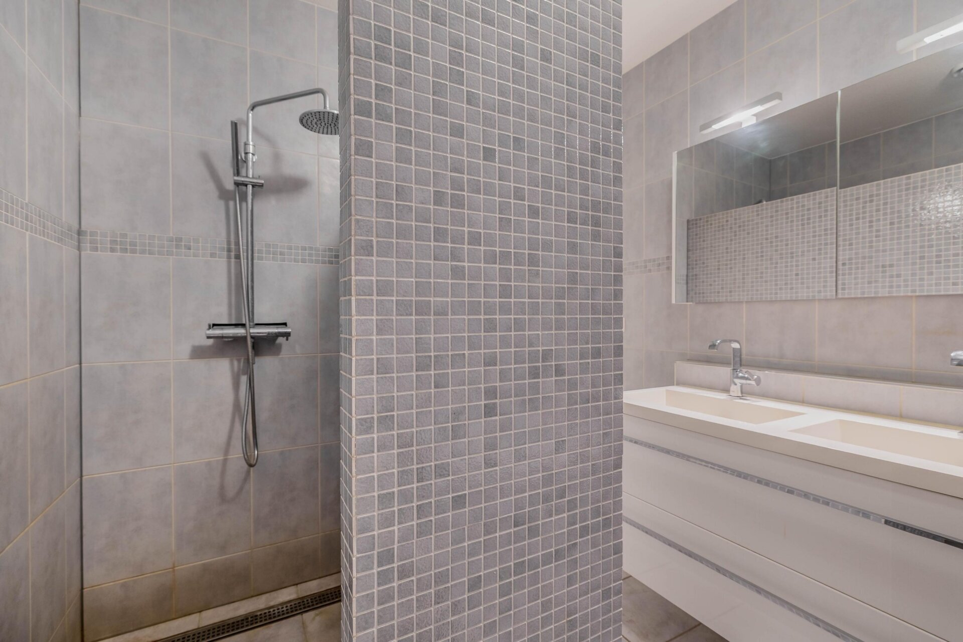De ruime badkamer beschikt over een inloopdouche met hand- én regendouche, een ligbad, een dubbele wastafel met meubel en een designradiator. In de technische ruimte vind je de aansluitingen voor wasmachine en droger, evenals de opstelplaats van de cv-ketel en de WTW-installatie. Het aparte toilet is uitgerust met een hangend closet, fonteintje en toiletmeubel.
