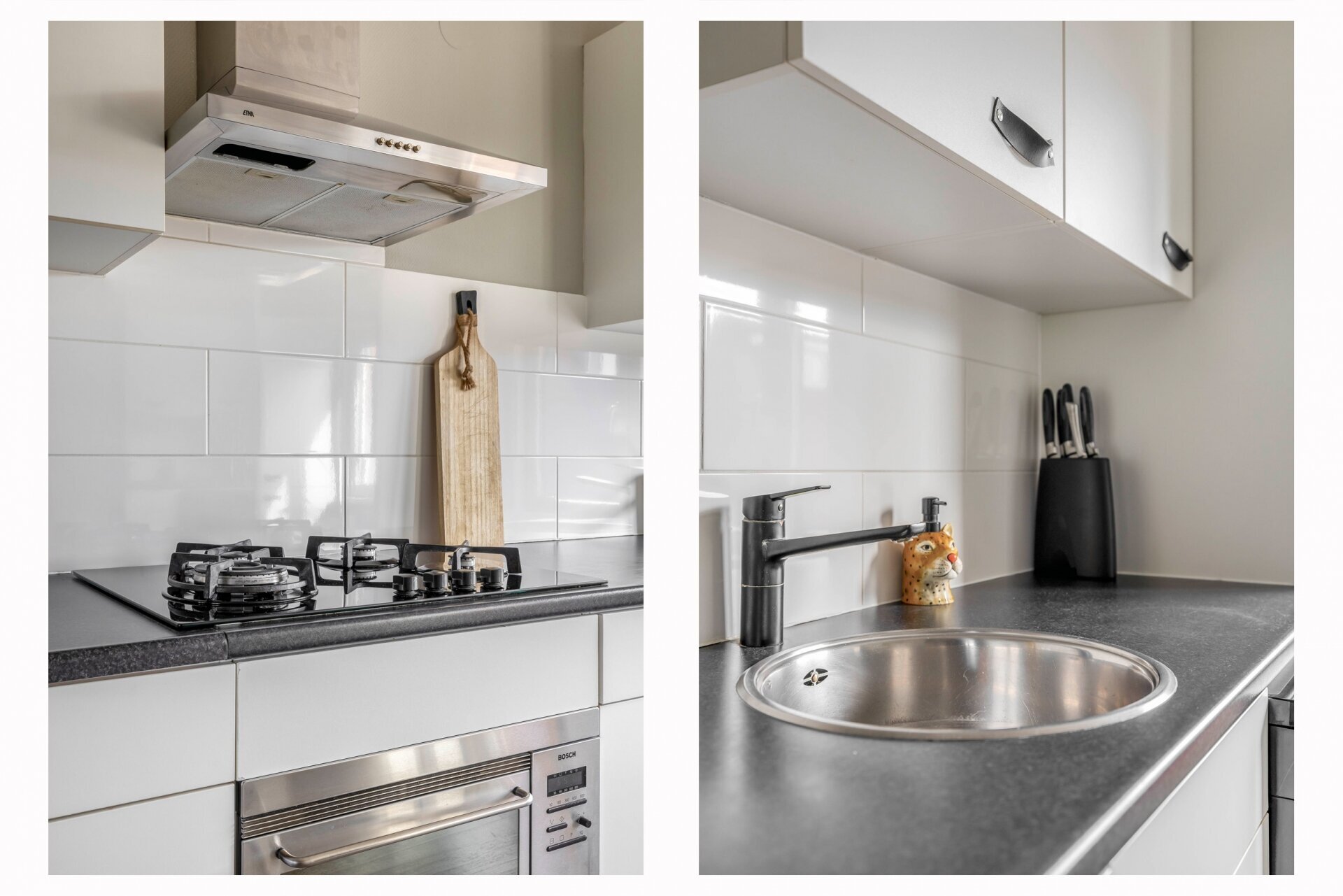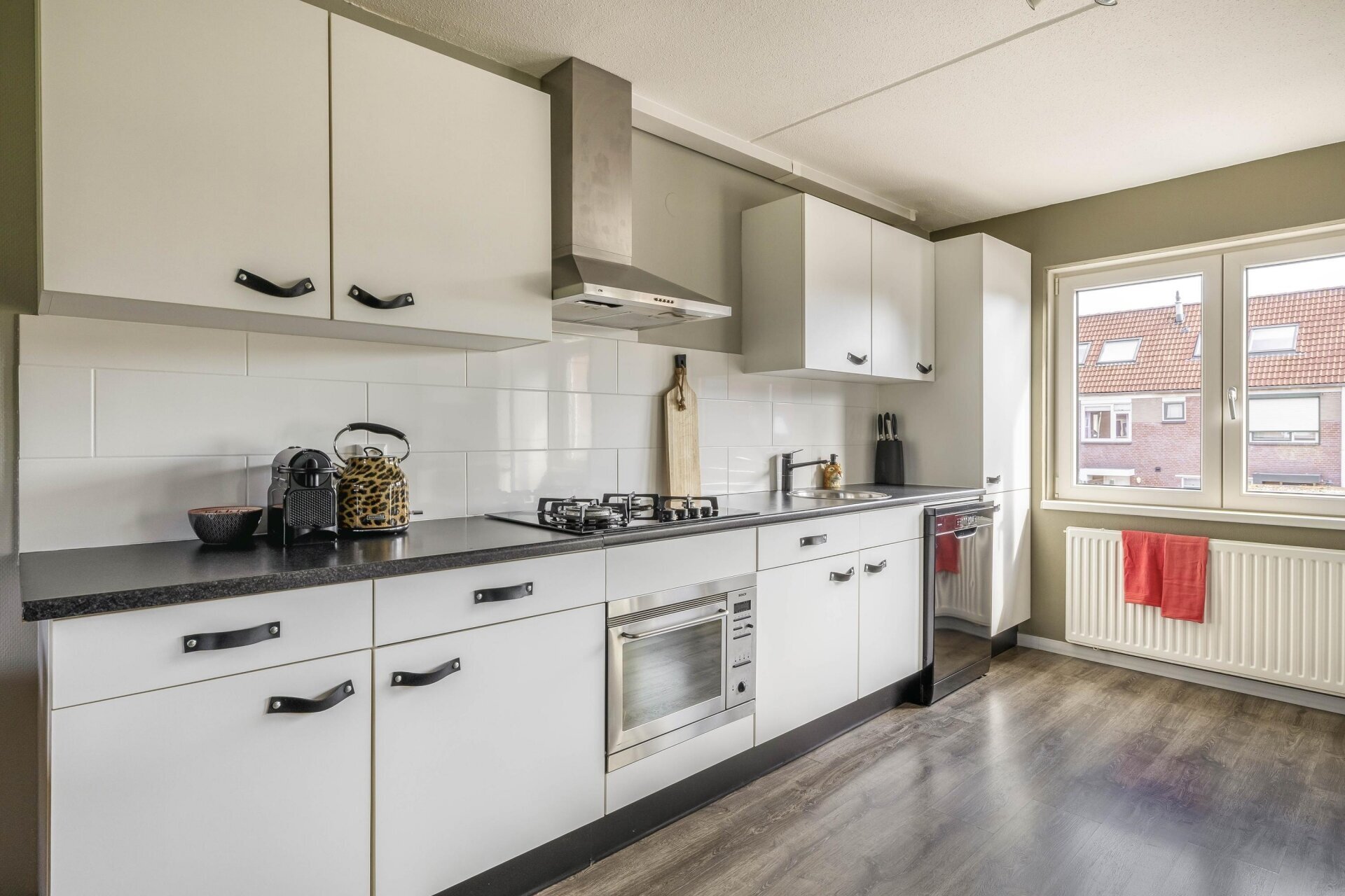 Aan de voorzijde ligt de moderne, strakke keuken. De keuken is in lichte kleurstelling uitgevoerd met contrasterend werkblad en voorzien van diverse apparatuur, zoals een vaatwasser, koel-vriescombinatie, combioven-magnetron. Dankzij het grote raam en de ligging op de eerste verdieping, heb je ook hier prettig licht en een zichtlijn naar de voortuin.