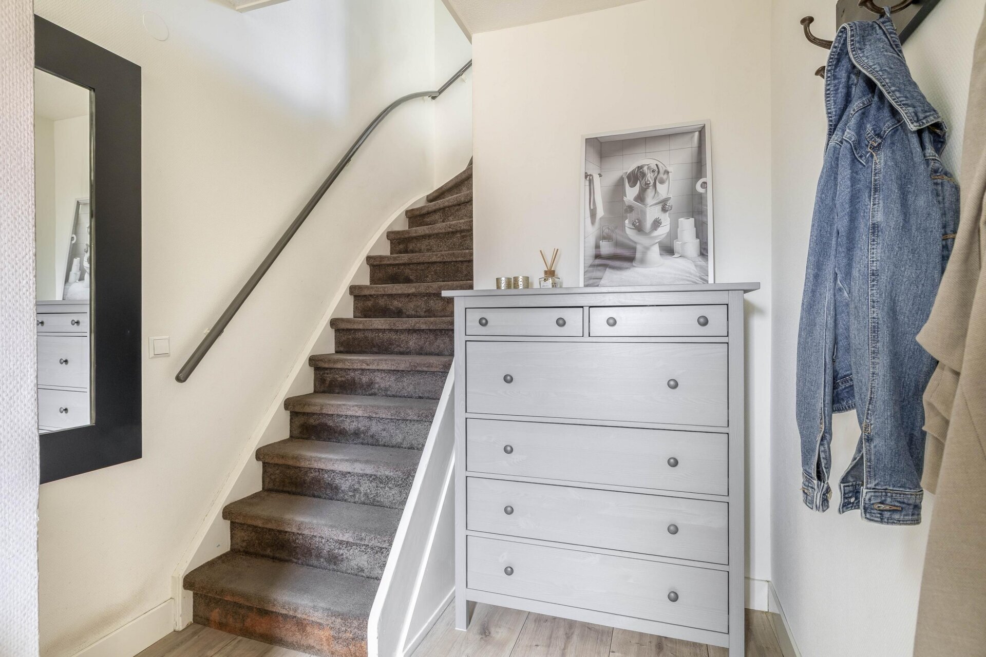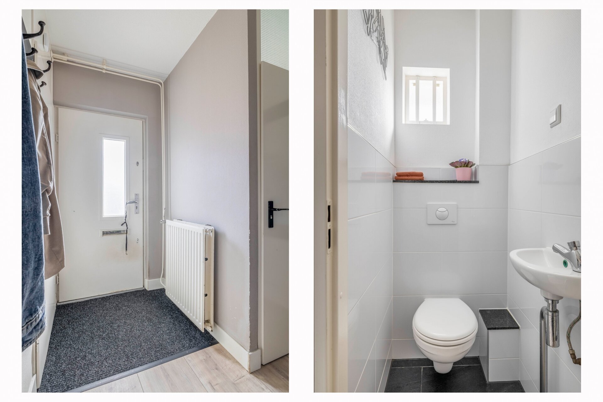De woning is voorzien van 2 entree's. De linker entree geeft toegang naar de hal, met toilet en trapopgang naar de woonkamer, die bevindt zich nu namelijk op de eerste verdieping.