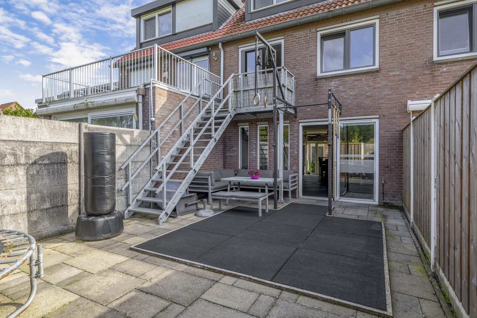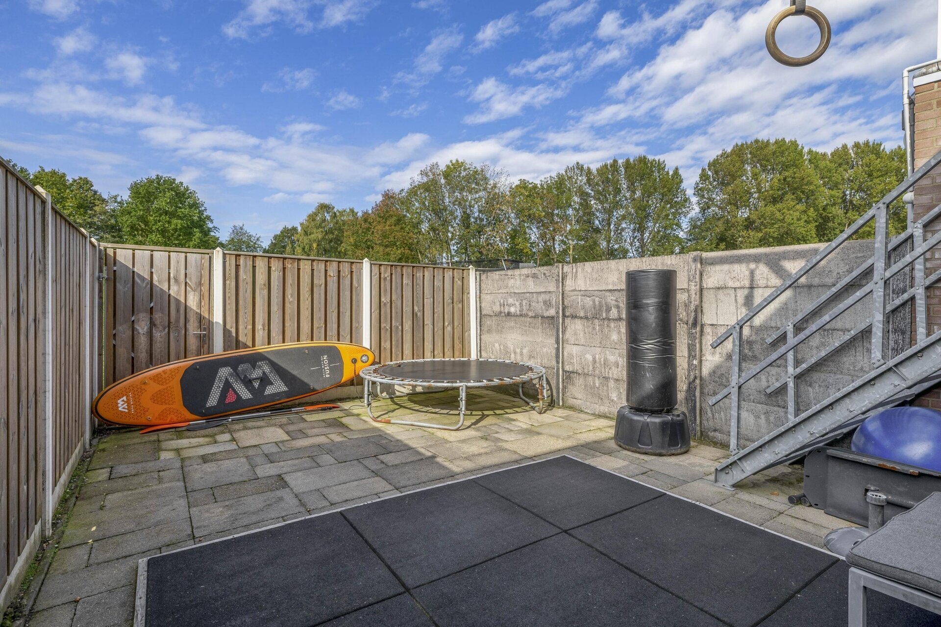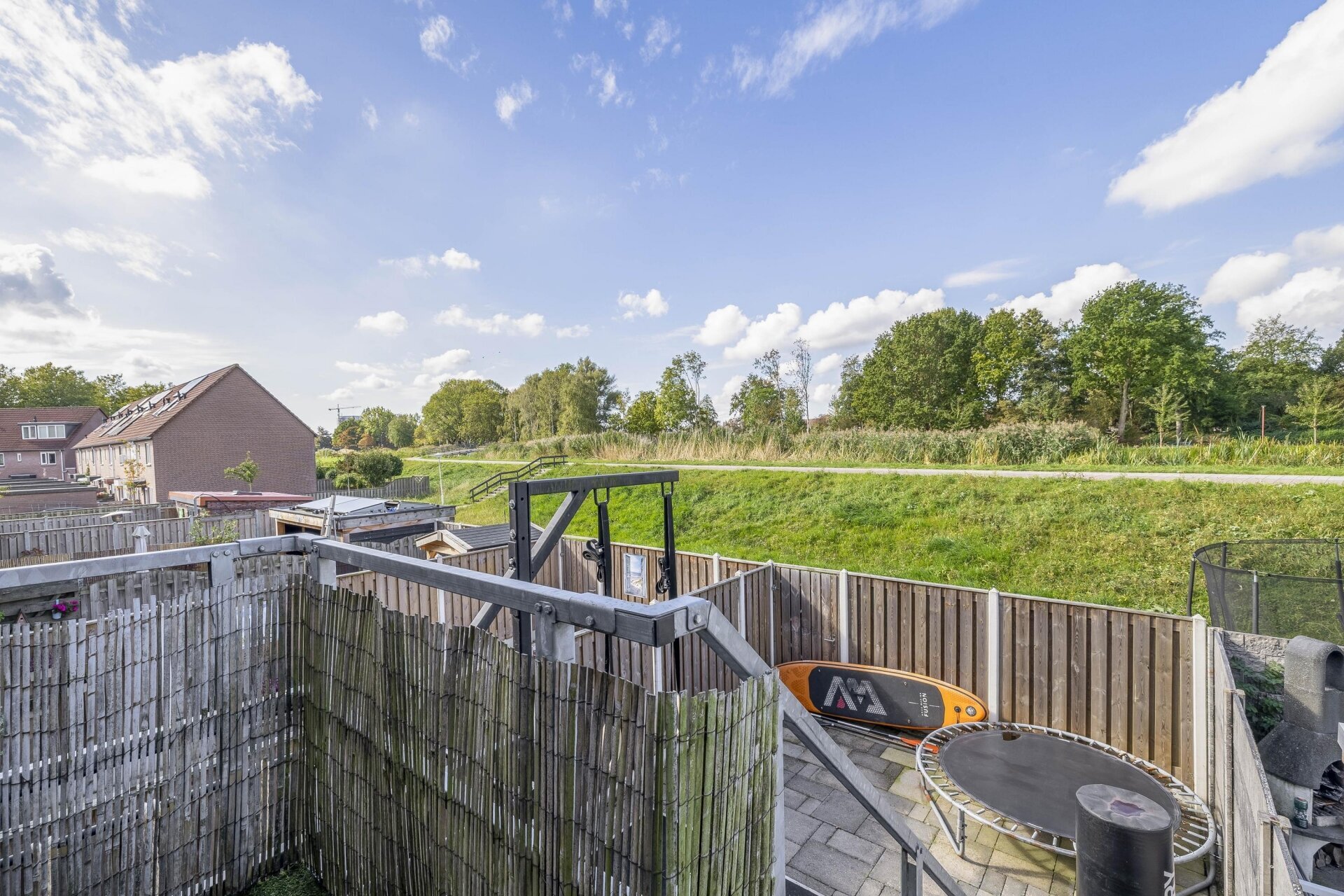 We hebben de woonkamer en keuken naar de eerste etage verplaatst om dat uitzicht optimaal te benutten. Daardoor is de begane grond nu een ruimte met eindeloze mogelijkheden — een hobbykamer, kantoor of zelfs een mancave. Deze ruimte heeft bovendien een aparte ingang, los van het leefgedeelte van het huis. Ideaal voor wie werk en privé graag gescheiden houdt. De tuin ligt op de zon. Vooral aan de rechterzijde is het heerlijk vertoeven; daar liggen we regelmatig uit de wind te genieten zodra de zon zich laat zien (en dat is in Nederland vaker dan je denkt). Voor wie liever een traditionele indeling wil met de woonkamer op de begane grond: dat is eenvoudig te realiseren. Door één muurtje te verwijderen en de keuken weer beneden te plaatsen (alle leidingen liggen er nog), heb je zo de oorspronkelijke indeling terug.