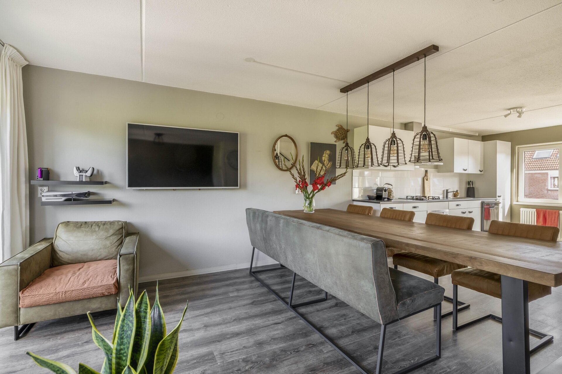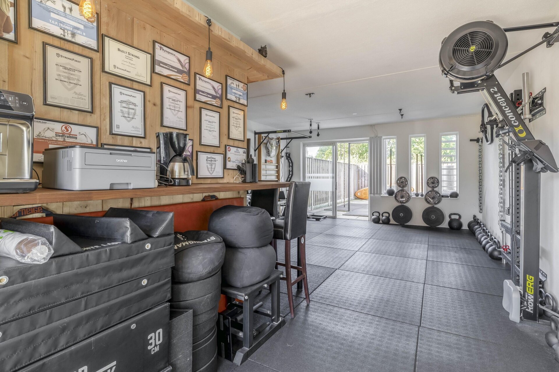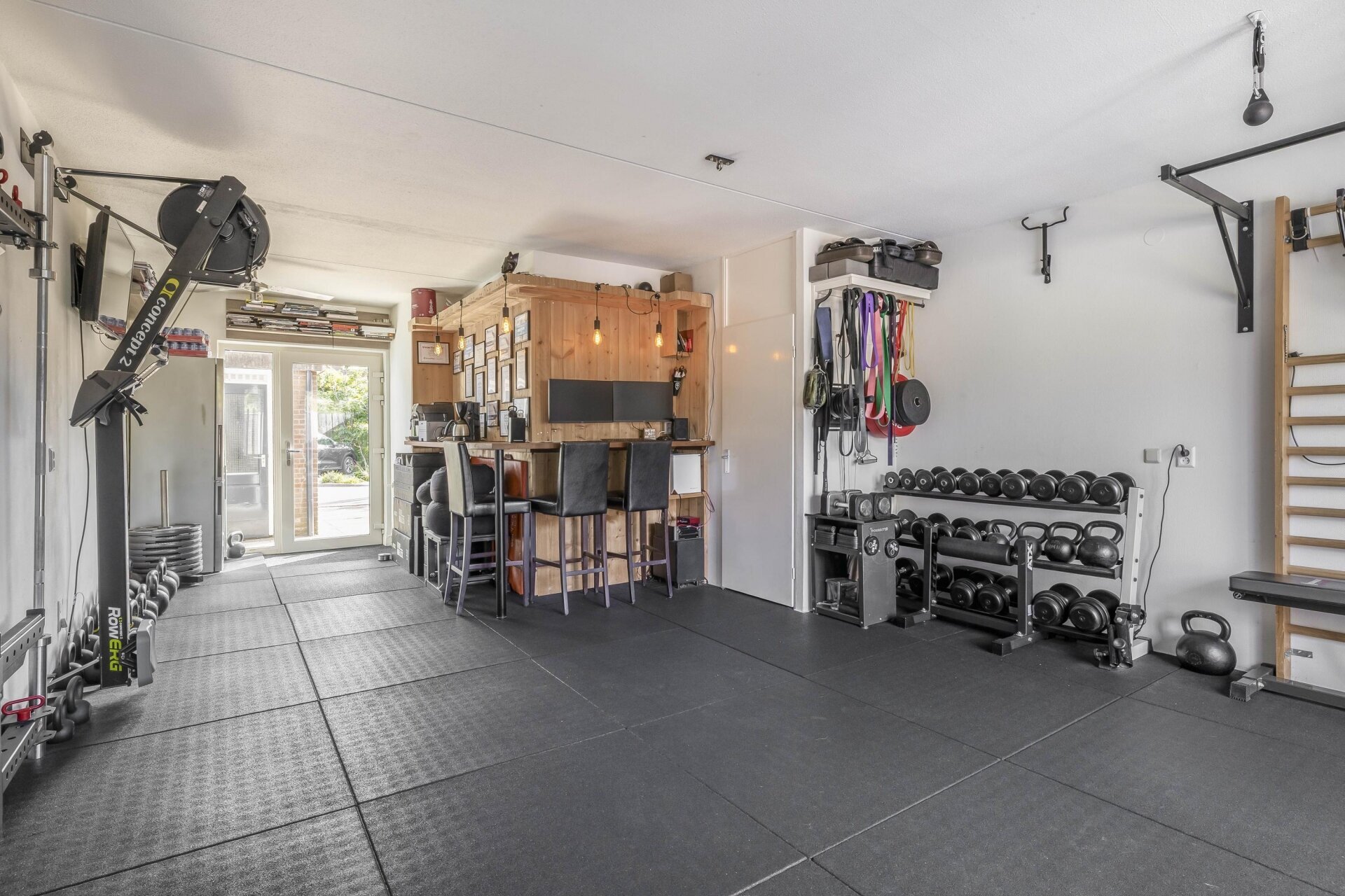 We hebben de woonkamer en keuken naar de eerste etage verplaatst om dat uitzicht optimaal te benutten. Daardoor is de begane grond nu een ruimte met eindeloze mogelijkheden — een hobbykamer, kantoor of zelfs een mancave. Deze ruimte heeft bovendien een aparte ingang, los van het leefgedeelte van het huis. Ideaal voor wie werk en privé graag gescheiden houdt. De tuin ligt op de zon. Vooral aan de rechterzijde is het heerlijk vertoeven; daar liggen we regelmatig uit de wind te genieten zodra de zon zich laat zien (en dat is in Nederland vaker dan je denkt). Voor wie liever een traditionele indeling wil met de woonkamer op de begane grond: dat is eenvoudig te realiseren. Door één muurtje te verwijderen en de keuken weer beneden te plaatsen (alle leidingen liggen er nog), heb je zo de oorspronkelijke indeling terug.
