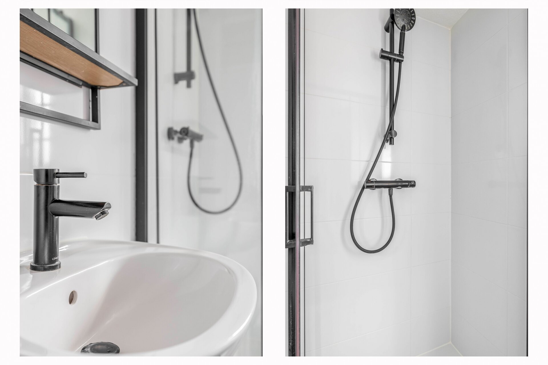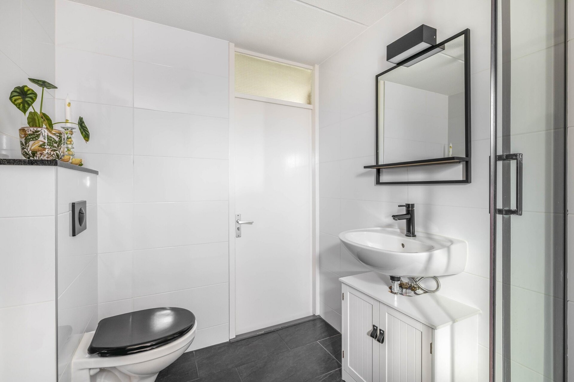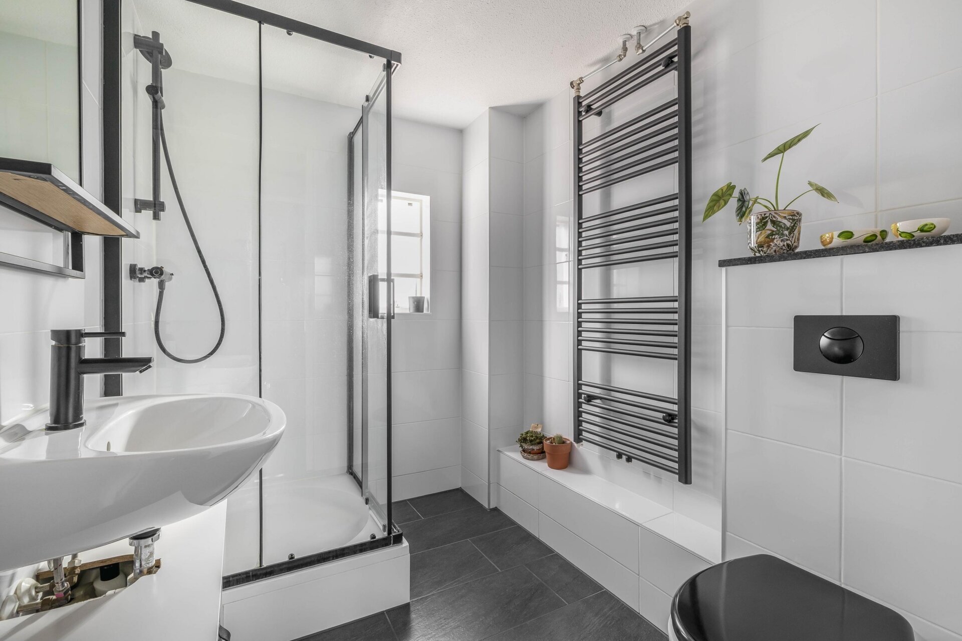 Tevens is er op deze verdieping toegang naar de badkamer. De badkamer is functioneel ingericht met douche, wastafel en tweede toilet. Alles netjes afgewerkt, met ruimte voor persoonlijke wensen of eventueel een update als je dat zelf wil.