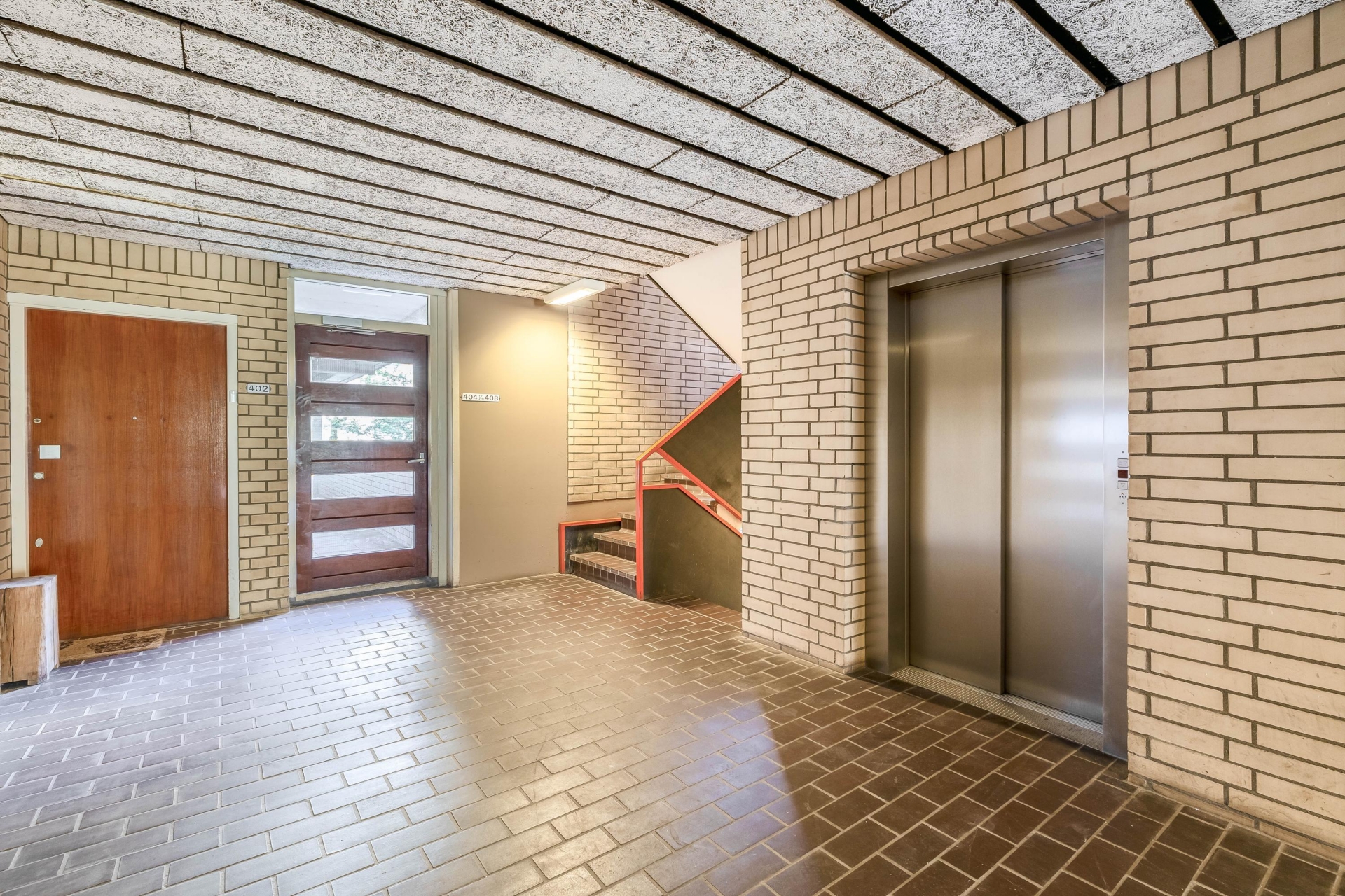 Afgesloten, gemeenschappelijke entree op de begane grond met bellen- en brievenbussentableau, lift en trappenhuis naar de woonverdieping.