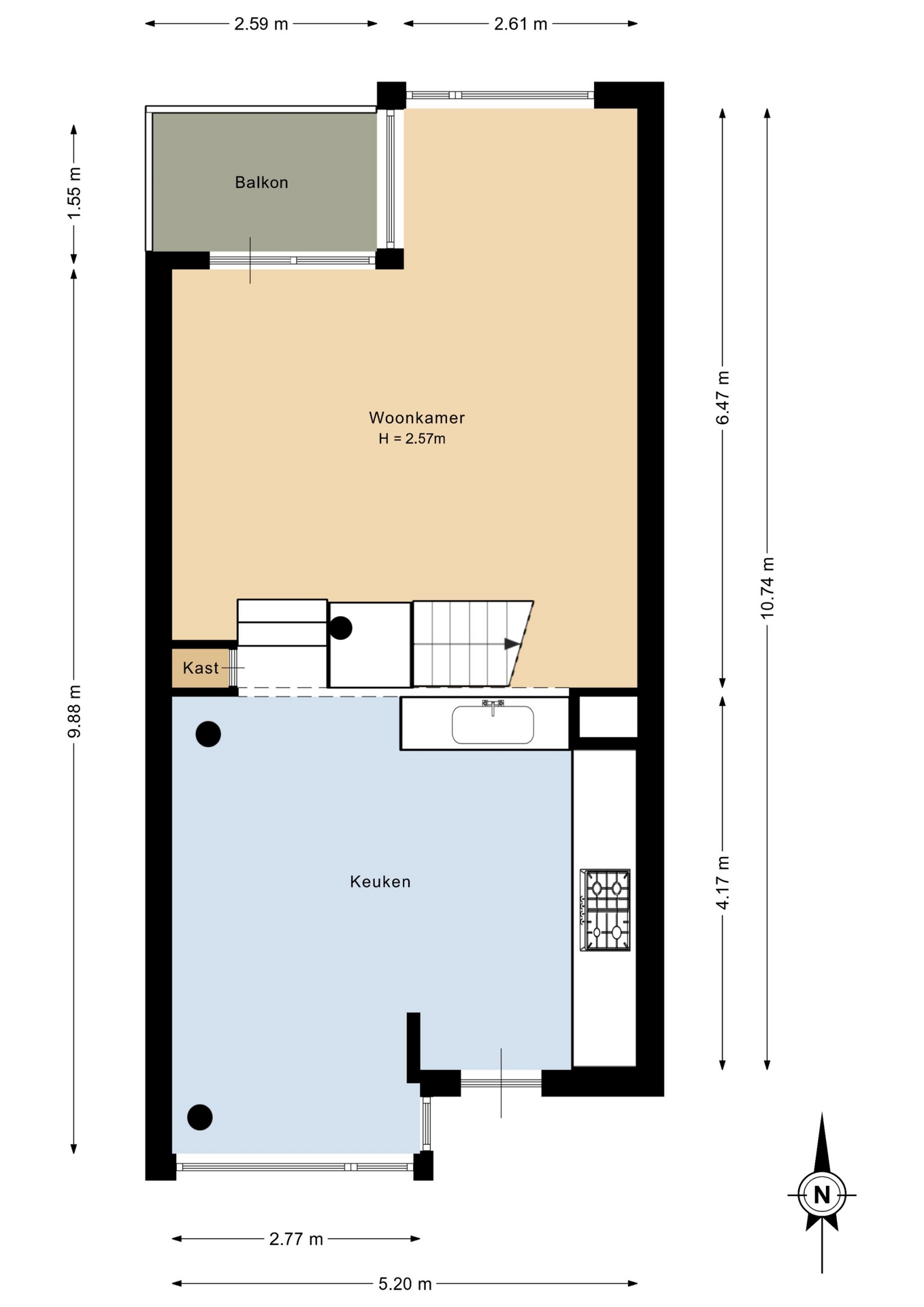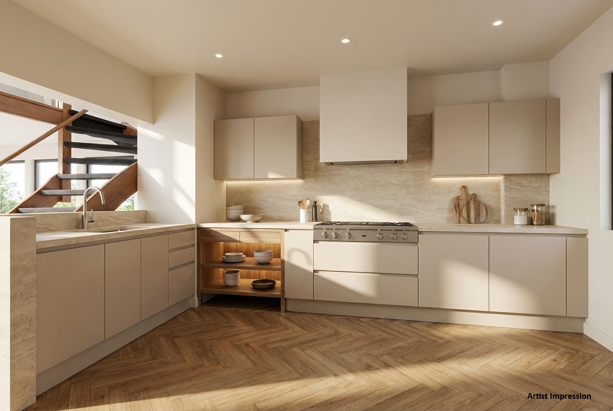 Entree woning op de eerste woonlaag direct in de keuken, gelegen aan de achterzijde en voorzien van een keukenblok en opstelplaats voor apparatuur; de eerste verdieping heeft een open indeling met aansluitend de eet- en woonkamer aan de voorzijde, met toegang tot het balkon.