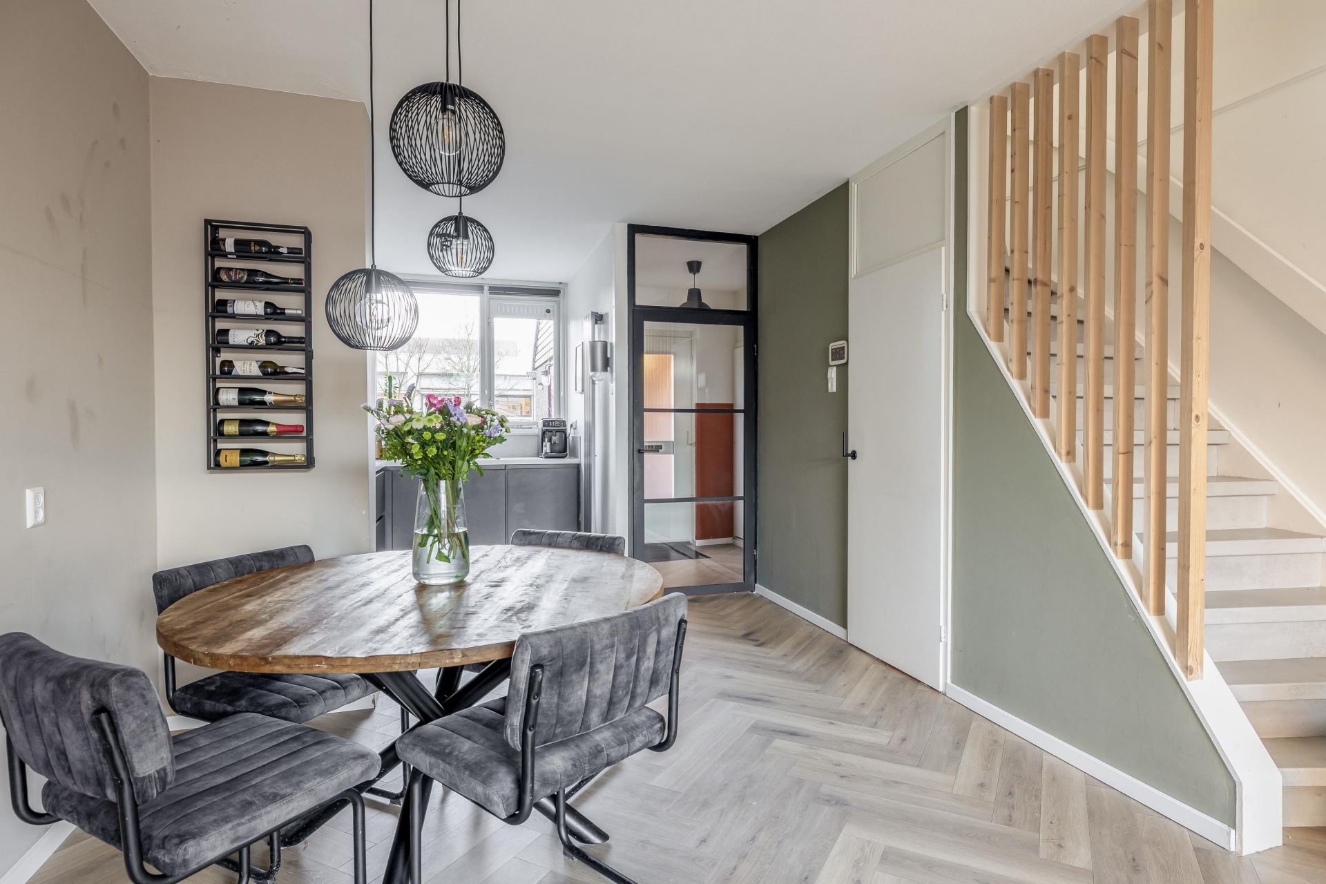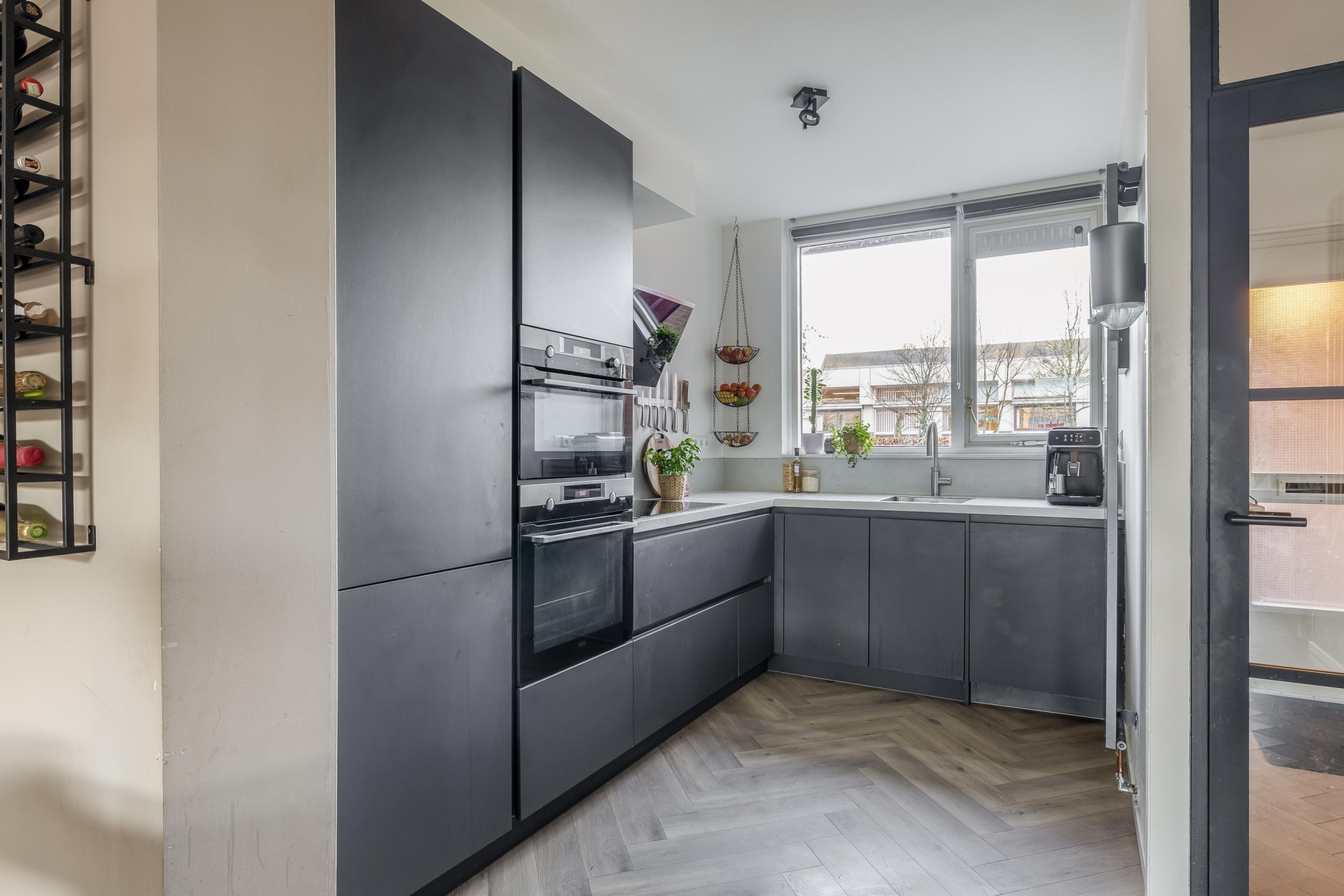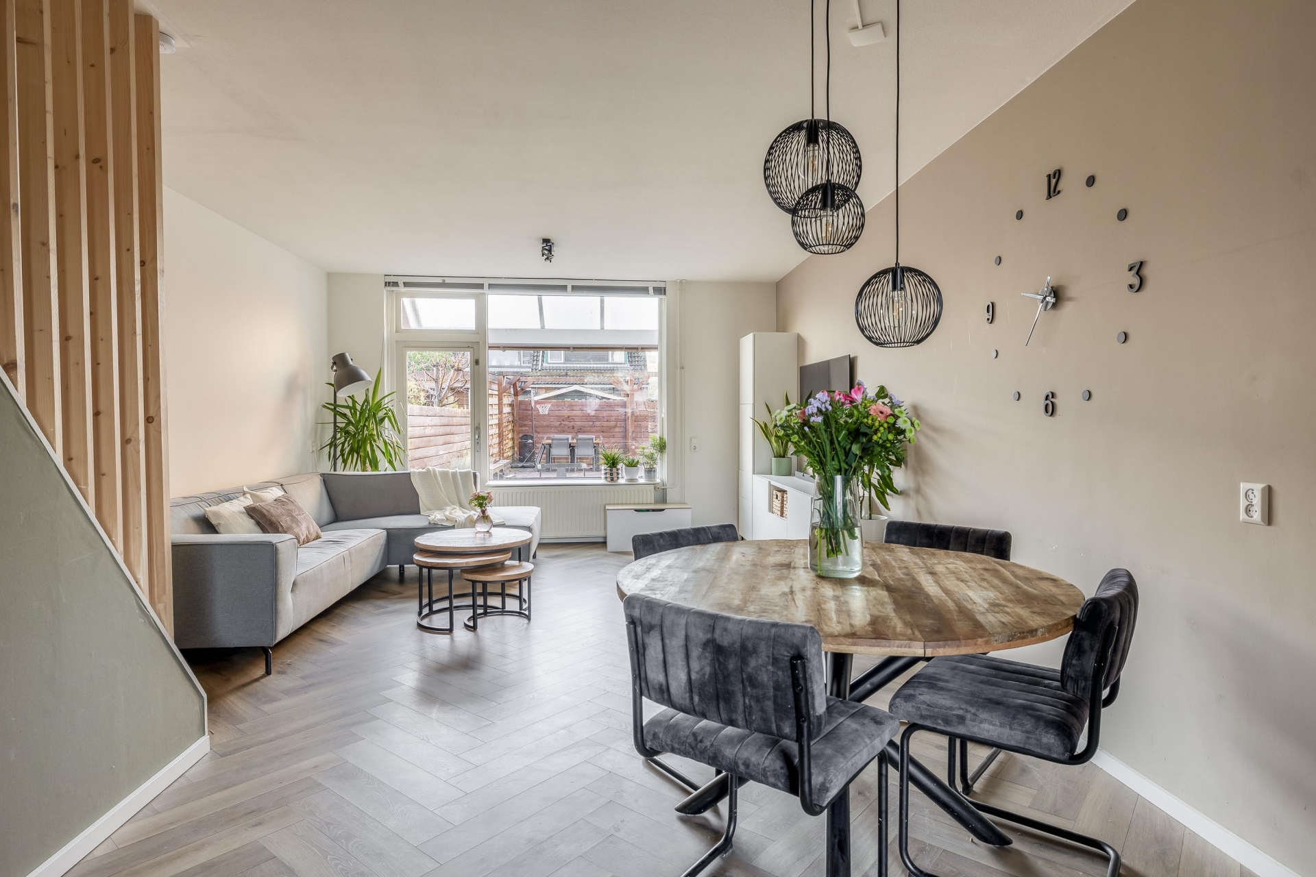 De woonkamer is een fijne, lichte ruimte met een strakke laminaat-visgraatvloer en een mooie overgang naar de halfopen keuken. De moderne keuken uit 2021 is uitgerust met inbouwapparatuur, een Quooker en veel werkruimte, een heerlijke plek voor kookliefhebbers. Het geheel heeft een eigentijdse uitstraling, met rustige kleuren en een praktische indeling.