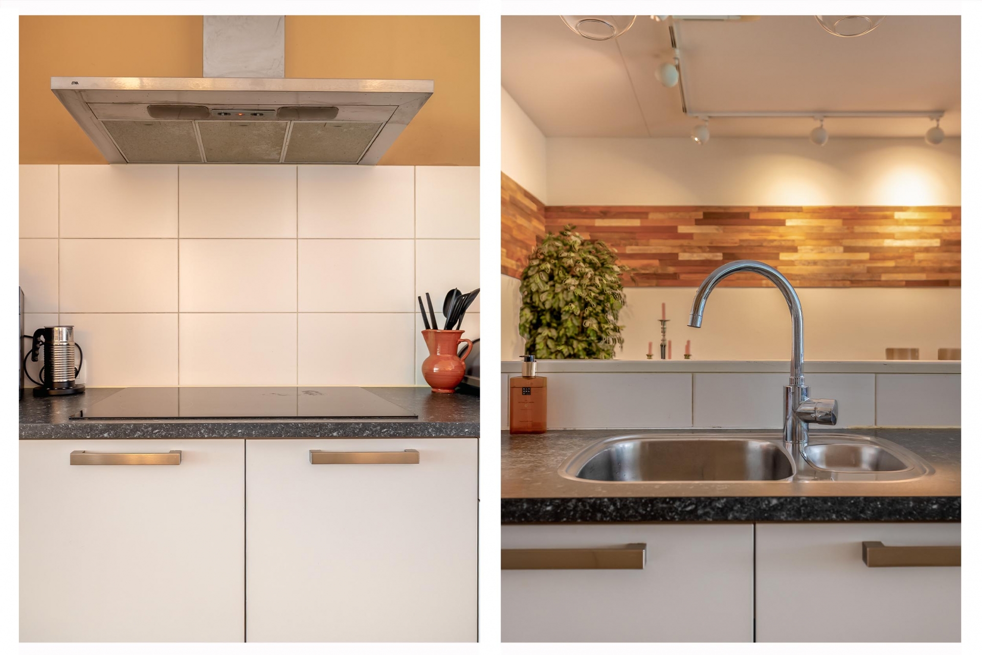 De open keuken is uitgevoerd in een wit design en voorzien van inbouwapparatuur zoals een inductiekookplaat met afzuiging, oven, vaatwasser en koel-/vriescombinatie. De keuken biedt veel werk- en bergruimte en sluit naadloos aan bij de moderne stijl van het appartement.