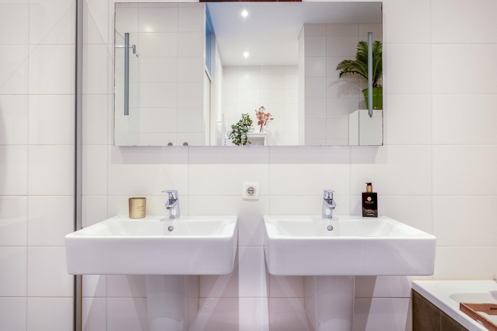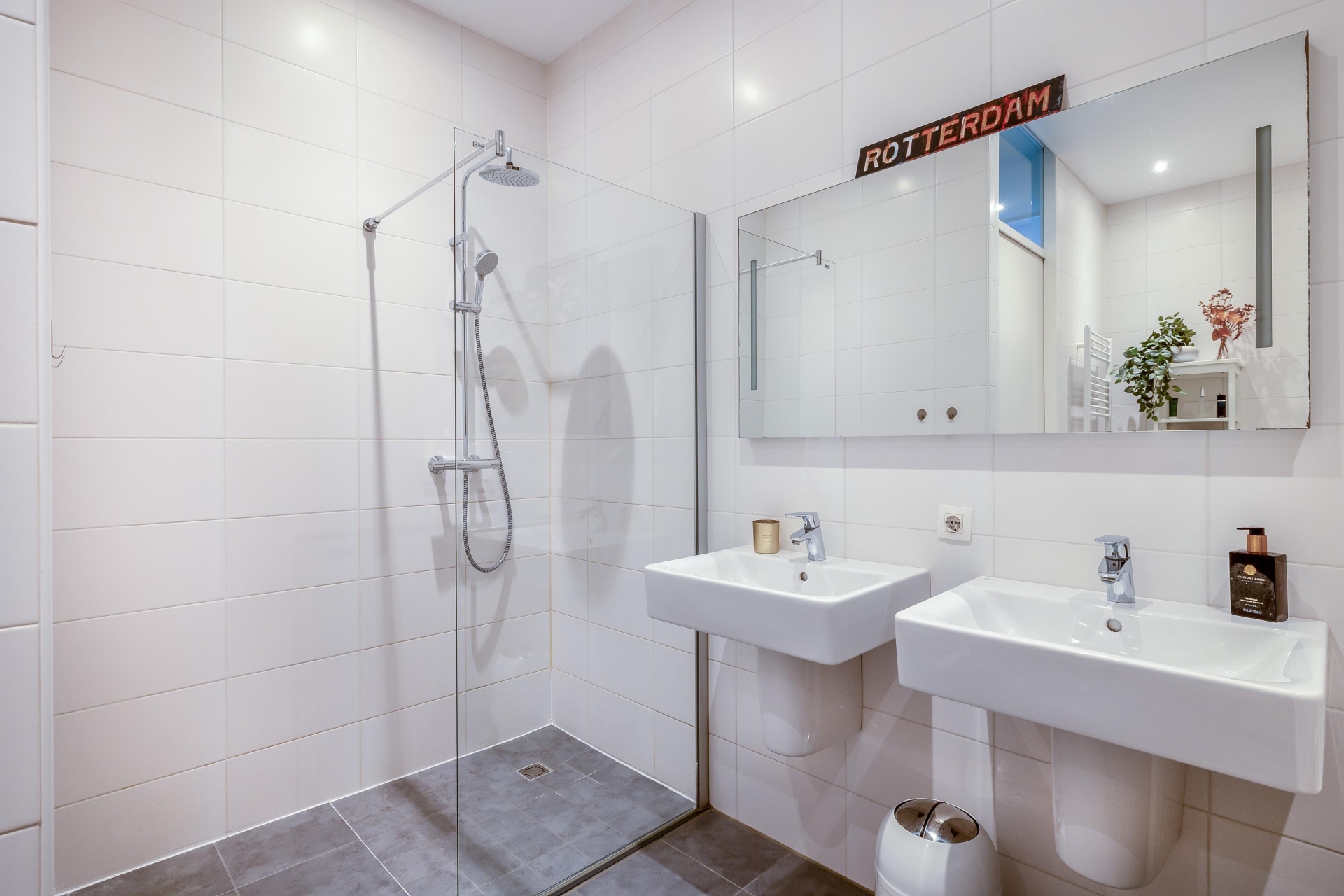 De badkamer is modern ingericht met een inloopdouche, een ligbad en een dubbele wastafel. Daarnaast is er een tweede toilet in de badkamer aanwezig.