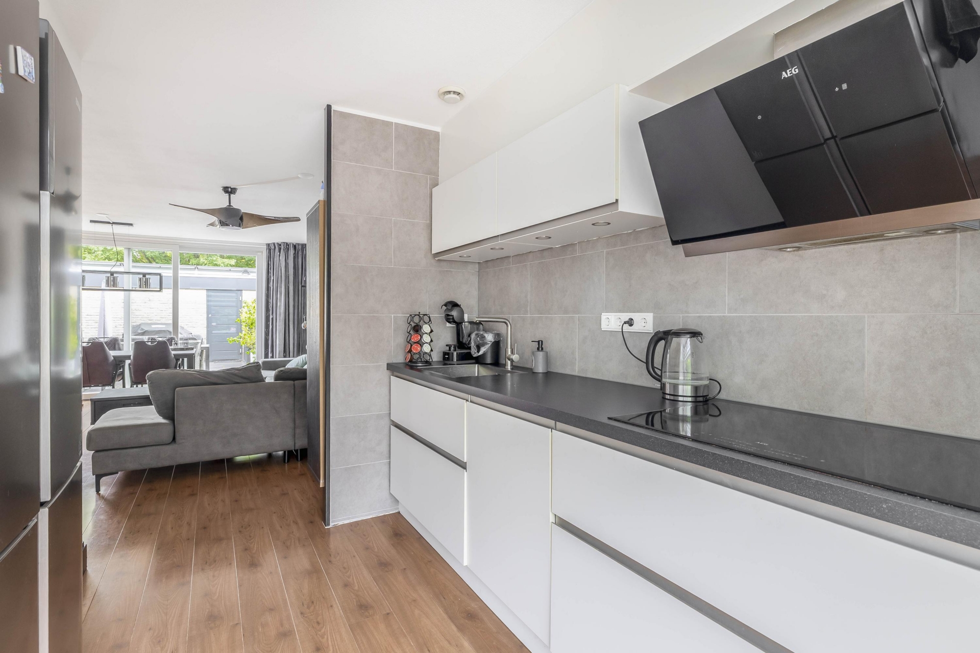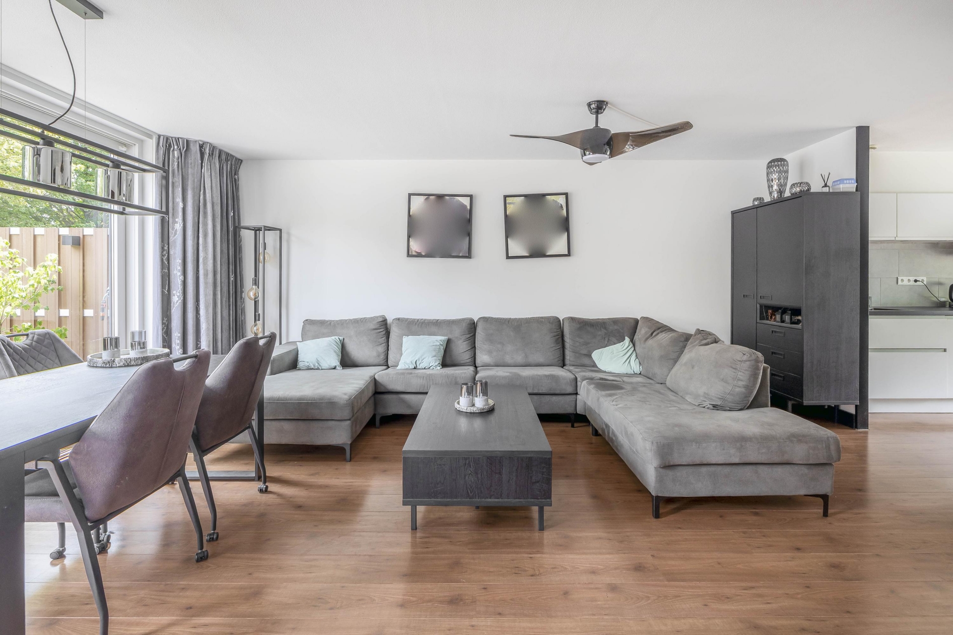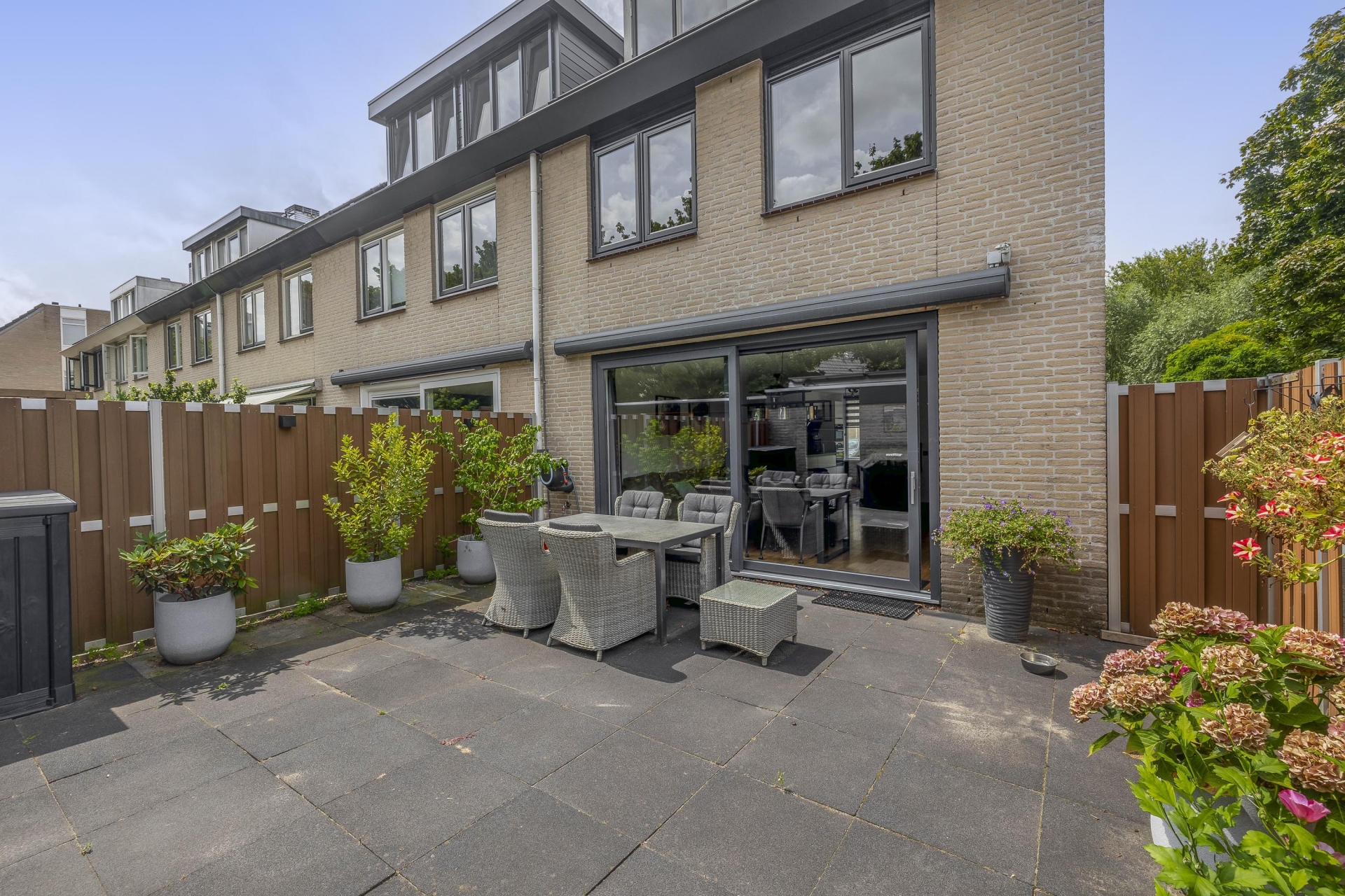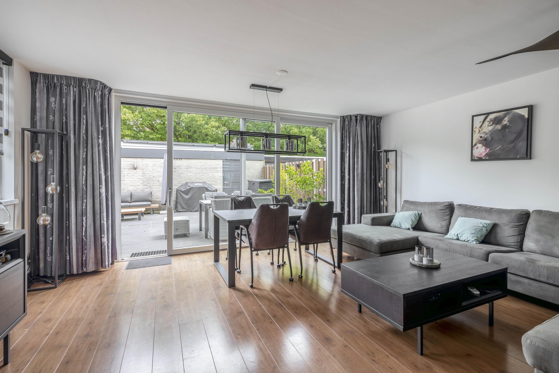 Royale tuingerichte woonkamer met grote schuifpui en veel lichtinval