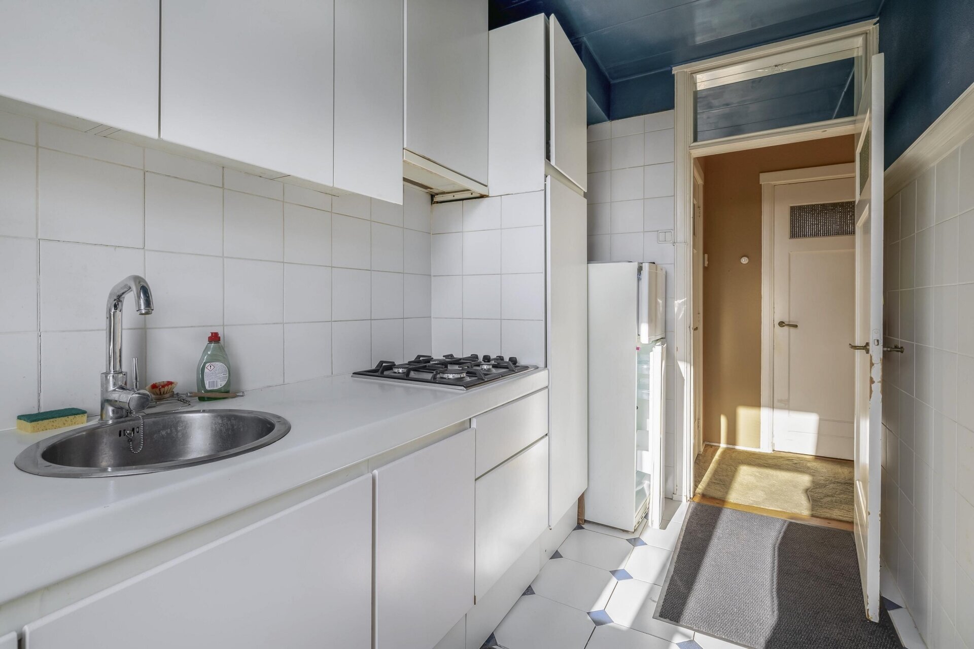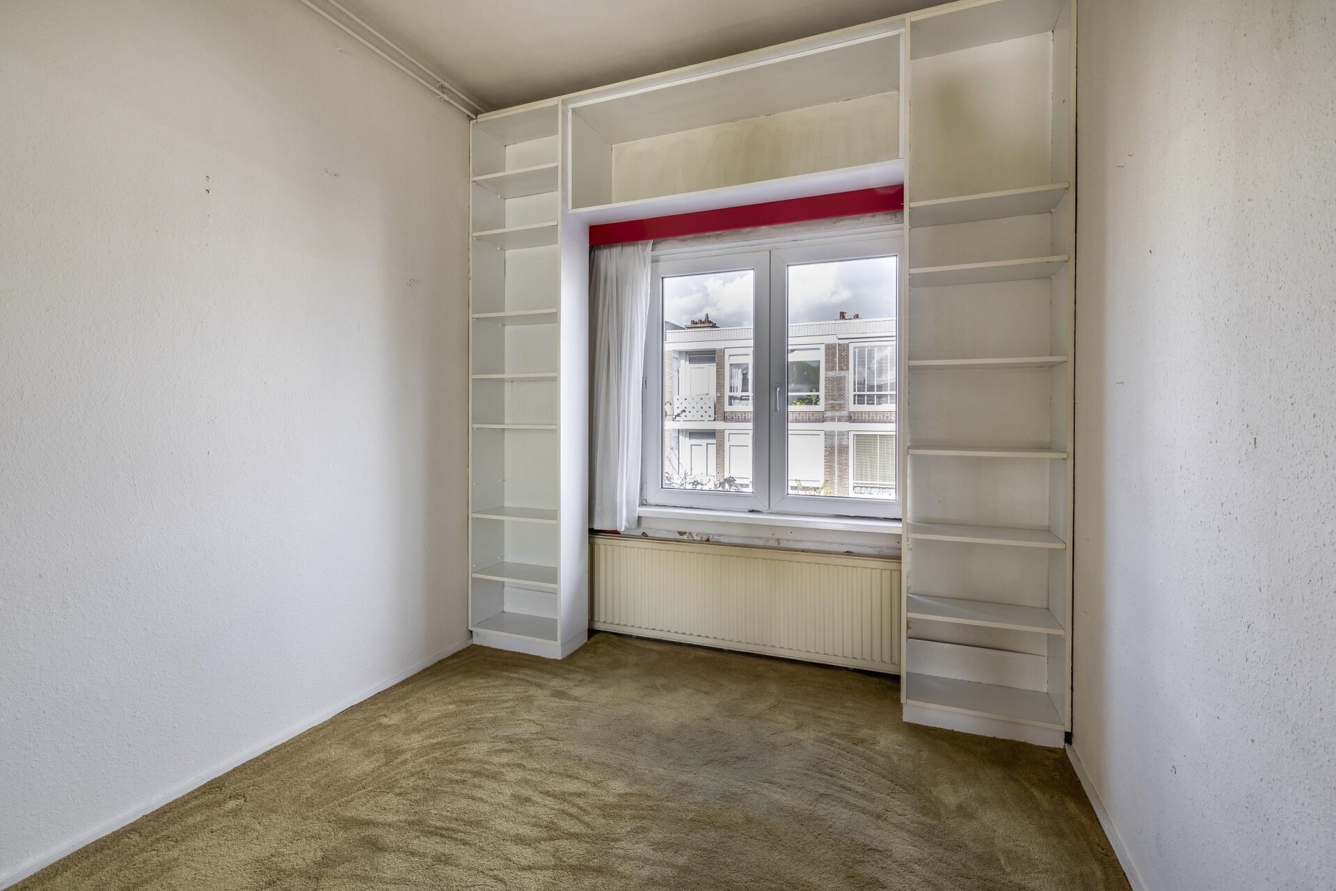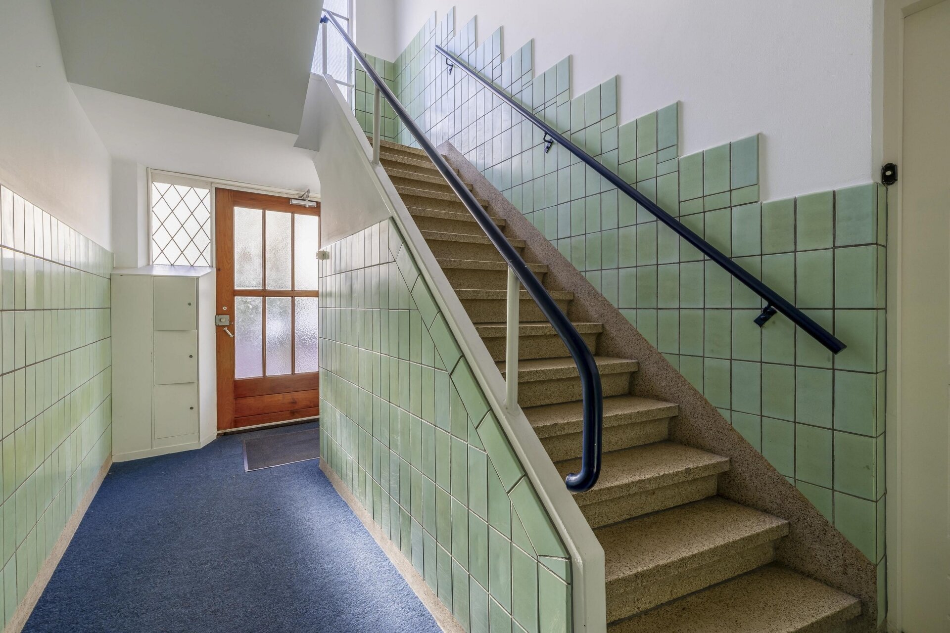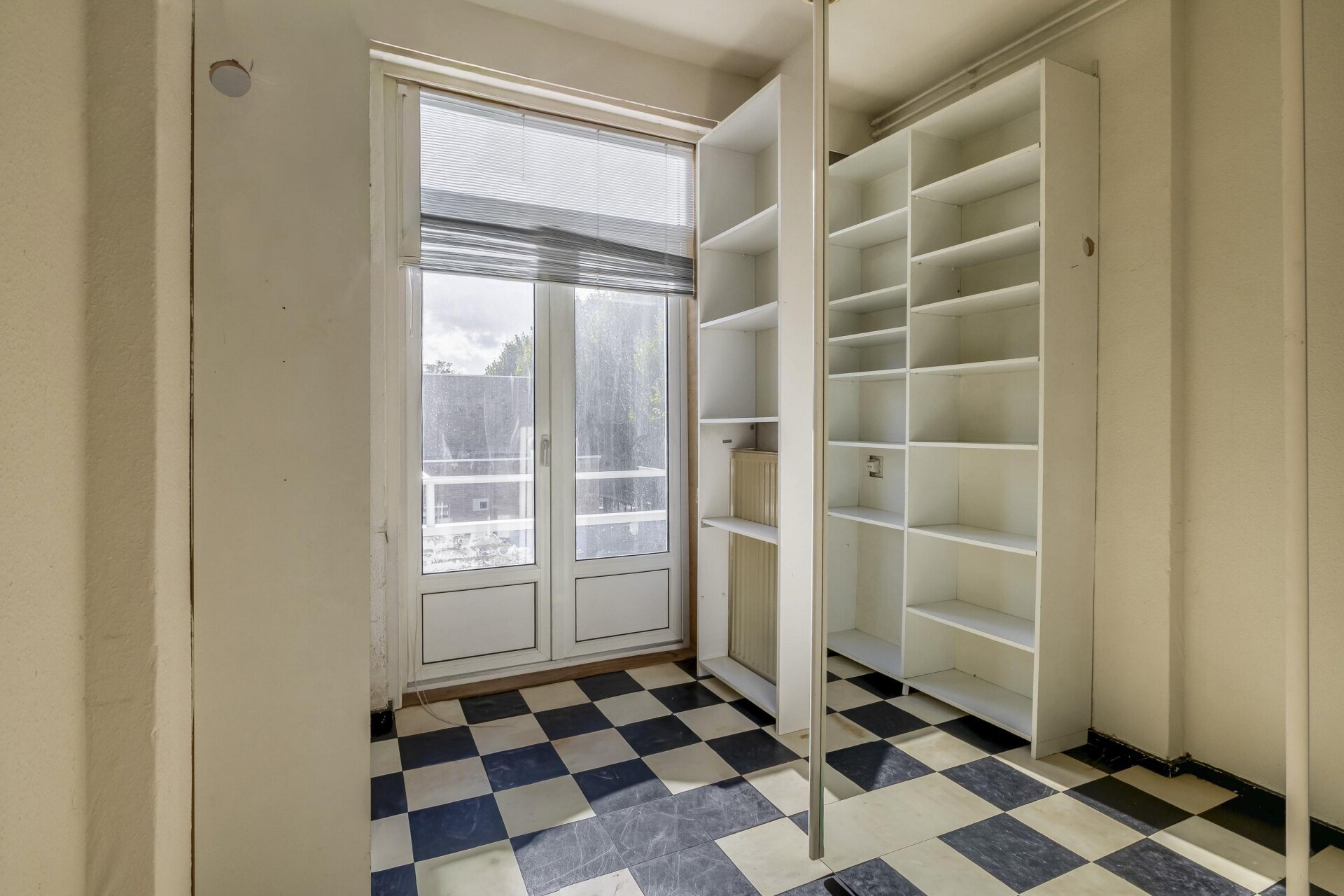 Afgesloten portiek met brievenbussen- en bellentableau; trap naar de tweede etage; entree middels hal, voorzien van meterkast; grote slaapkamer, voorzien van hang- en legkast met twee spiegel-schuifdeuren; aparte kast met c.v.-ketel; badkamer, voorzien van toilet, douche en wastafelmeubel; riante woon-/eetkamer (voormalige en suite), voorzien van originele schouw en toegang tot het 1e achterbalkon (ZW); keuken, voorzien van eenvoudig blok met gaskookplaat, koel-/vriescombinatie en toegang tot het 2e achterbalkon (ZW); kleine slaapkamer aan de achterzijde voorzien van hang- en legkast met twee spiegel-schuifdeuren, met toegang tot het achterbalkon (ZW); separate (fietsen-) berging.