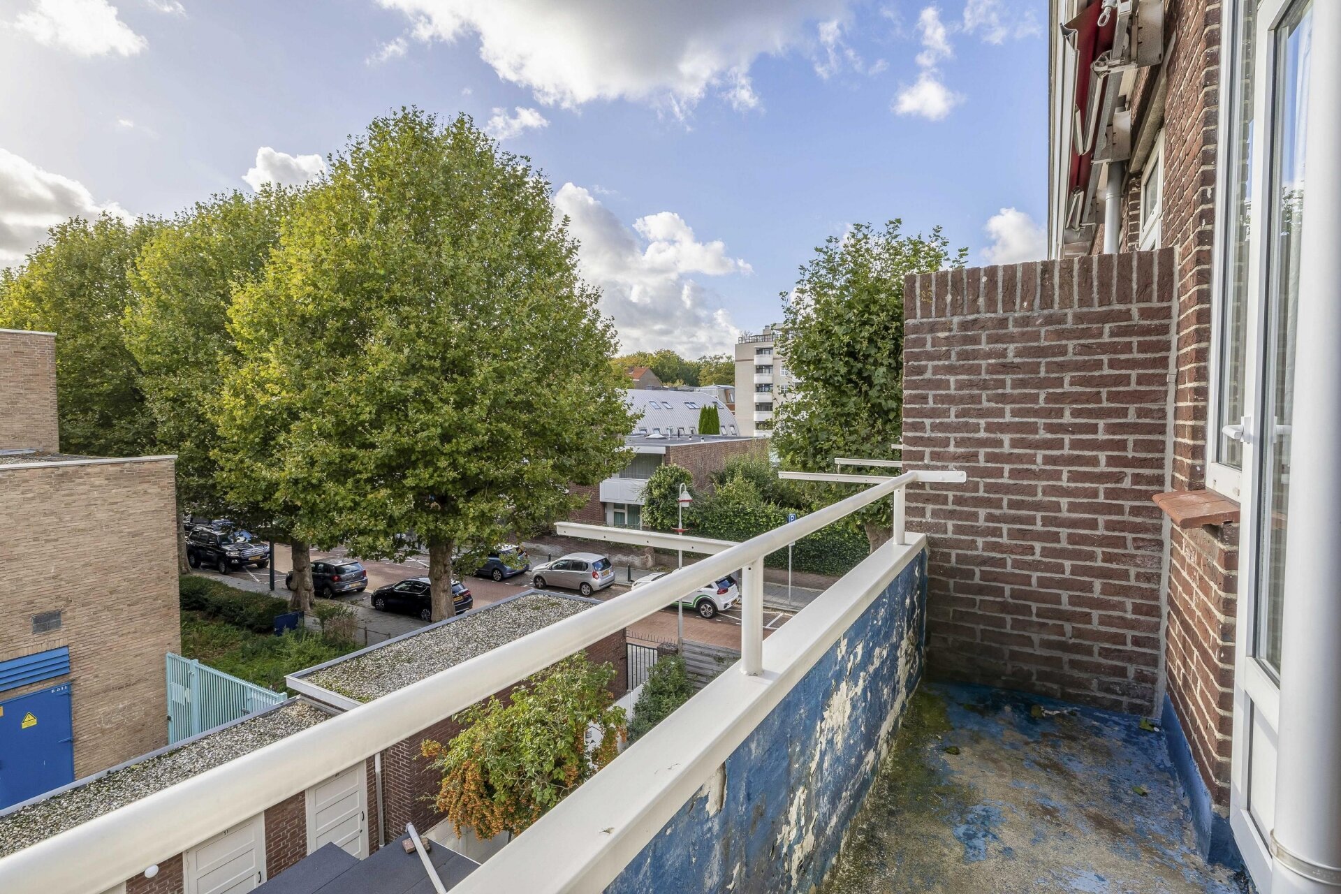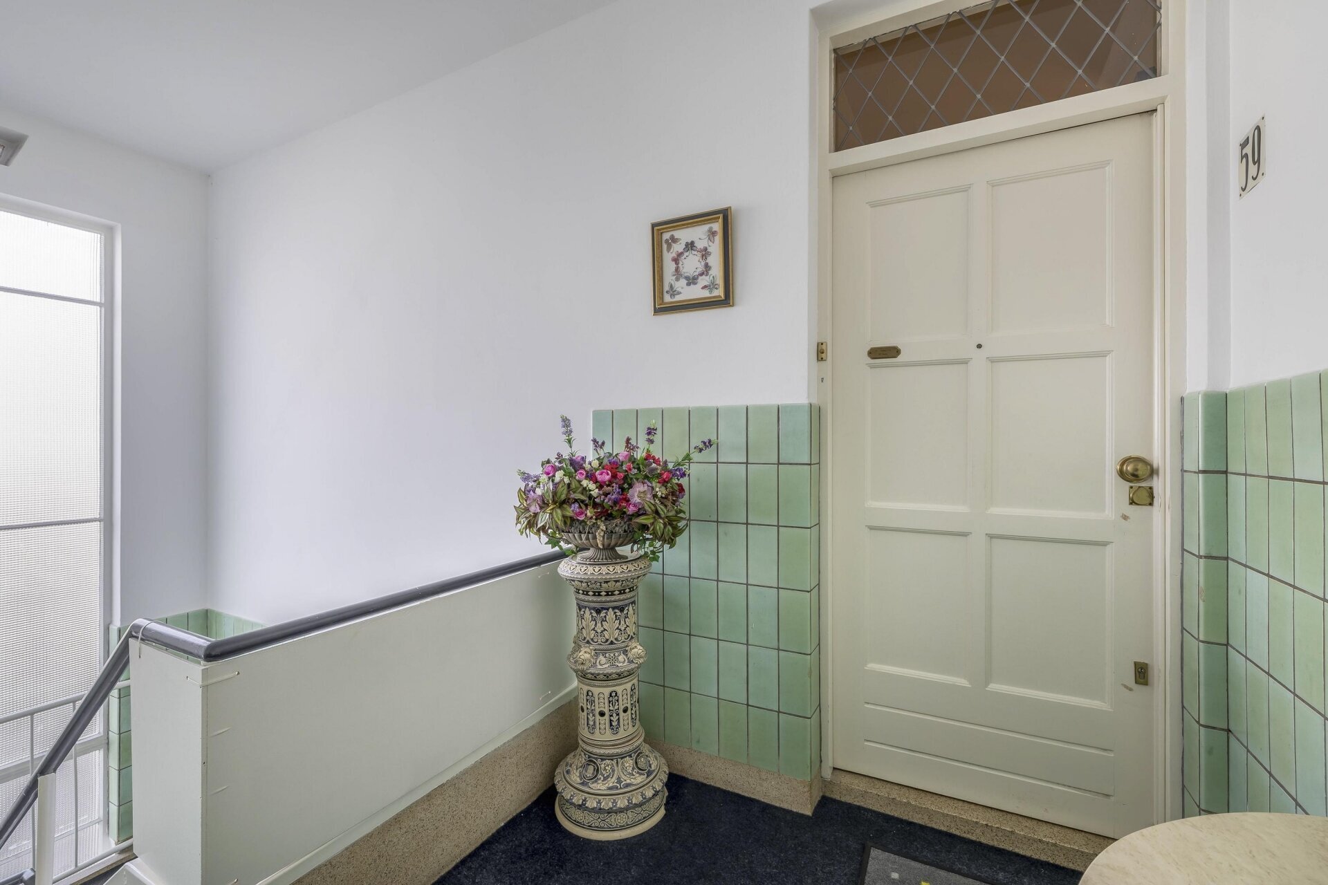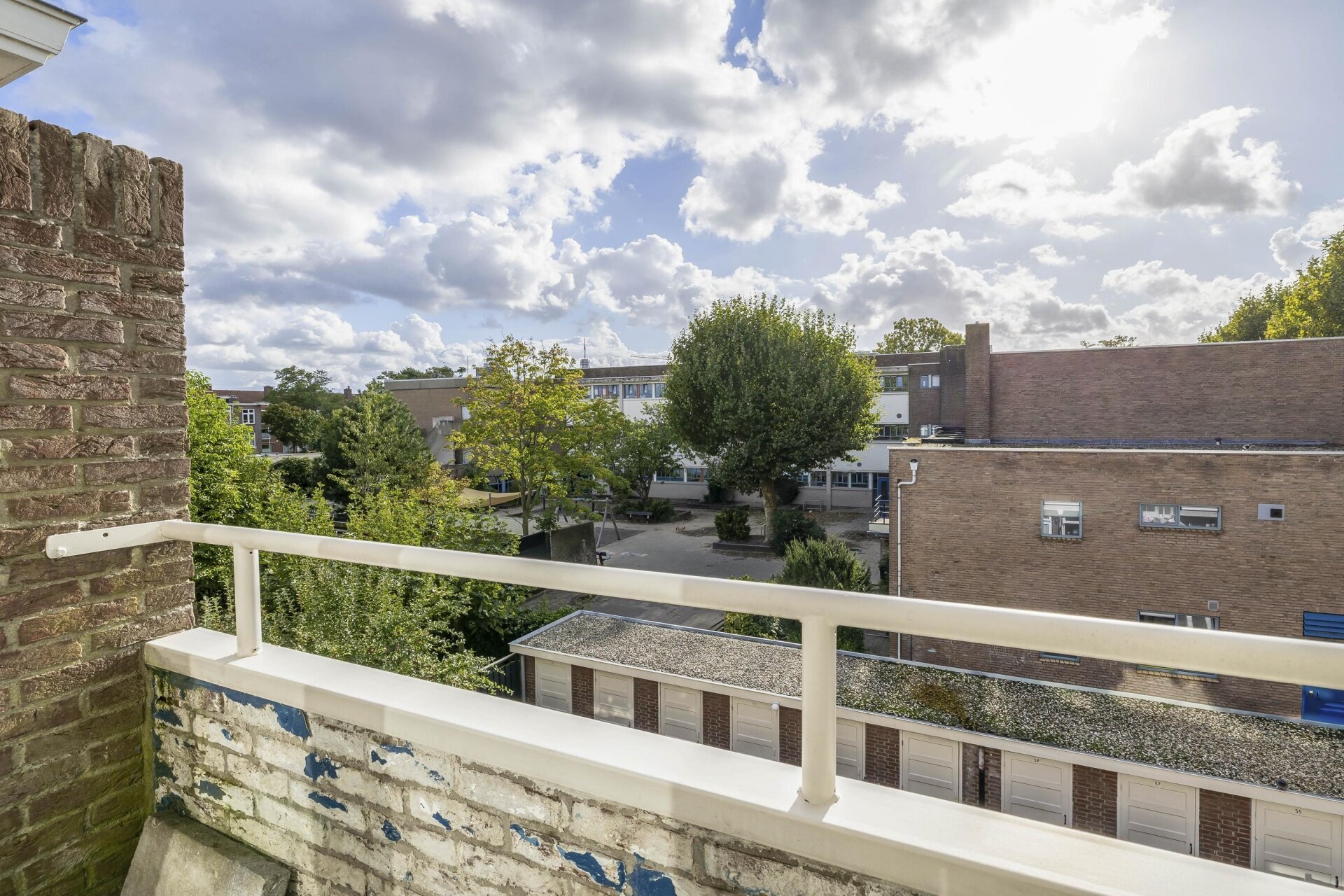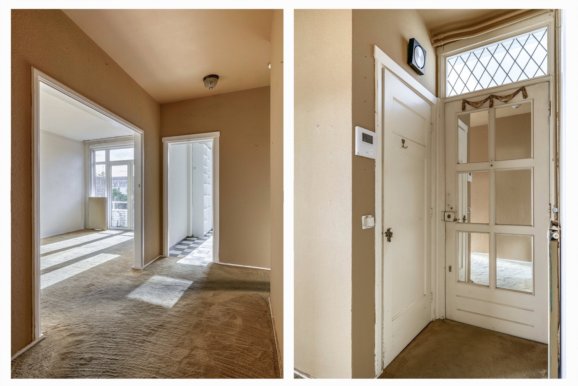 Afgesloten portiek met brievenbussen- en bellentableau; trap naar de tweede etage; entree middels hal, voorzien van meterkast; grote slaapkamer, voorzien van hang- en legkast met twee spiegel-schuifdeuren; aparte kast met c.v.-ketel; badkamer, voorzien van toilet, douche en wastafelmeubel; riante woon-/eetkamer (voormalige en suite), voorzien van originele schouw en toegang tot het 1e achterbalkon (ZW); keuken, voorzien van eenvoudig blok met gaskookplaat, koel-/vriescombinatie en toegang tot het 2e achterbalkon (ZW); kleine slaapkamer aan de achterzijde voorzien van hang- en legkast met twee spiegel-schuifdeuren, met toegang tot het achterbalkon (ZW); separate (fietsen-) berging.