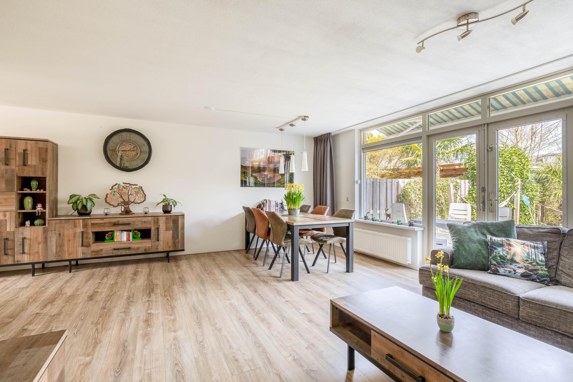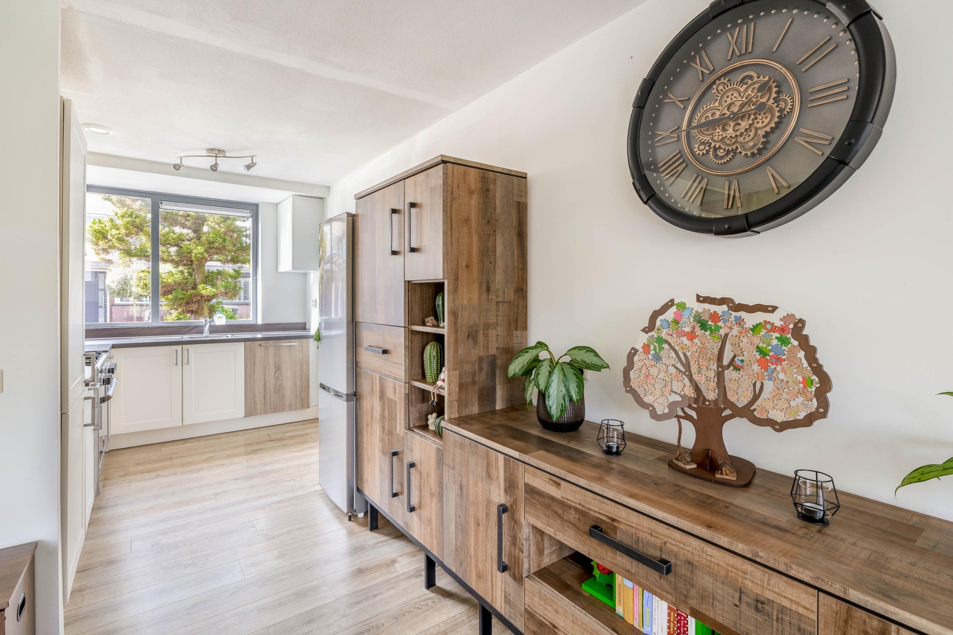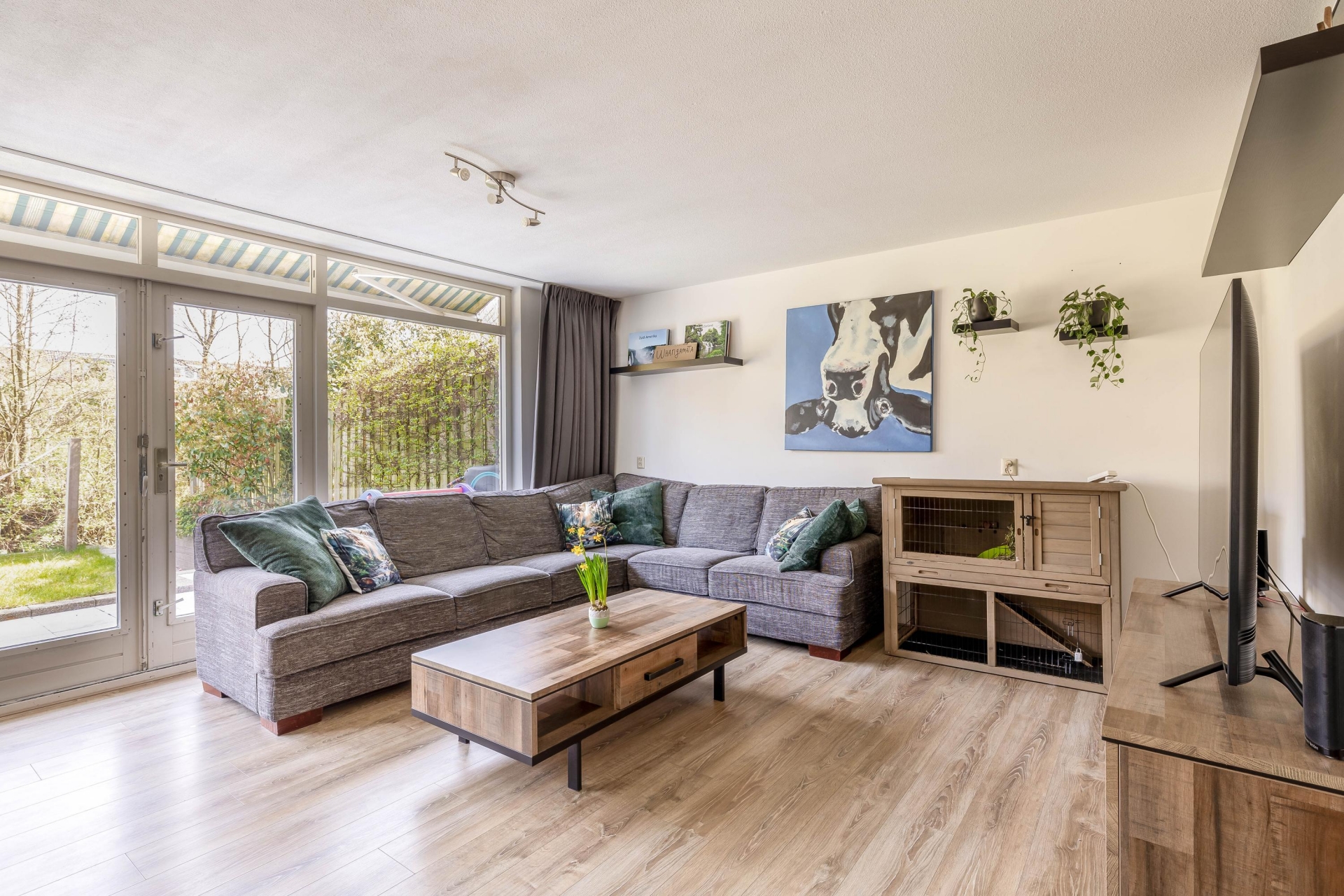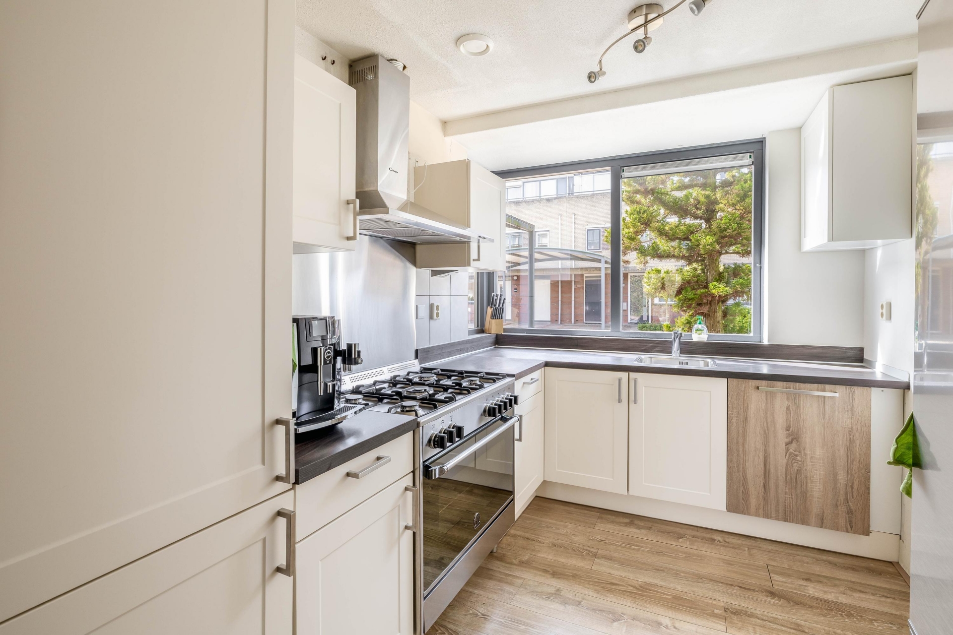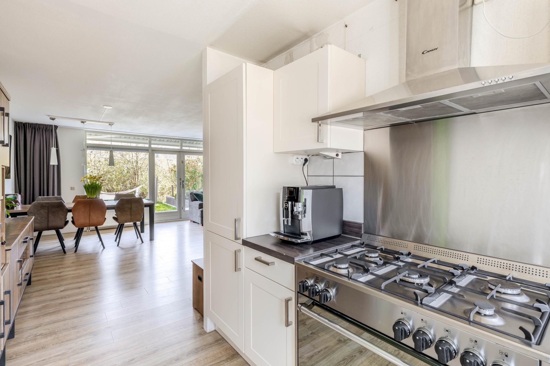 De brede, tuingerichte woonkamer biedt volop ruimte voor een comfortabele zit- en eethoek en heeft een prettige lichtinval. Aan de voorzijde bevindt zich de halfopen keuken in L-opstelling (2017), voorzien van diverse inbouwapparatuur zoals een gasfornuis met afzuigkap, oven, vaatwasser en koel-/vriescombinatie.