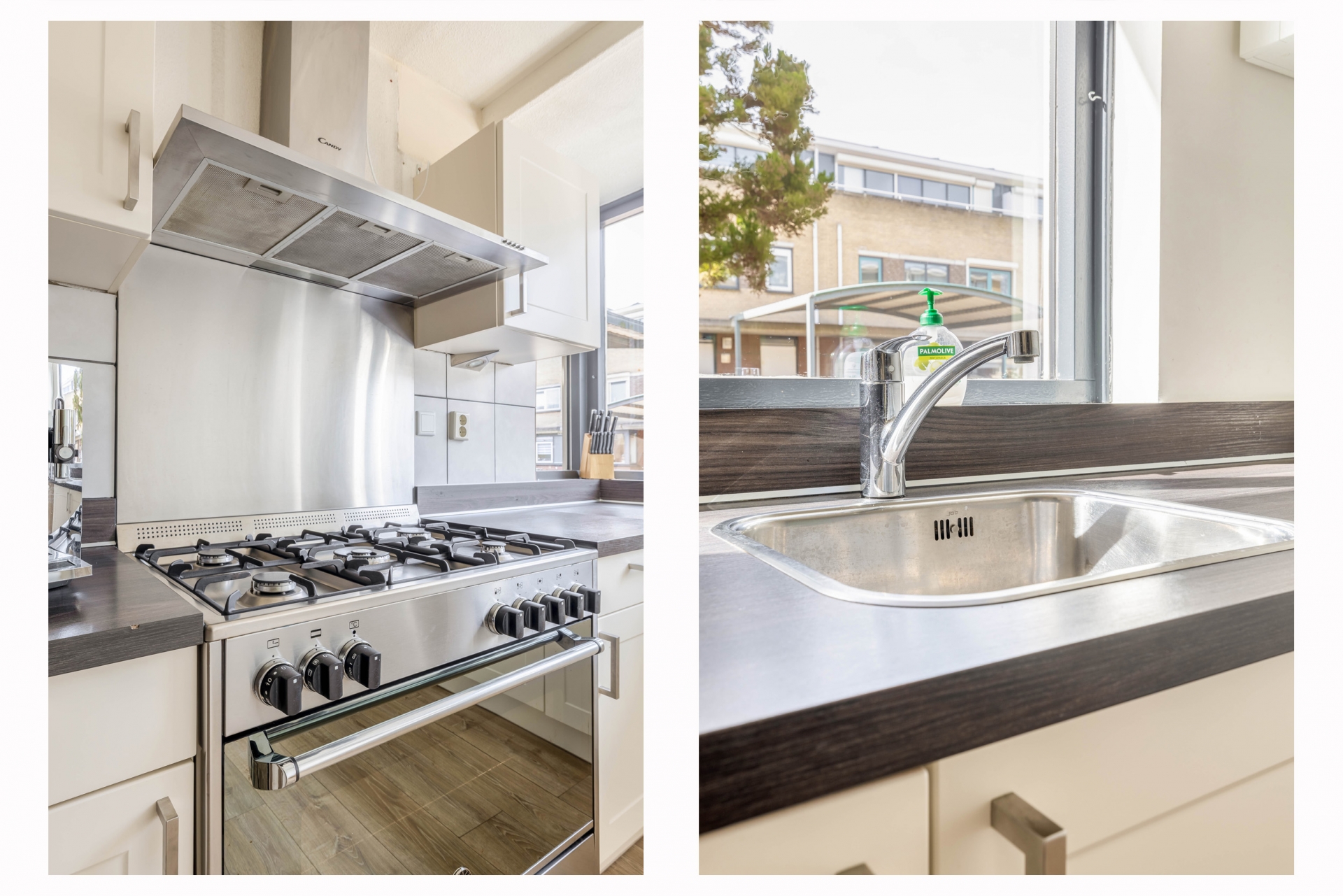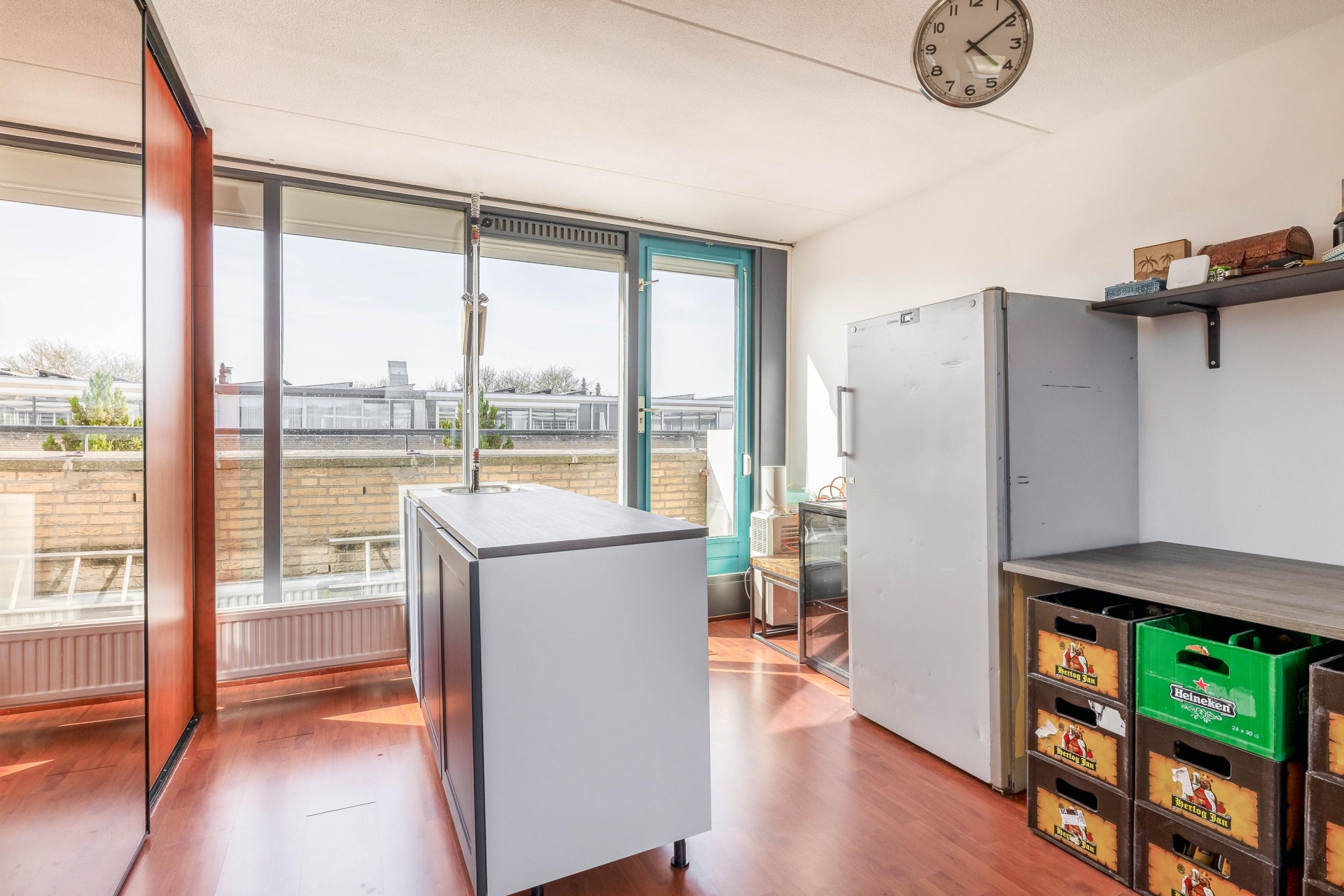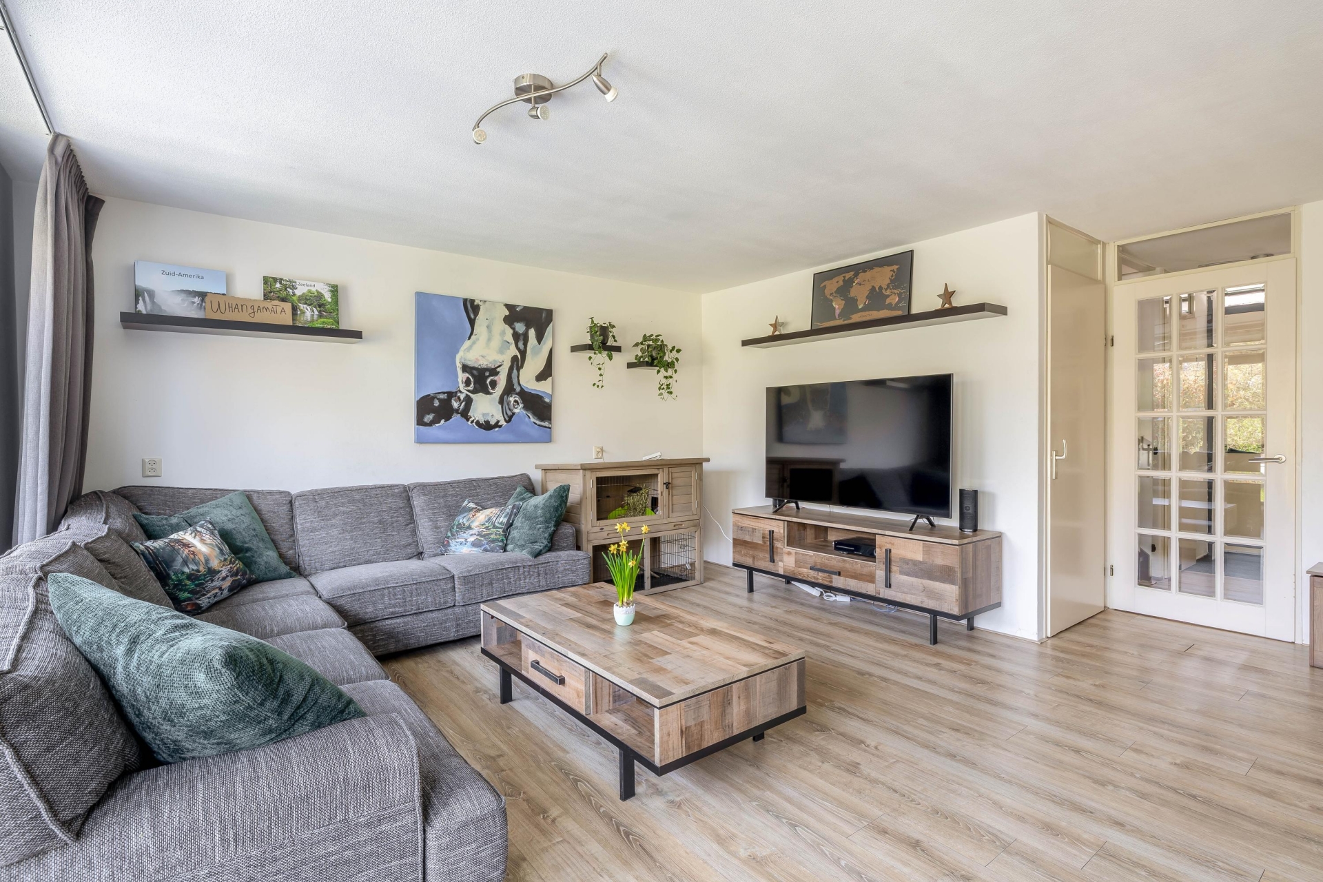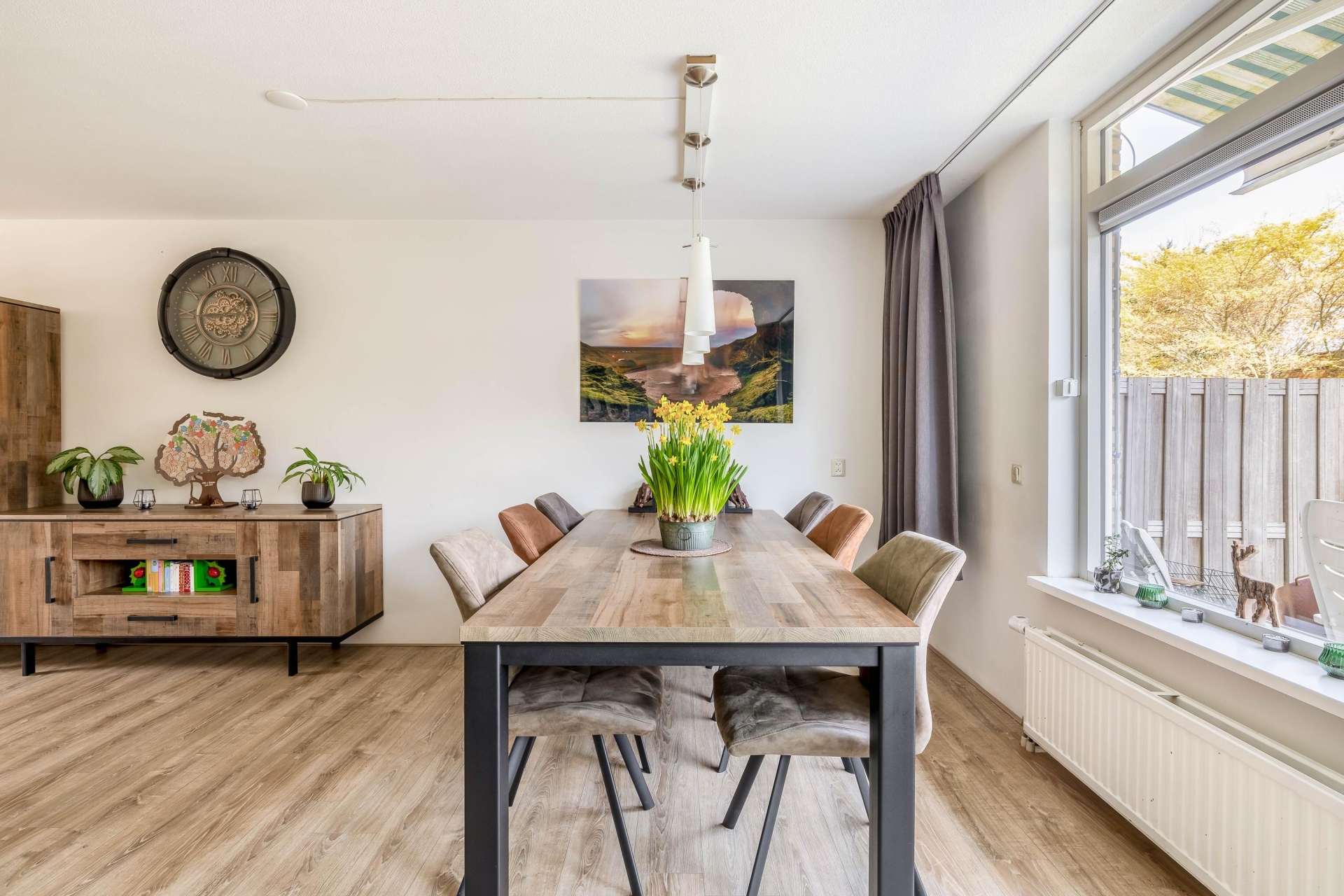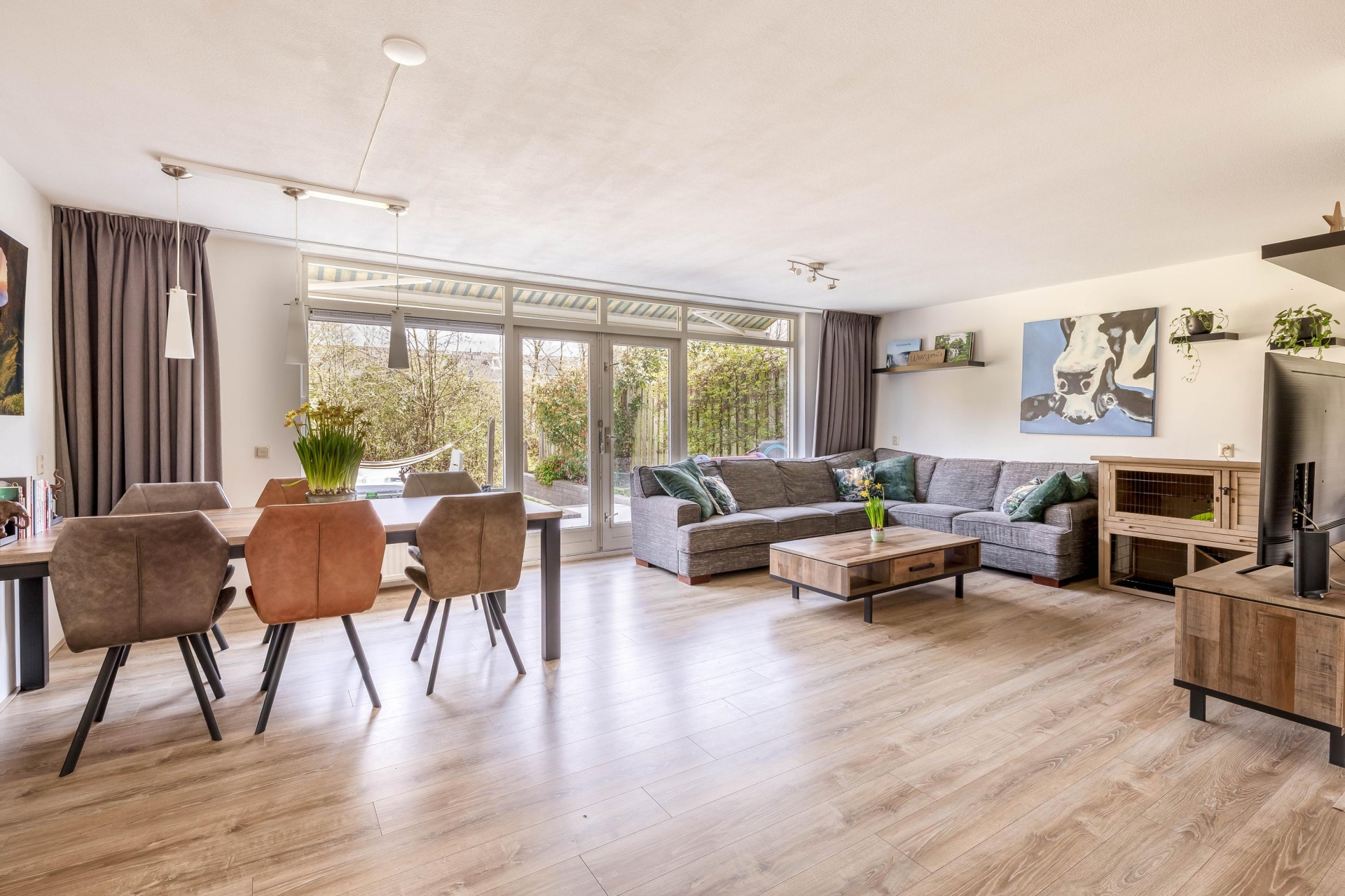 De brede, tuingerichte woonkamer biedt volop ruimte voor een comfortabele zit- en eethoek en heeft een prettige lichtinval. Aan de voorzijde bevindt zich de halfopen keuken in L-opstelling (2017), voorzien van diverse inbouwapparatuur zoals een gasfornuis met afzuigkap, oven, vaatwasser en koel-/vriescombinatie.
