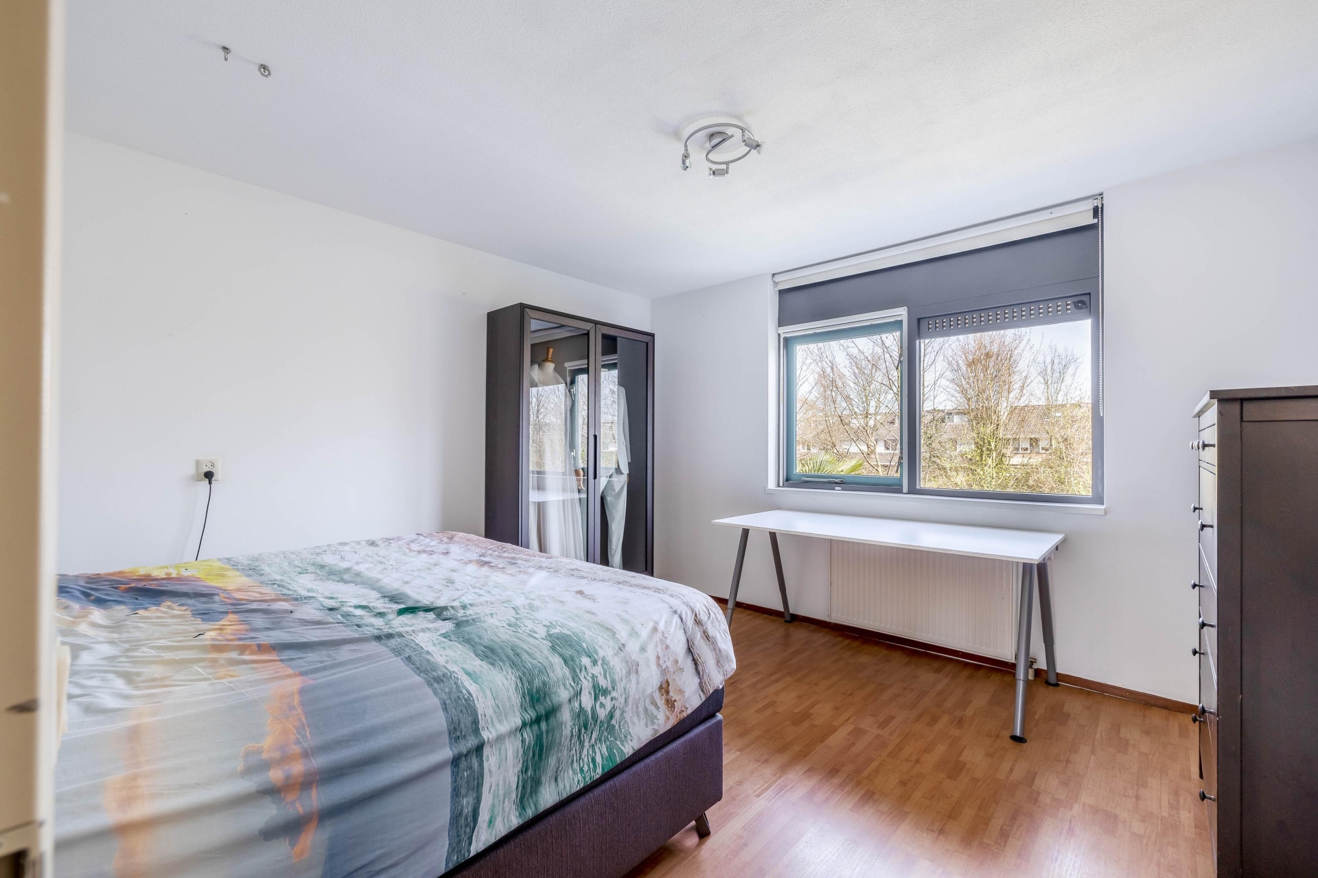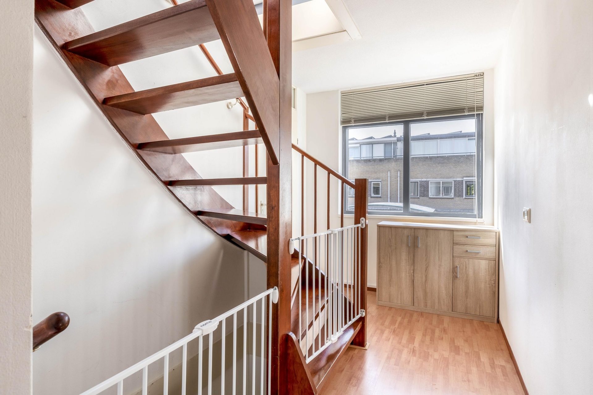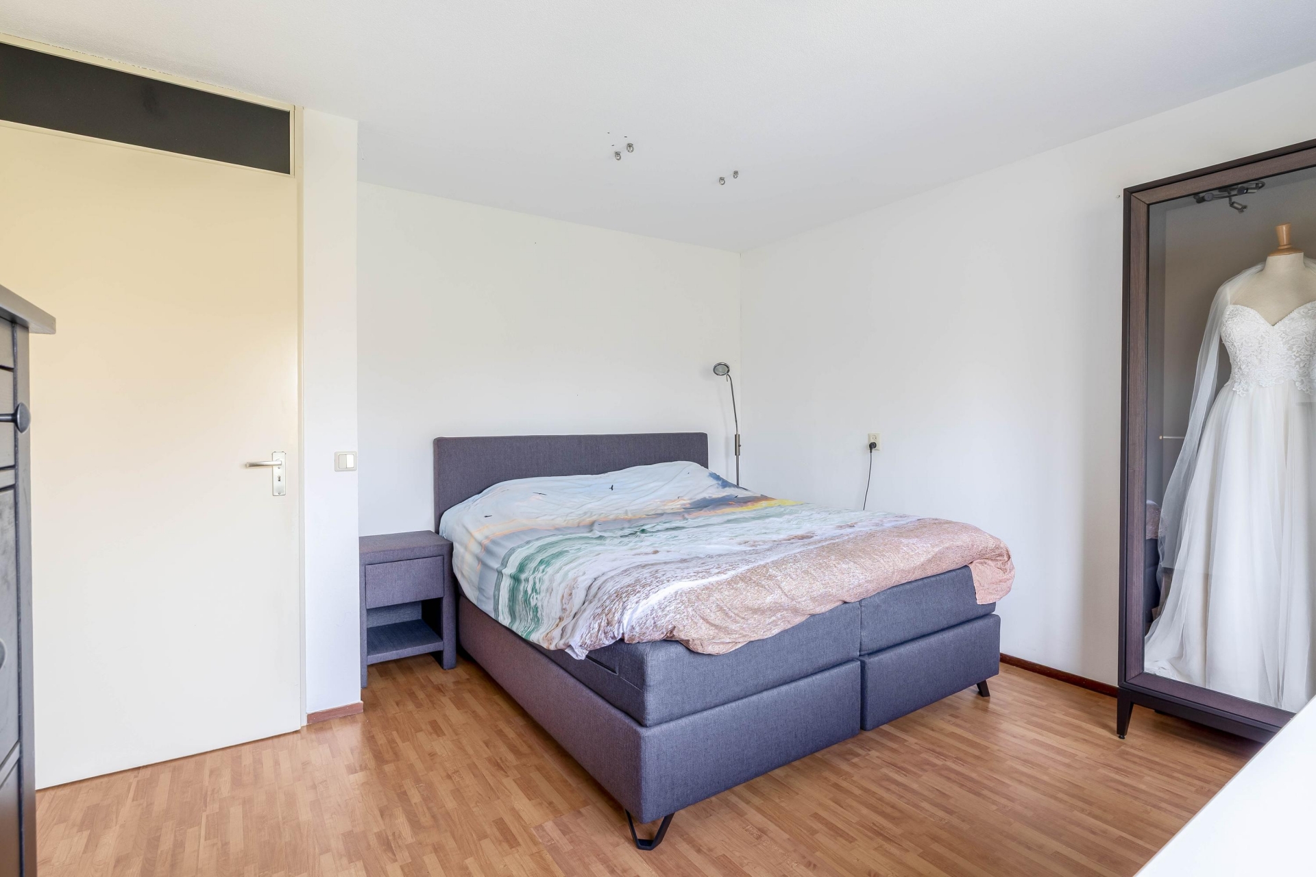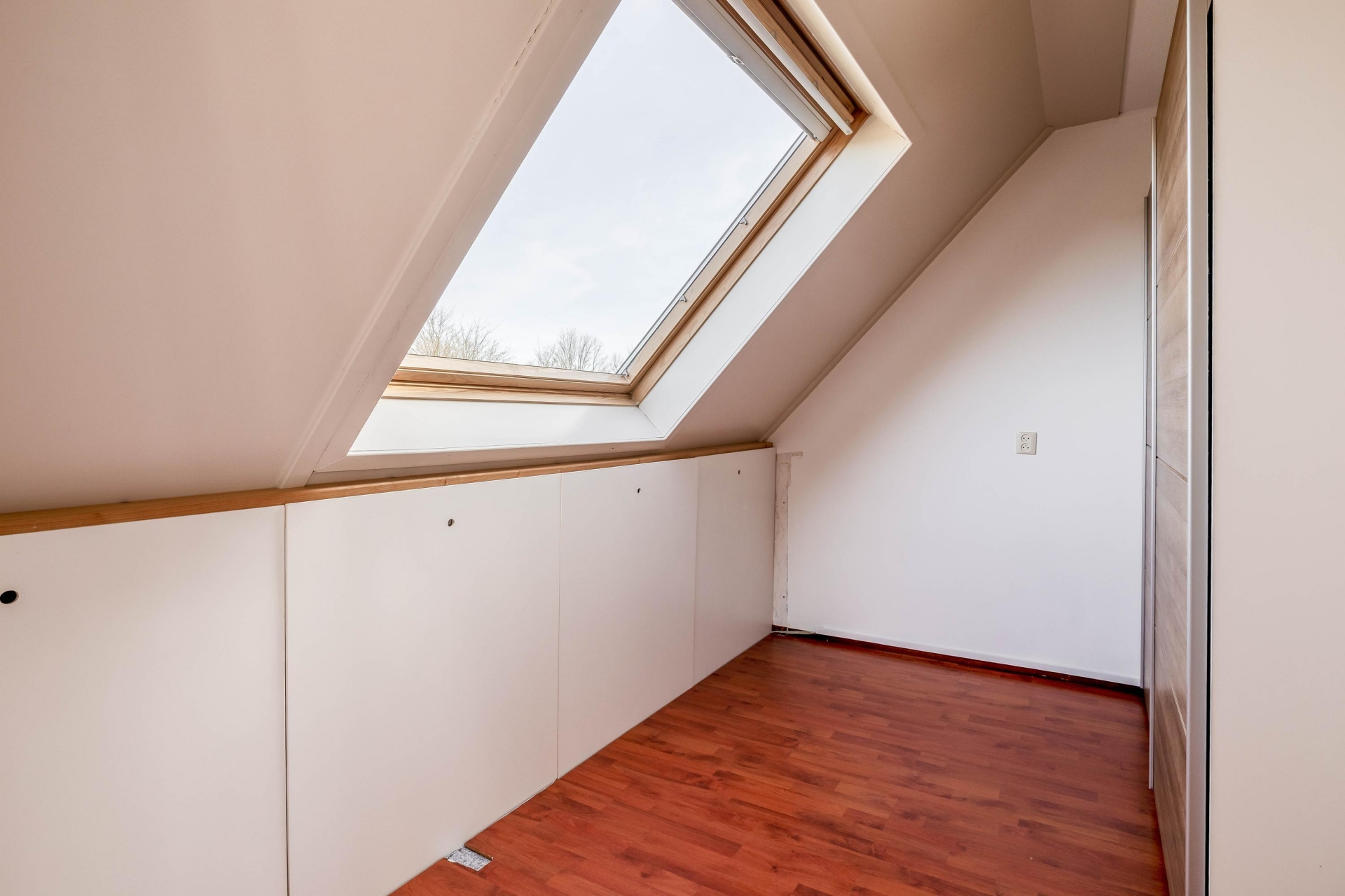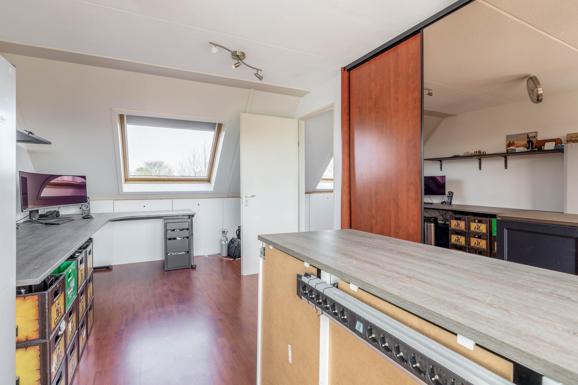 De voorzolder beschikt over een grote bergkast met aansluitingen voor wasapparatuur en de opstelling van de cv-ketel (2022). Via een tussenkamer, ideaal als thuiswerkplek, bereik je de royale vierde slaapkamer met bergruimte, een Velux dakraam en toegang tot het dakterras.
