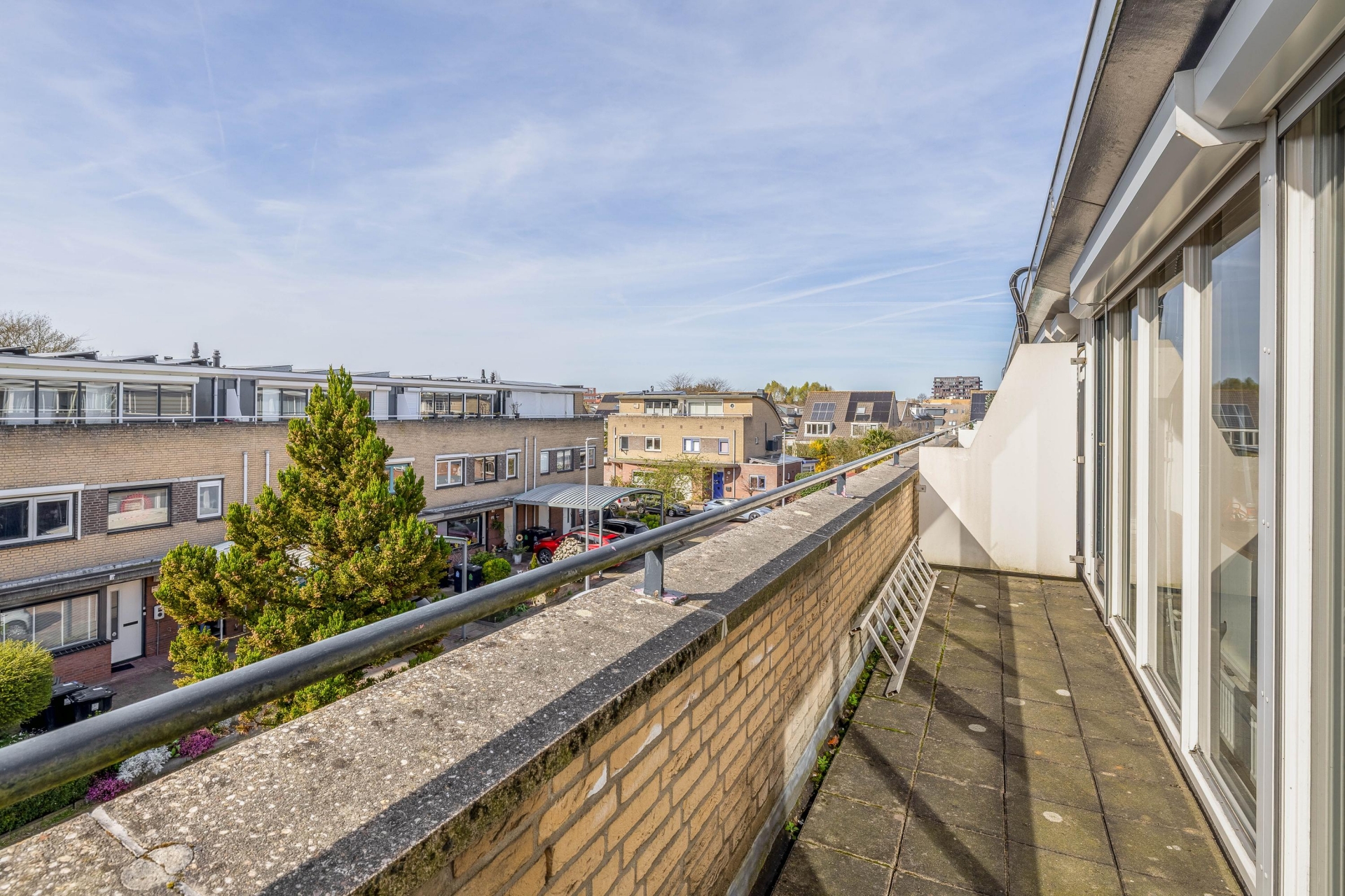 Het dakterras strekt zich uit over de volledige breedte van de woning en biedt volop zon, privacy en een prachtig uitzicht.