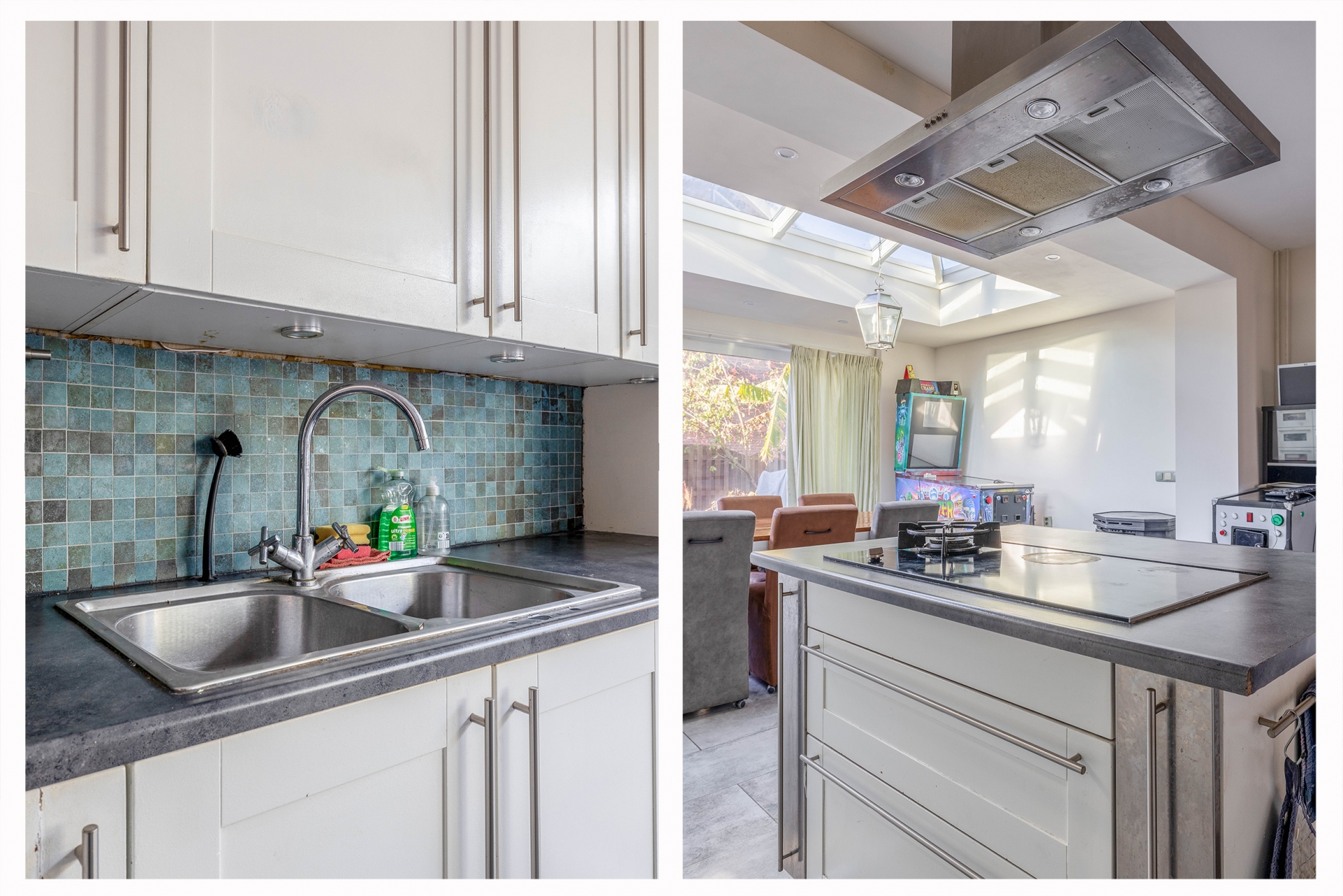 De keuken is van alle gemakken voorzien en heeft veel werk- en opbergruimte. Een echte plek voor wie graag kookt of gezellig lang tafelt. De zichtlijnen vanuit de keuken naar zowel de woonkamer als de tuin zorgen voor een open sfeer waarin je altijd in contact blijft met je gezelschap.